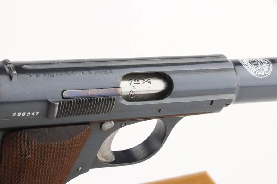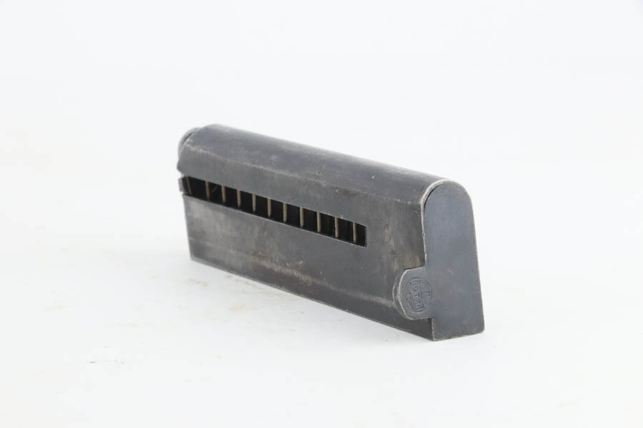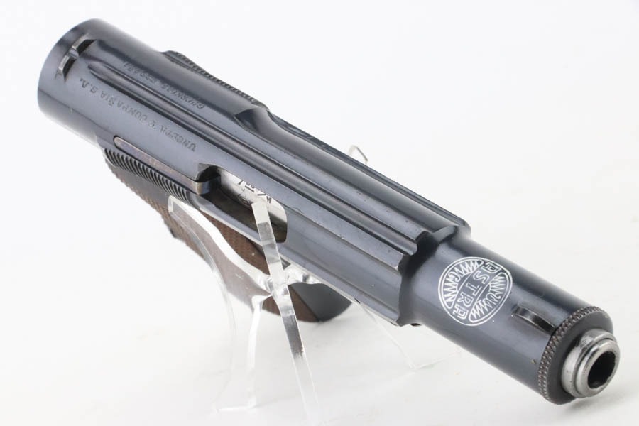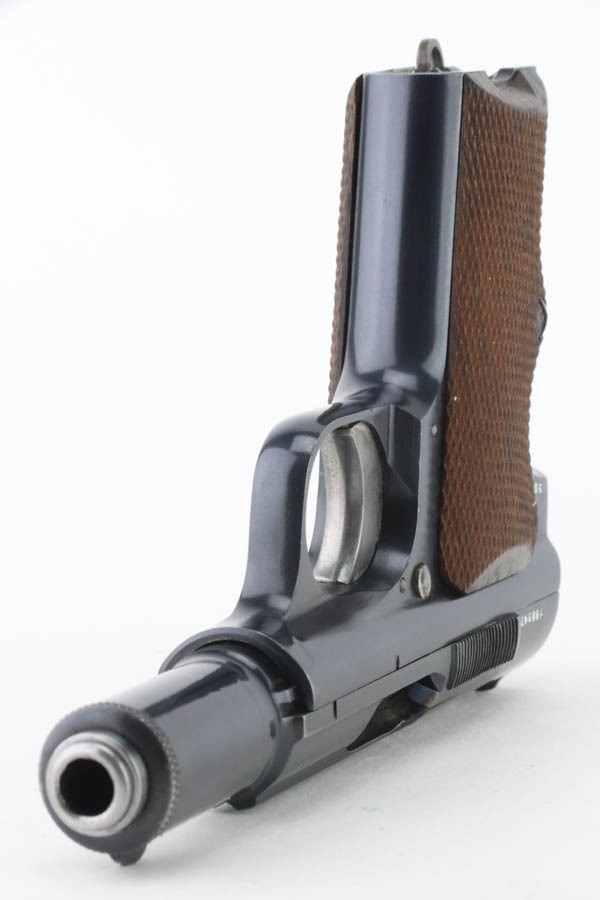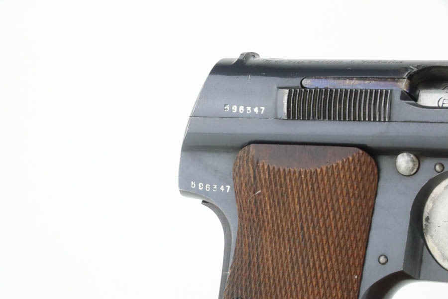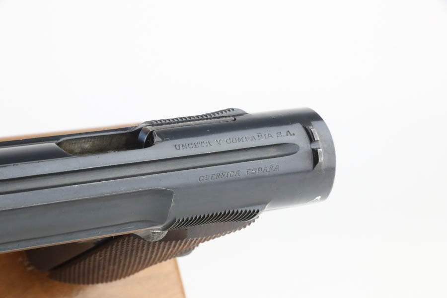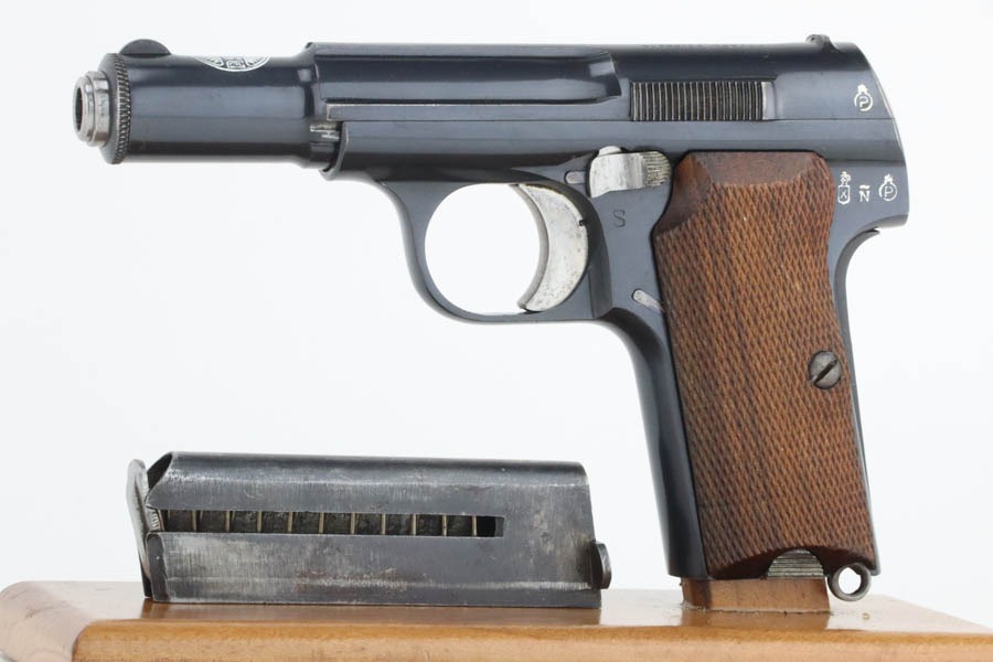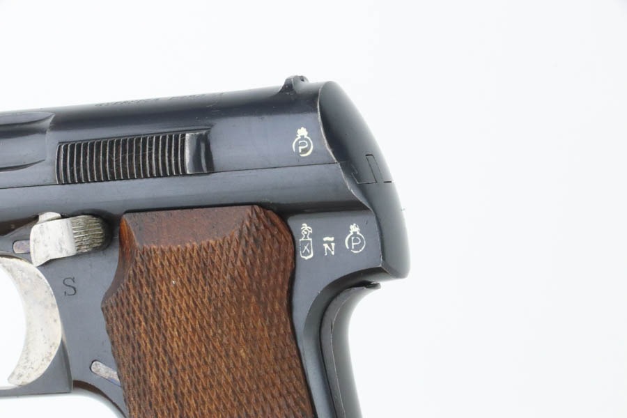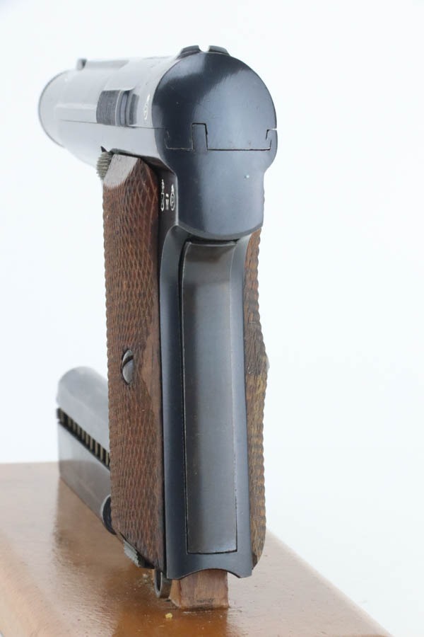 10/9/24 – This is a Spanish Astra 300 made for the Nazis in 1943. All matching numbers. There were two caliber guns for the Nazi Astra 300s. 9mm kurz and 7.65mm. Of these, 63,000 were 9mm and 22,390 were 7.65mm making this gun the rarer of the two. The 7.65mm guns did not have Waffenamts like the 9mms did. The Nazi contract 7.65mm guns were between SNs 540901-615822. This pistol falls between that range and was delivered to the Nazis on 2/24/41 according to Jan Stills “Axis Pistols”. It has been said the Luftwaffe preferred the Astra 300 due to their small size as the cockpits in fighter planes were very tight. The gun has retained essentially all of its finish with very little sign of wear or use. Fitted with minty wood grips and comes with a proper magazine. Excellent, shiny bore.