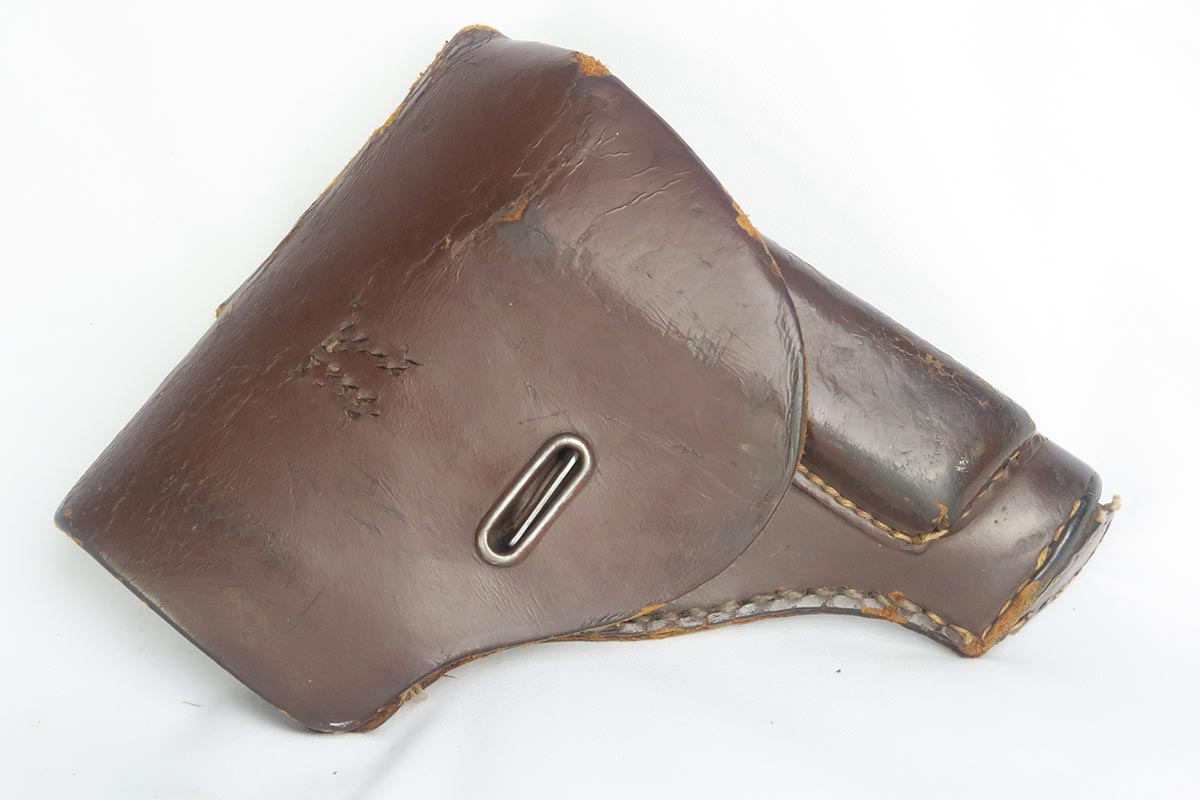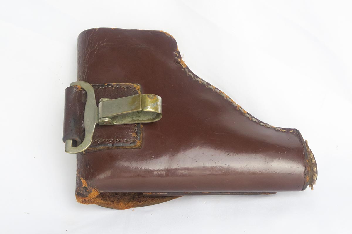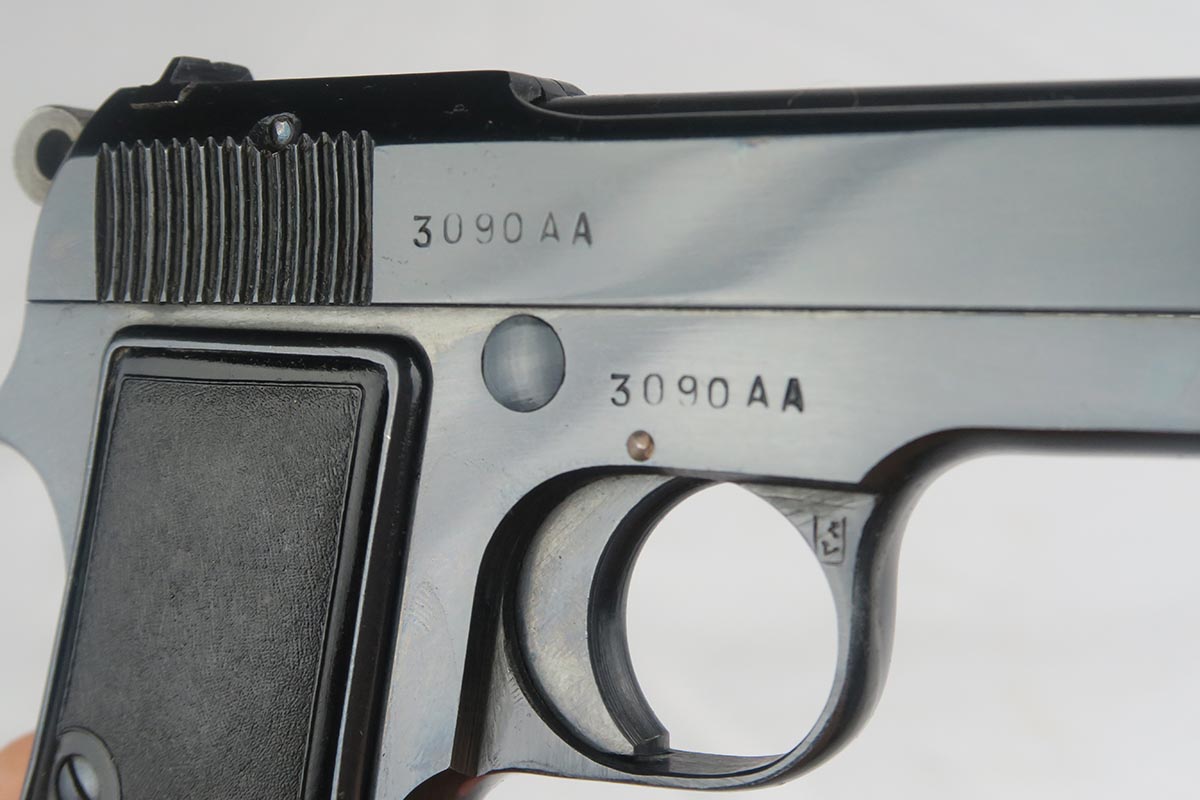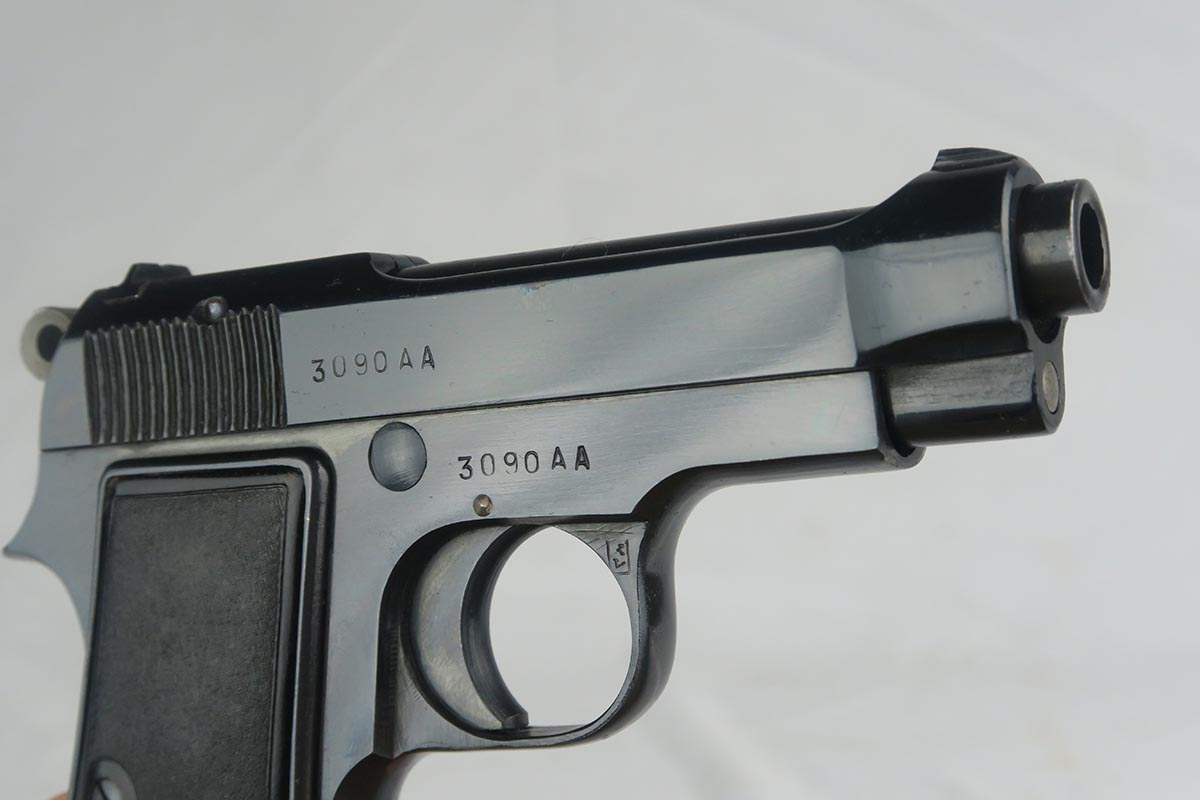 9/28/17 – This is a spectacular example of Nazi procurement Beretta 1934 in 380acp(9mm Kurz), that is stone mint with 99.9% of the original finish remaining, with a hint of wear on the left forward slide from the slide being racked. It is an all matching gun with mirror bore, and excellent grips. All the markings are sharp. Dated 1943. Only the guns with AA or BB suffix serial numbers were identified as being actually procured by the German Army and this is an earlier AA suffix gun. Complete rig with 2 mags and an original holster that is missing a closure strap and some stitching at the toe – both easily repairable. A non-upgradeable example of a desirable Axis pistol.