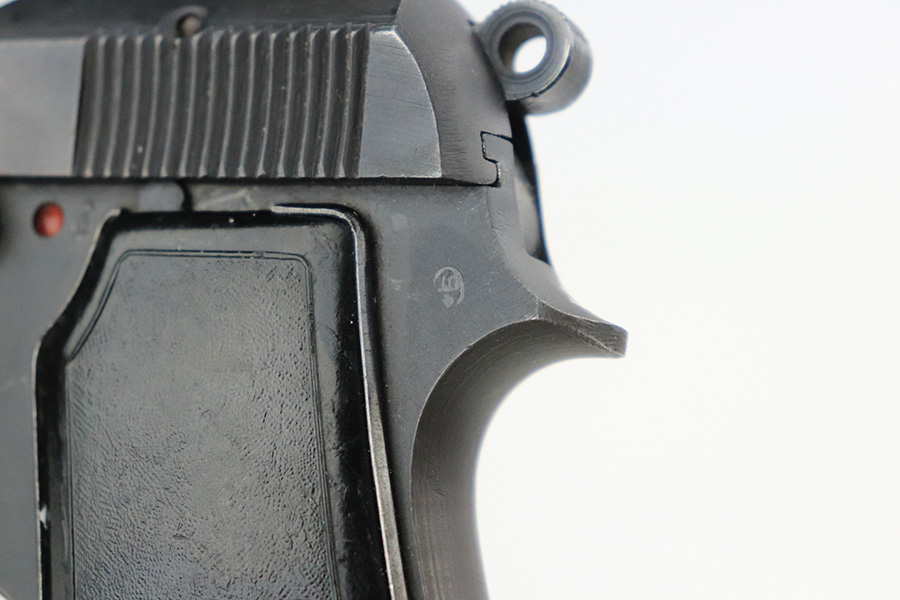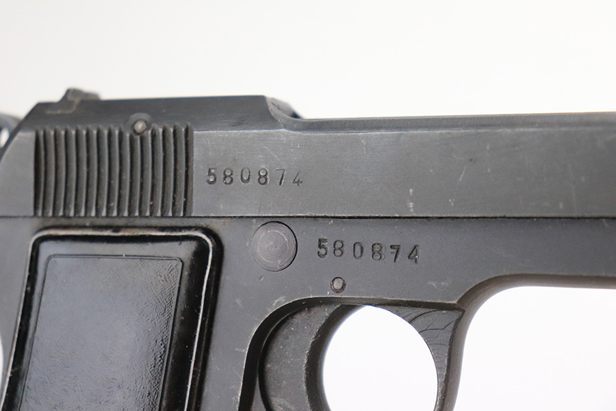 6/16/22 – This is a mint example of a Beretta Model 1935 issued to the Nazi military in 1944. It is all matching and has the proper “4UT” Nazi military acceptance proof on the left side of the tang. It has retained virtually all of its original dull military finish. There are just hints of wear on the high edges and some very light scuffs here and there. Excellent black bakelite grips and one proper magazine. Mint bore.