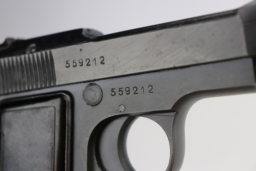 7/6/21 – This is a mint example of a Beretta Model 1935 issued to the Nazi military in 1944. The gun is all matching and has the proper Nazi “4UT” proof on the tang. It is in mint condition, retaining virtually all of its finish. There are just some areas of light pin-pricking here and there. Comes with excellent grips and a period-correct magazine. The bore has strong rifling with some areas of minor freckling.