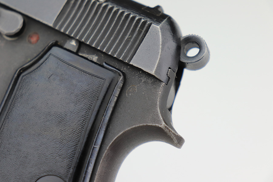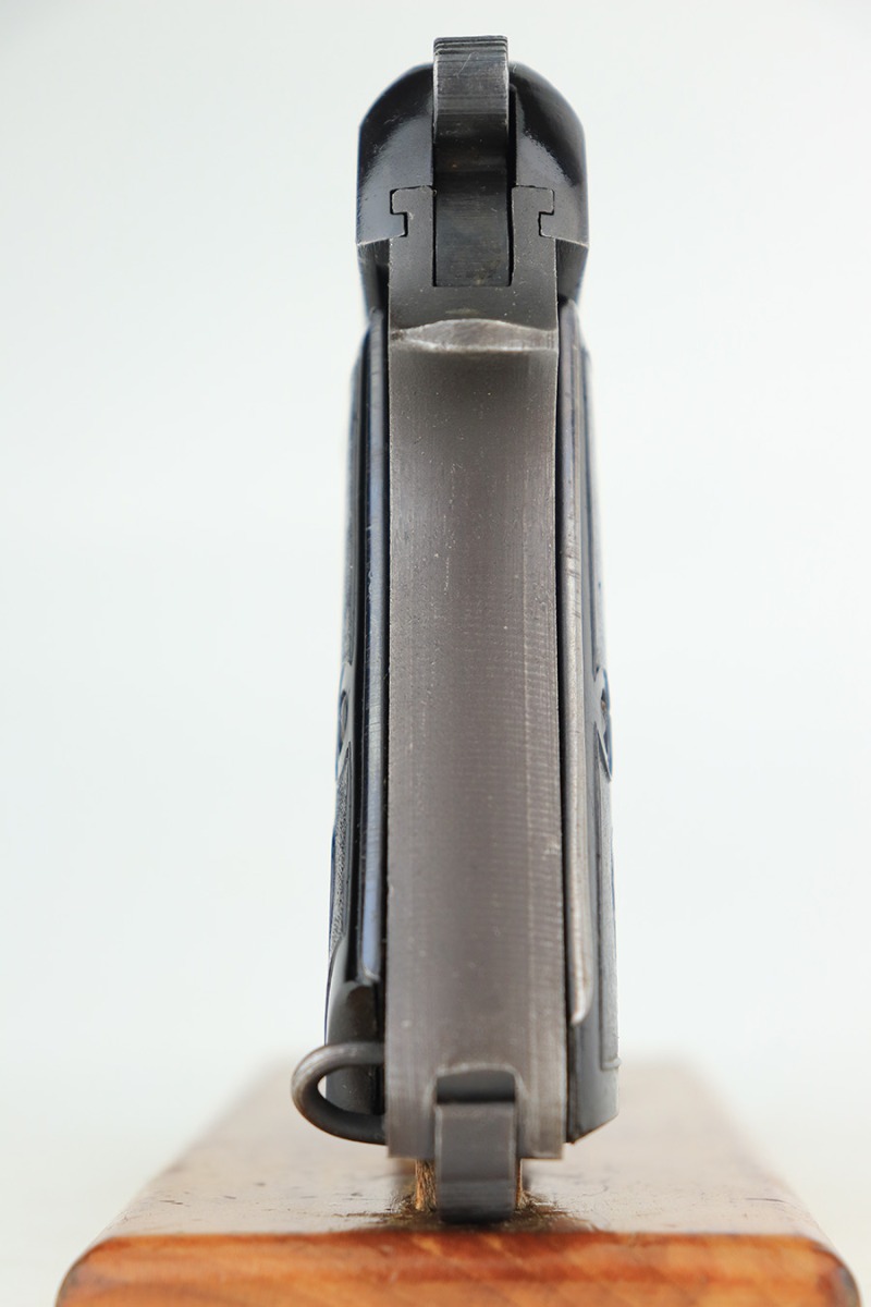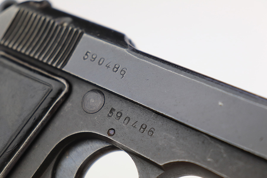 3/15/23 – This is a mint example of a Beretta Model 1935 manufactured in 1944. It is all matching and has a “4UT” proof on the tang, indicating it was issued to the Nazi military. It has retained virtually all of its original wartime finish with just hints of wear on some of the high edges. Excellent black bakelite grips. Comes with one proper magazine. Minty bore.