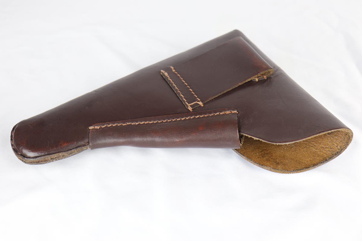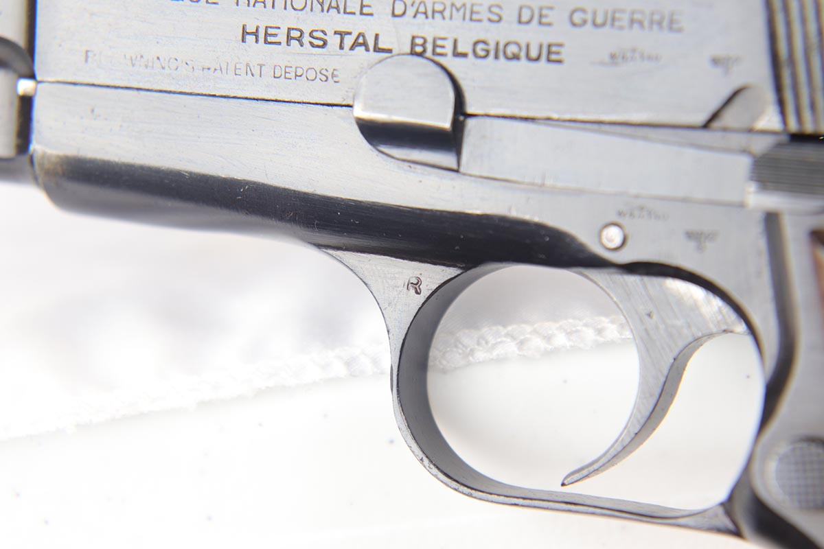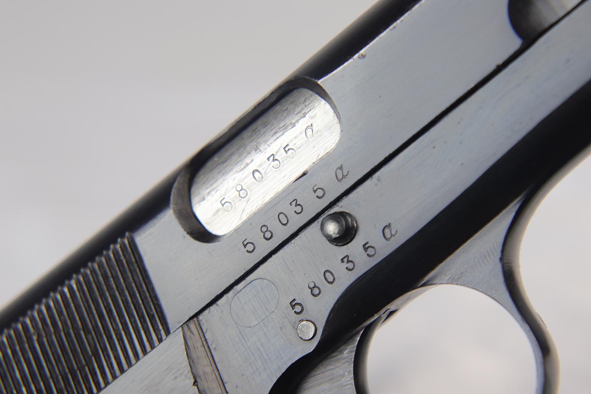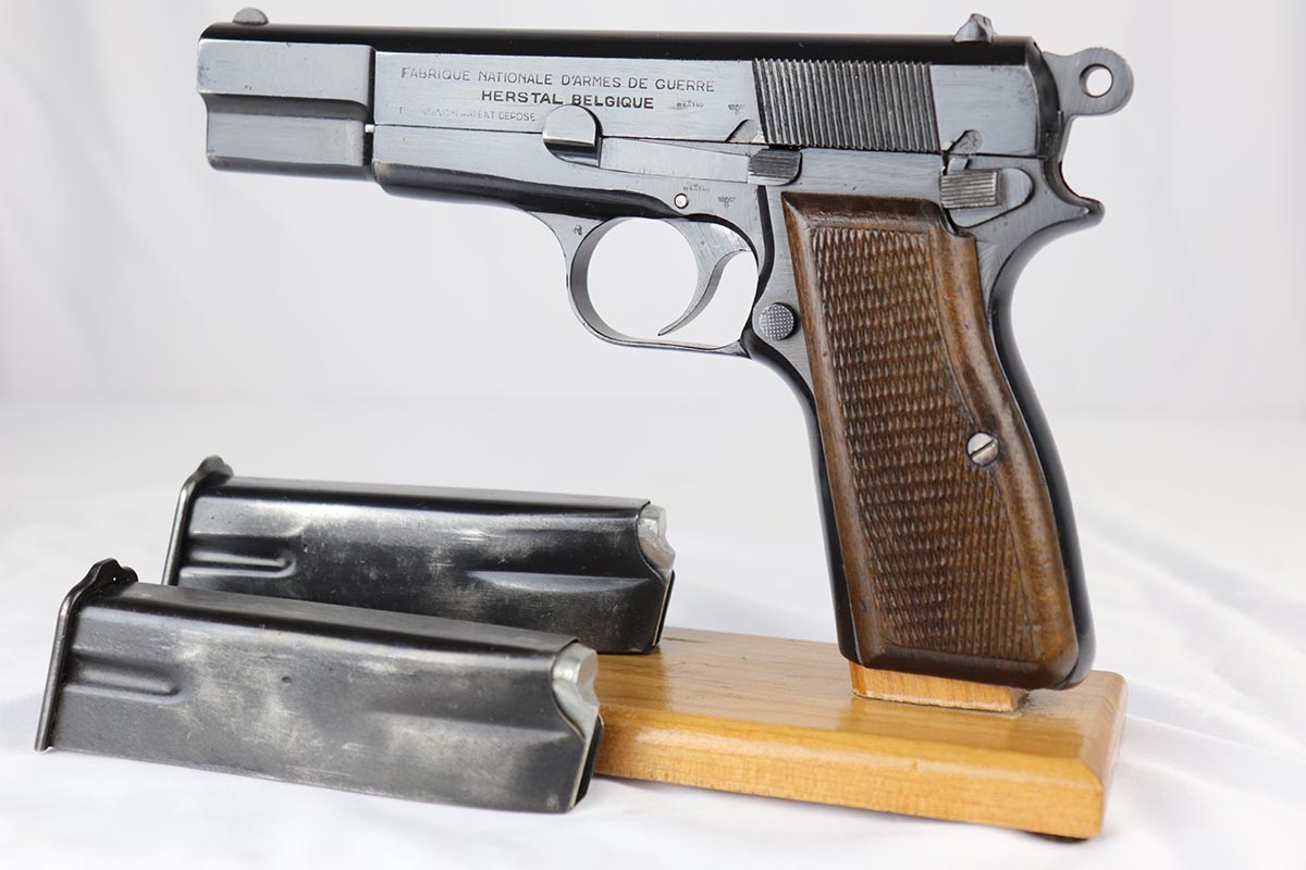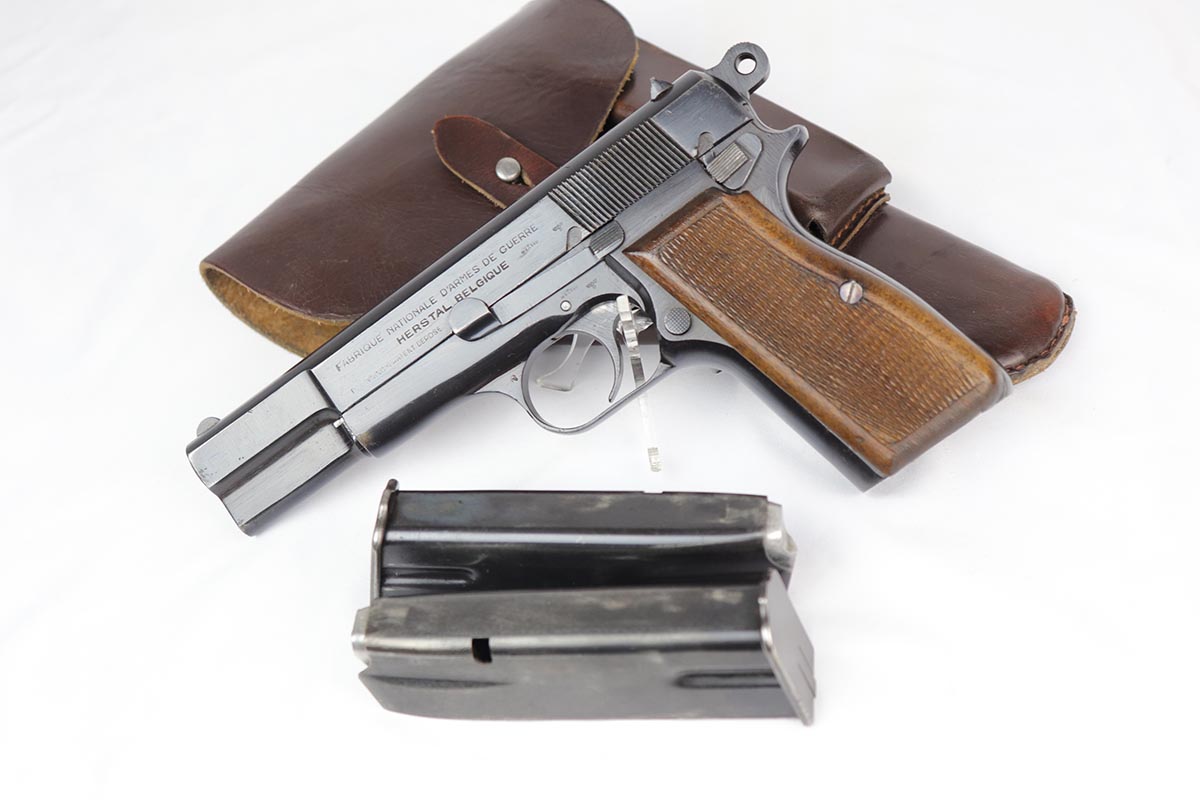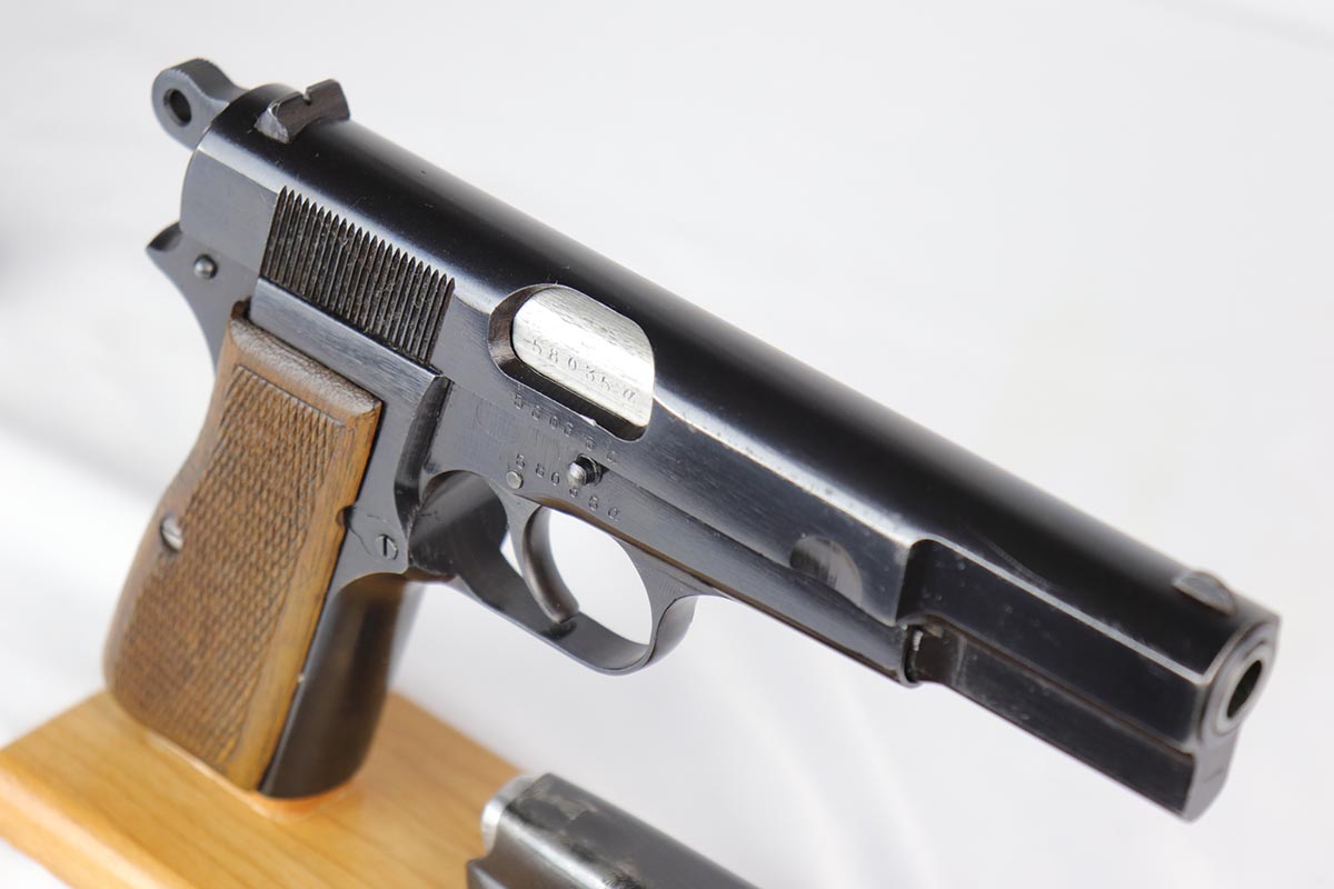 10/3/18 – This is a near-mint and complete Browning Hi Power rig from the mid-WW2 era, with two WaA140 magazines and a mint holster. This is a fixed sight variation with 99% original bluing, showing only minor muzzle wear and some light areas of patina. The grips and magazines are in fantastic condition with no notable flaws. Excellent bore. The pistol comes with a minty brown holster, which is maker marked and ’44 dated with clear internal waffen proof.