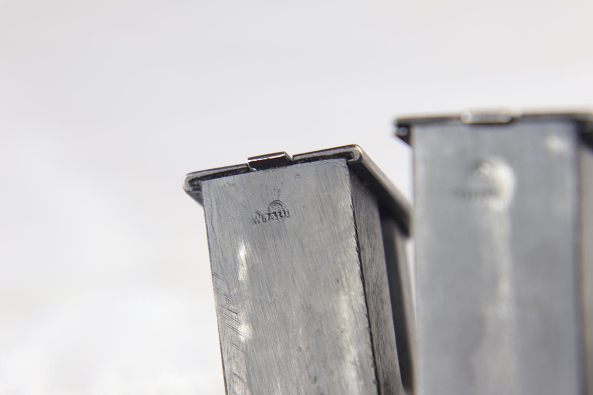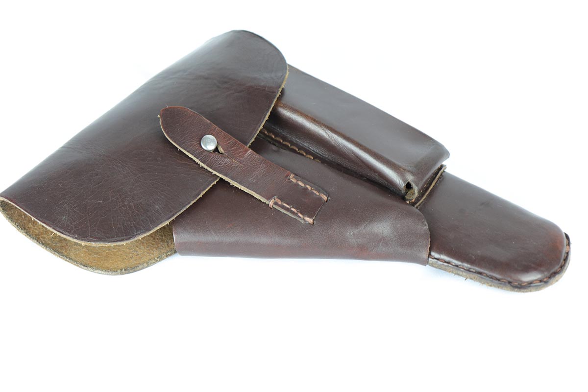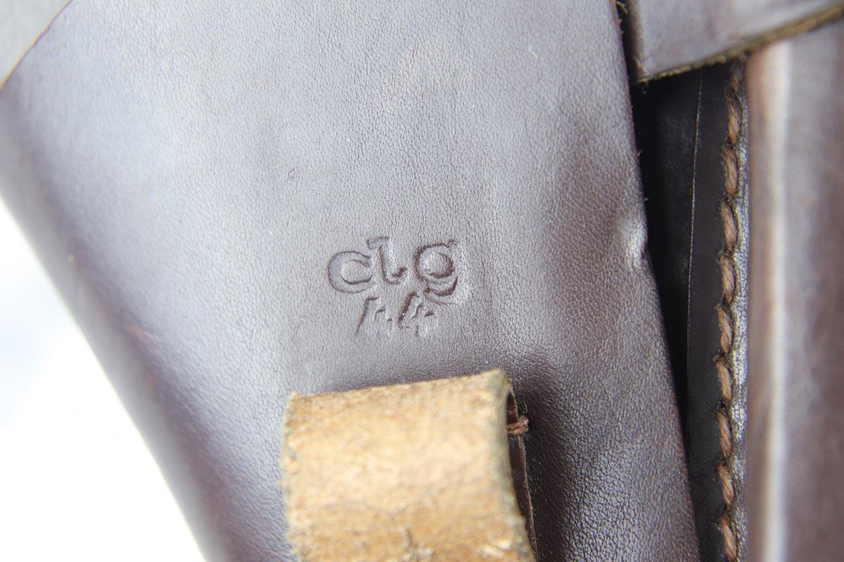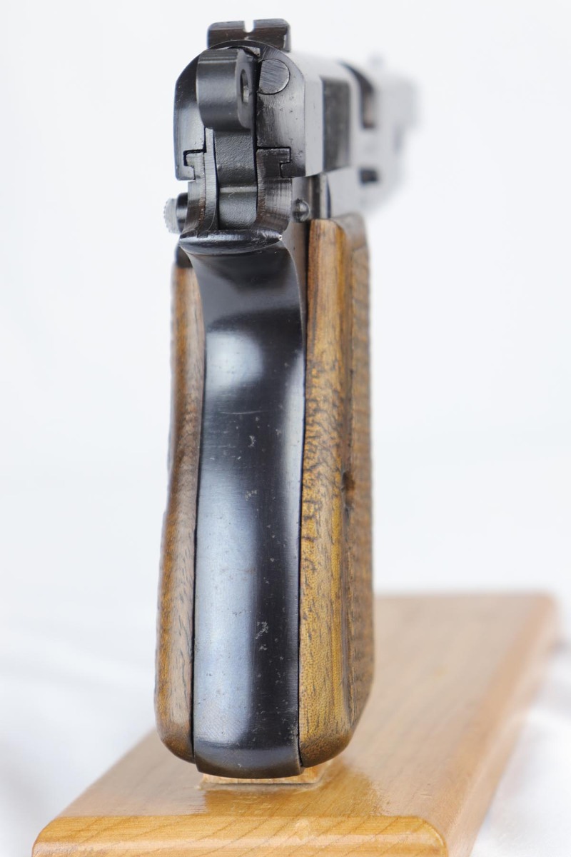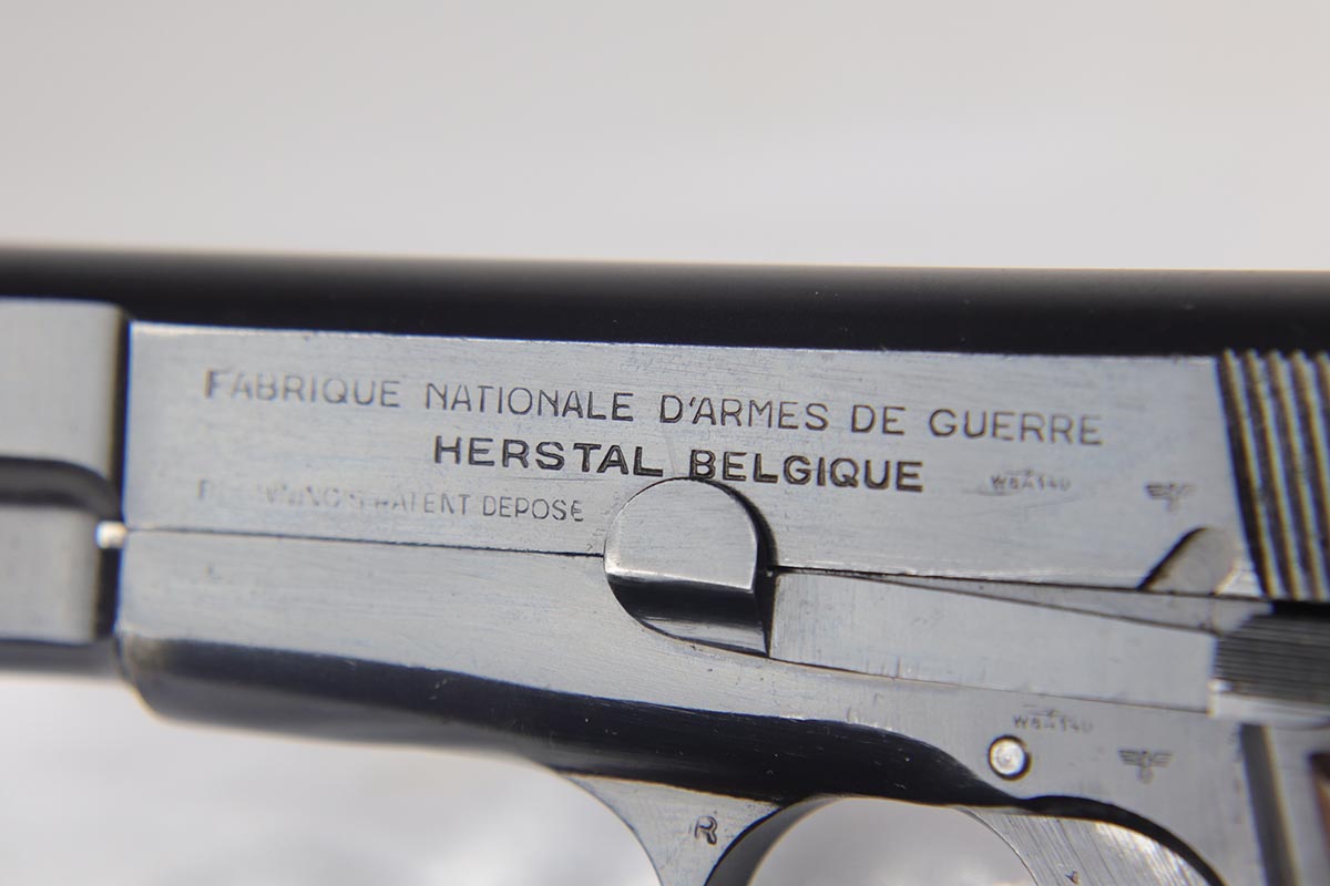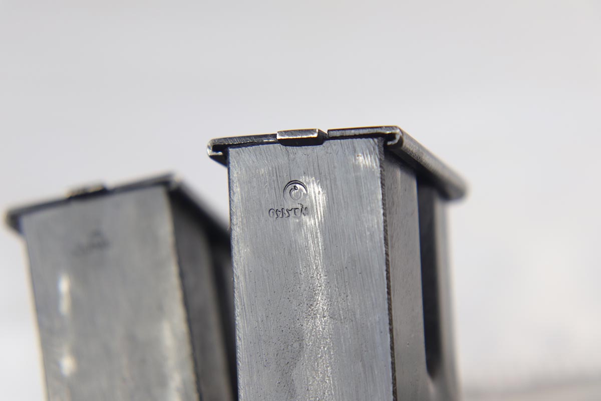 10/3/18 – This is a near-mint and complete Browning Hi Power rig from the mid-WW2 era, with two WaA140 magazines and a mint holster. This is a fixed sight variation with 99% original bluing, showing only minor muzzle wear and some light areas of patina. The grips and magazines are in fantastic condition with no notable flaws. Excellent bore. The pistol comes with a minty brown holster, which is maker marked and ’44 dated with clear internal waffen proof.