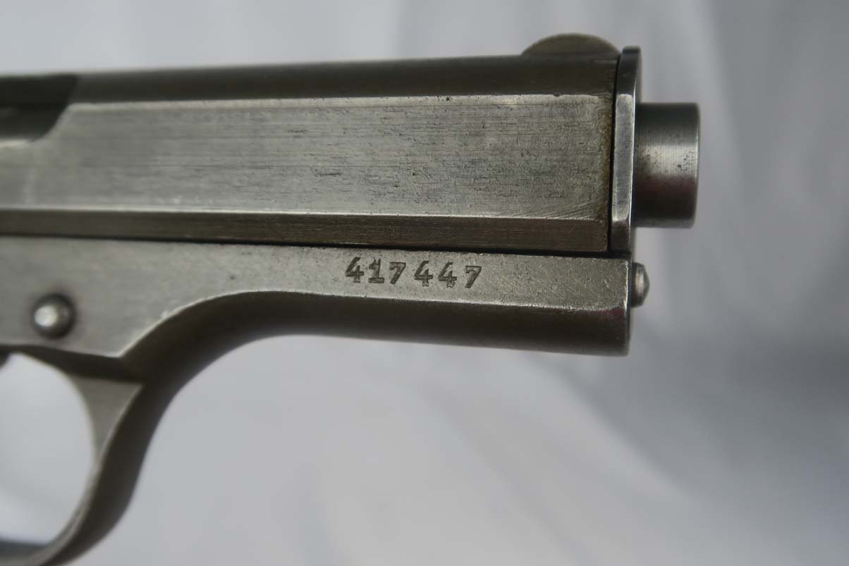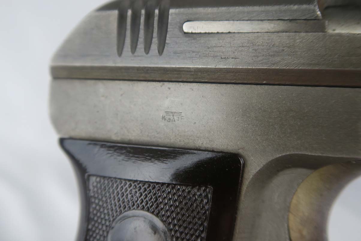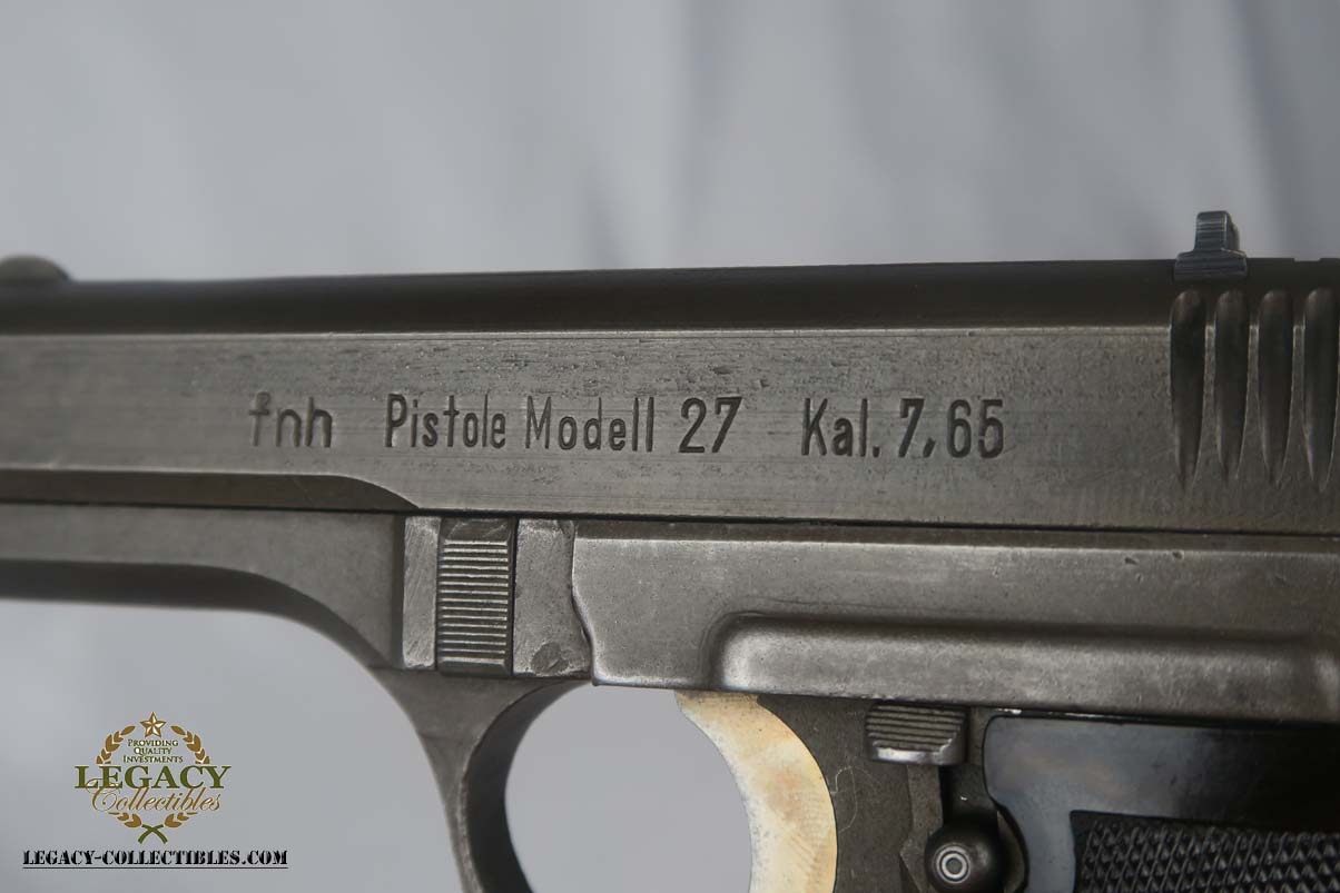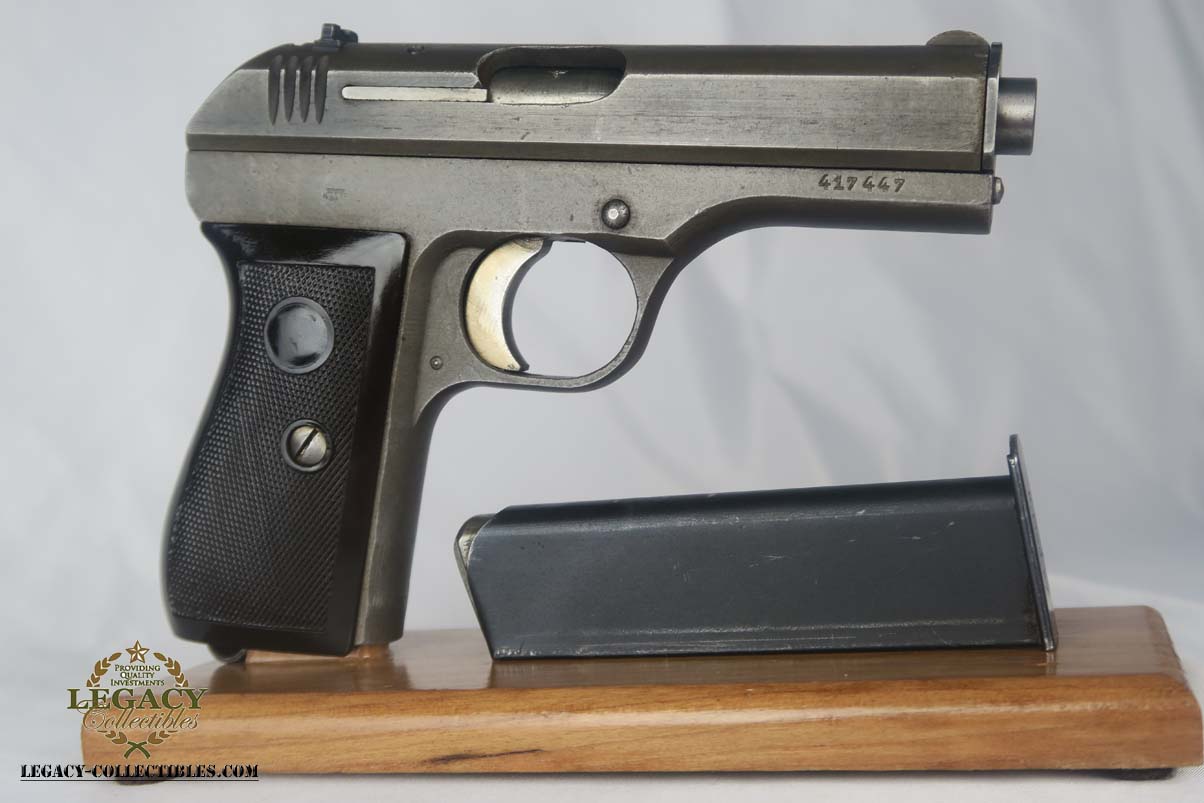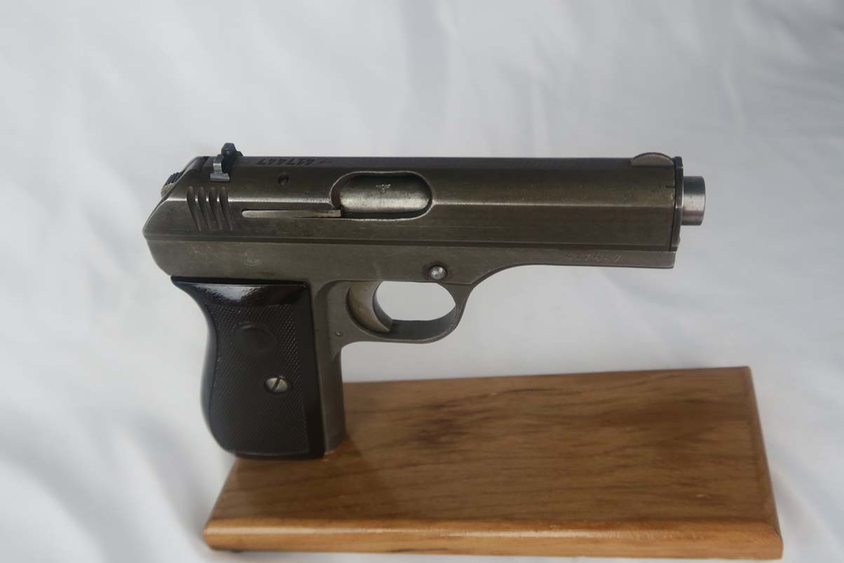 6/1/17 – This is a minty Nazi CZ-27, with phosphate finish that looks as if it just came out of the factory.  This end of war pistol is waffen marked on the right side of the frame, and has a rough overall finish as these guns were being rushed out of the factory in 1945.  The grip, bore and magazine are all minty, as well.