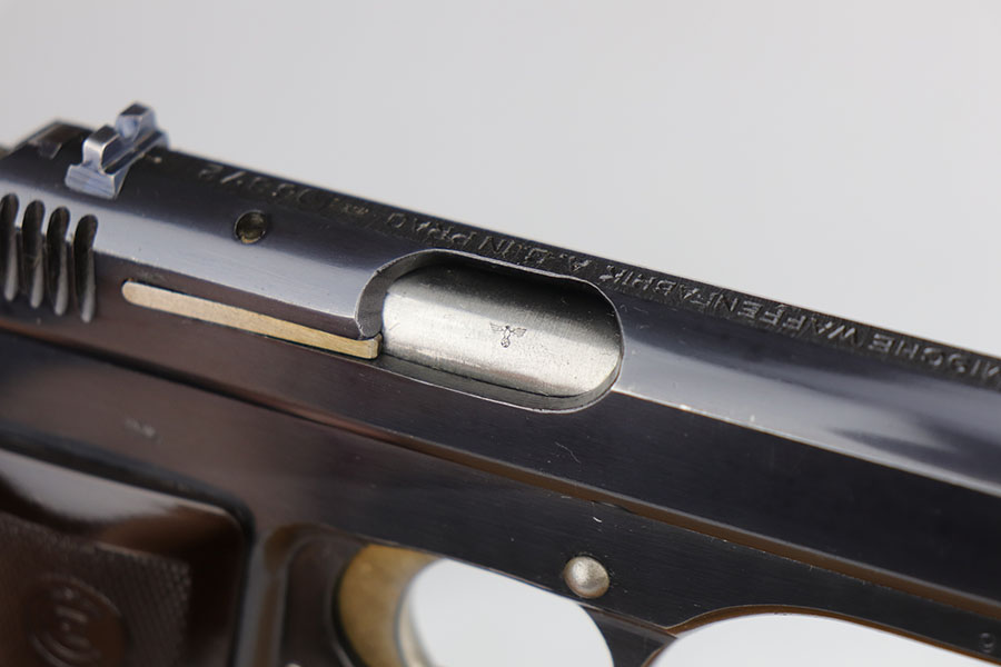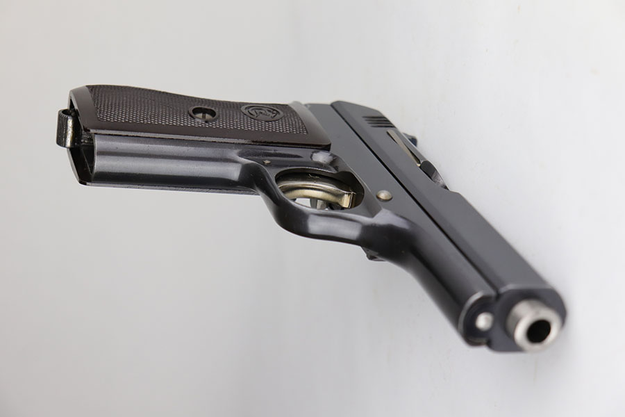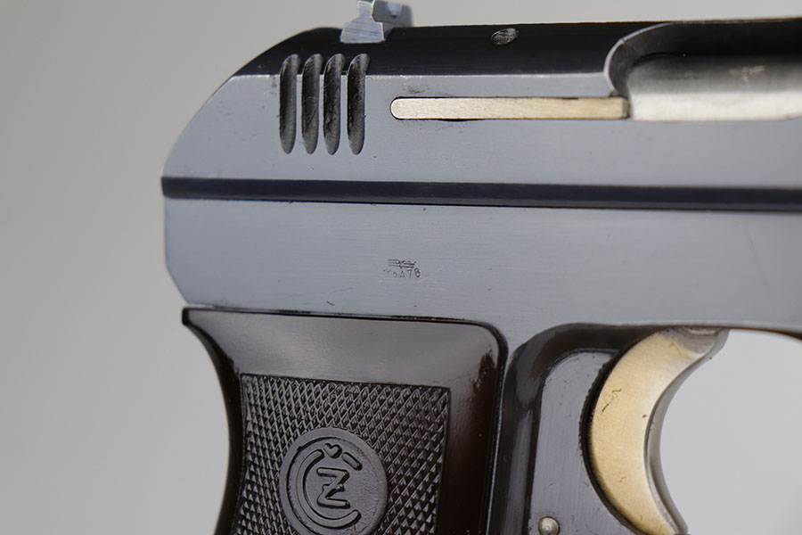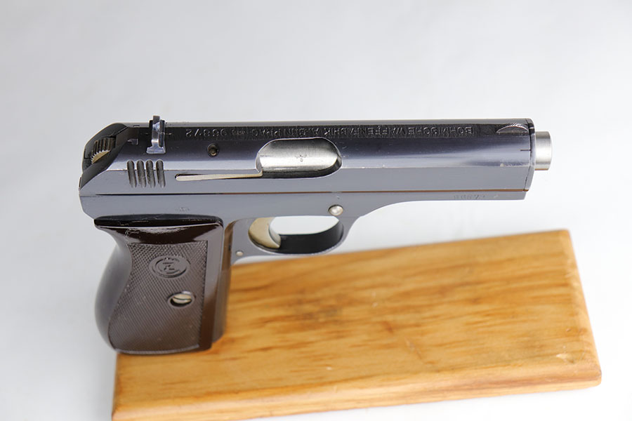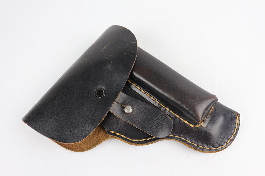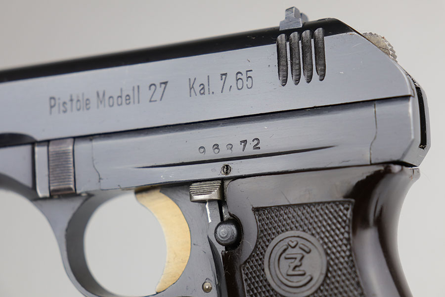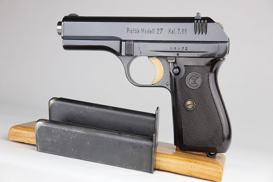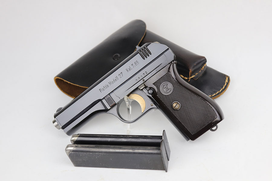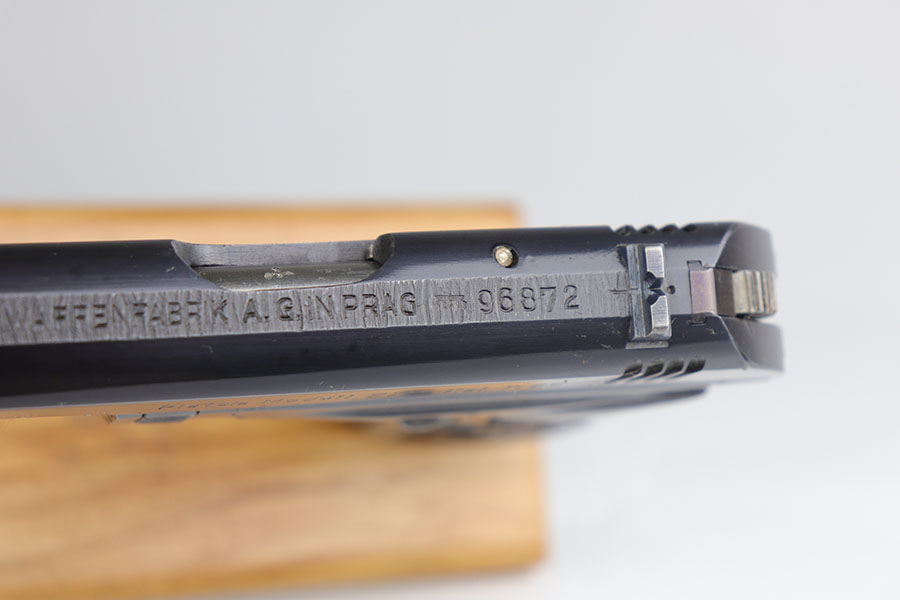 7/14/20 – This is a mint and complete CZ Model 27 rig. It’s matching and original with 99% high-polish blue remaining. There’s just a few minuscule dots of wear on the pistol but hardly looks used otherwise. Clear waffenamt on right side of frame. Minty bore and grip. Rig includes a total of two correct magazines. The holster is also mint and has an ‘oub’ maker mark.