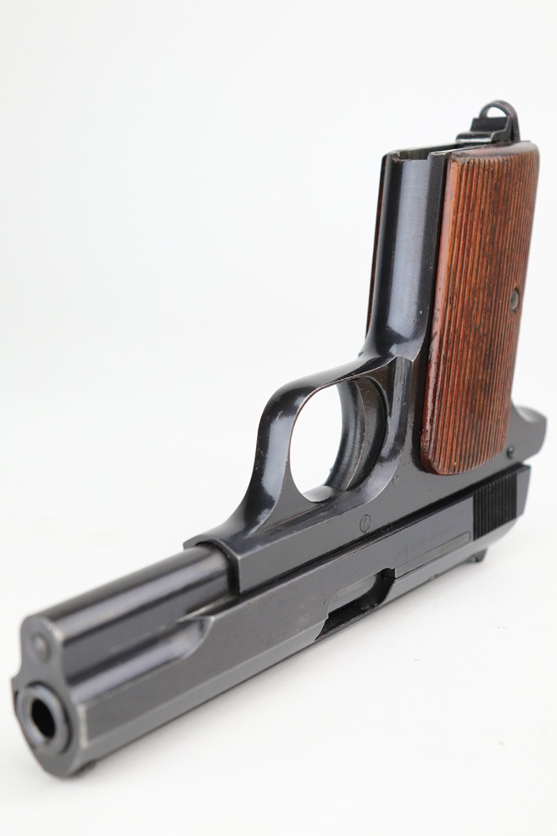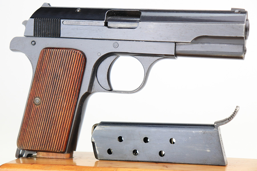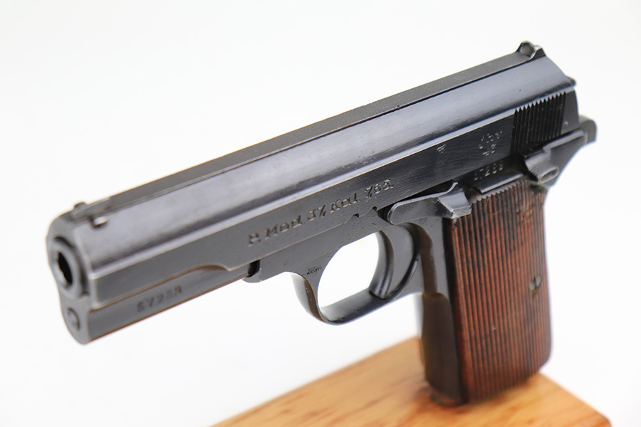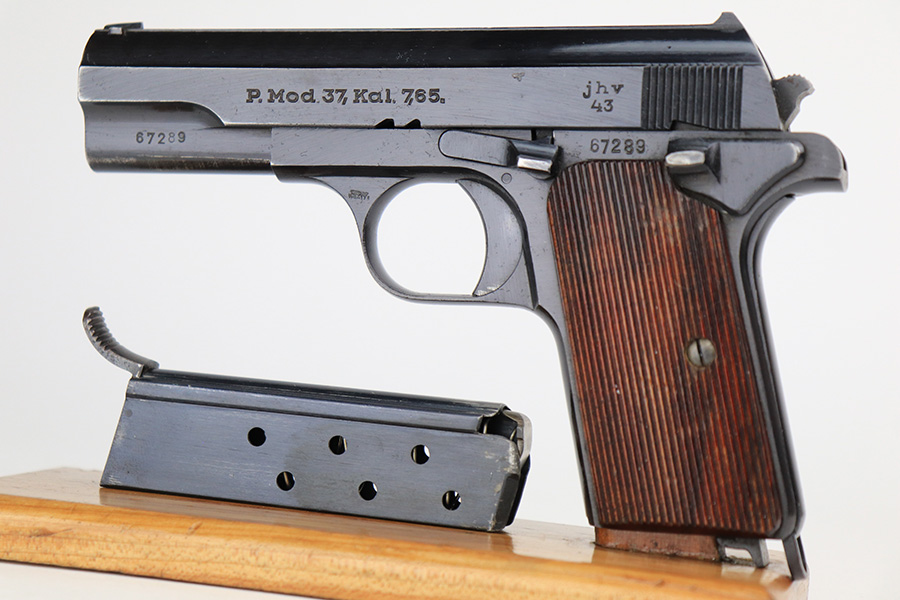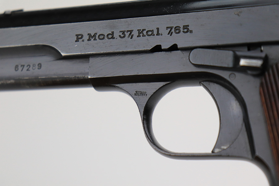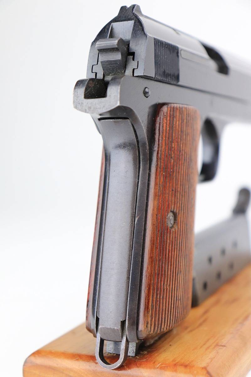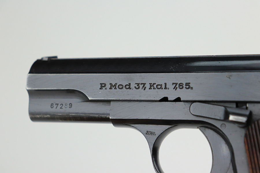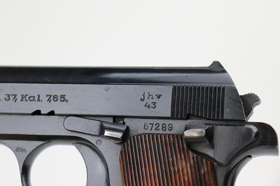 5/2/22 – This is a mint example of a Femaru Model 37 issued to the Luftwaffe in 1943. The gun is all matching, has the proper Waffen military acceptance proof on the left side of the trigger guard, and comes with one original matching-numbered magazine. It has retained almost all of its original bluing with just a hint of wear around the muzzle and one small area of very light wear on the right side of the slide. Comes with excellent period-correct wood grips – a few tiny bruises on the left side. Mint bore.