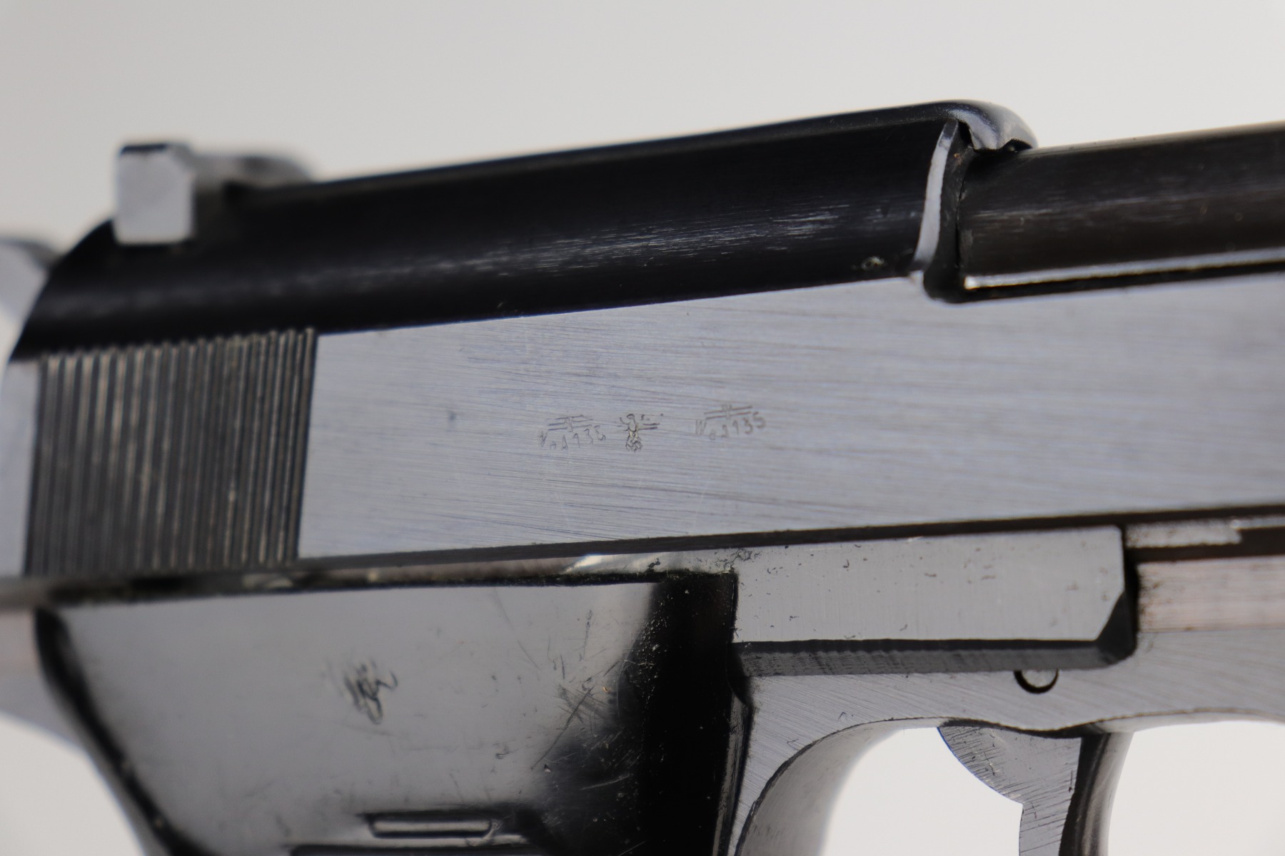 5/8/23 – This is a mint example of a Mauser P.38 issued to the Nazi military in 1944. It is all matching and has the proper “Waffen 135” Nazi military proofs. The gun is mint, retaining around 99% of its original finish. It has nice, original grips but they have been shaved along the top. The bore is mint. De-cocker is fully functional. Beautiful example. NOTE: The photos show two magazines, but only ONE is included with this listing.