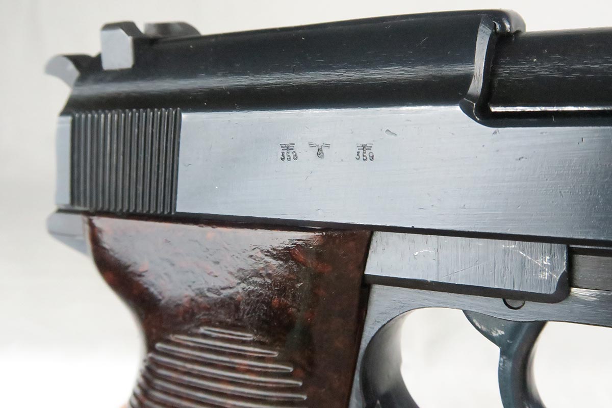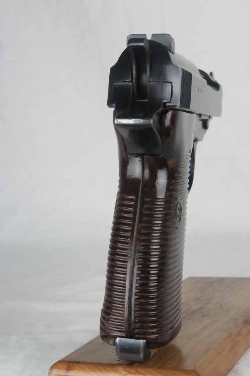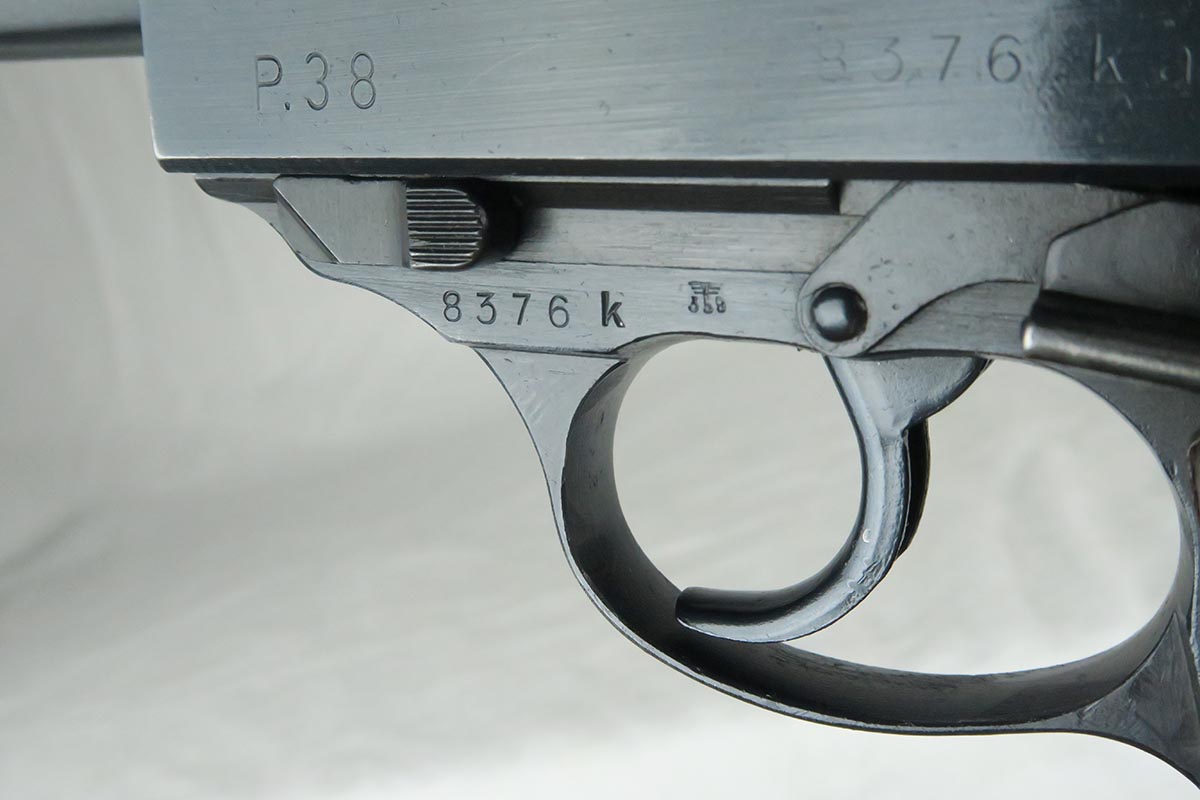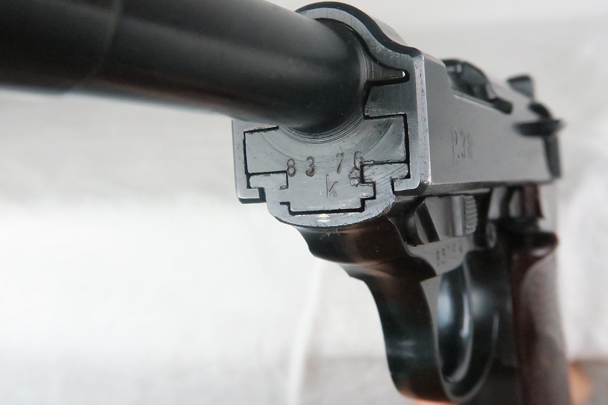 12/19/17 – This is a near-mint Walther P.38 from 1944. It is all matching and original, with 99+% military blue remaining. Very minor finish loss on the muzzle and high points of slide. Beautiful reddish Walther grips. Excellent bore.