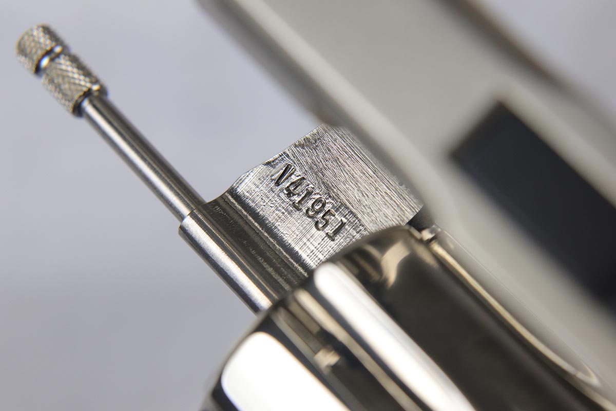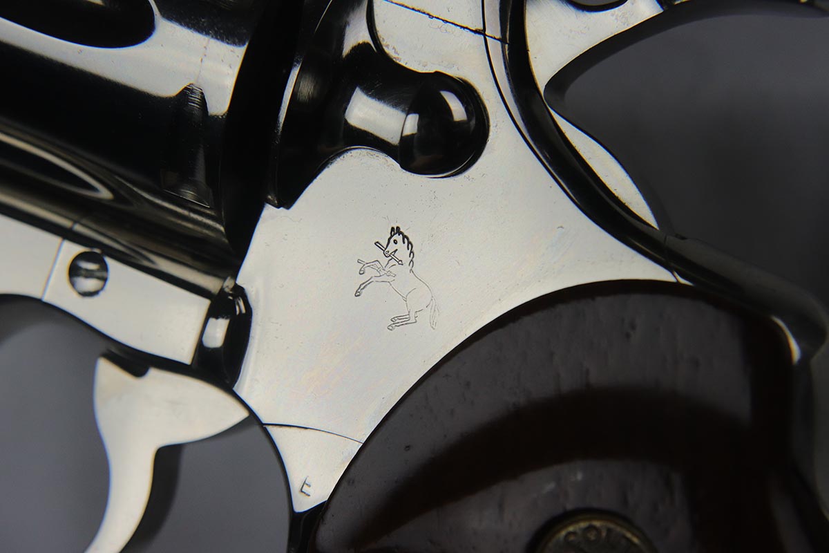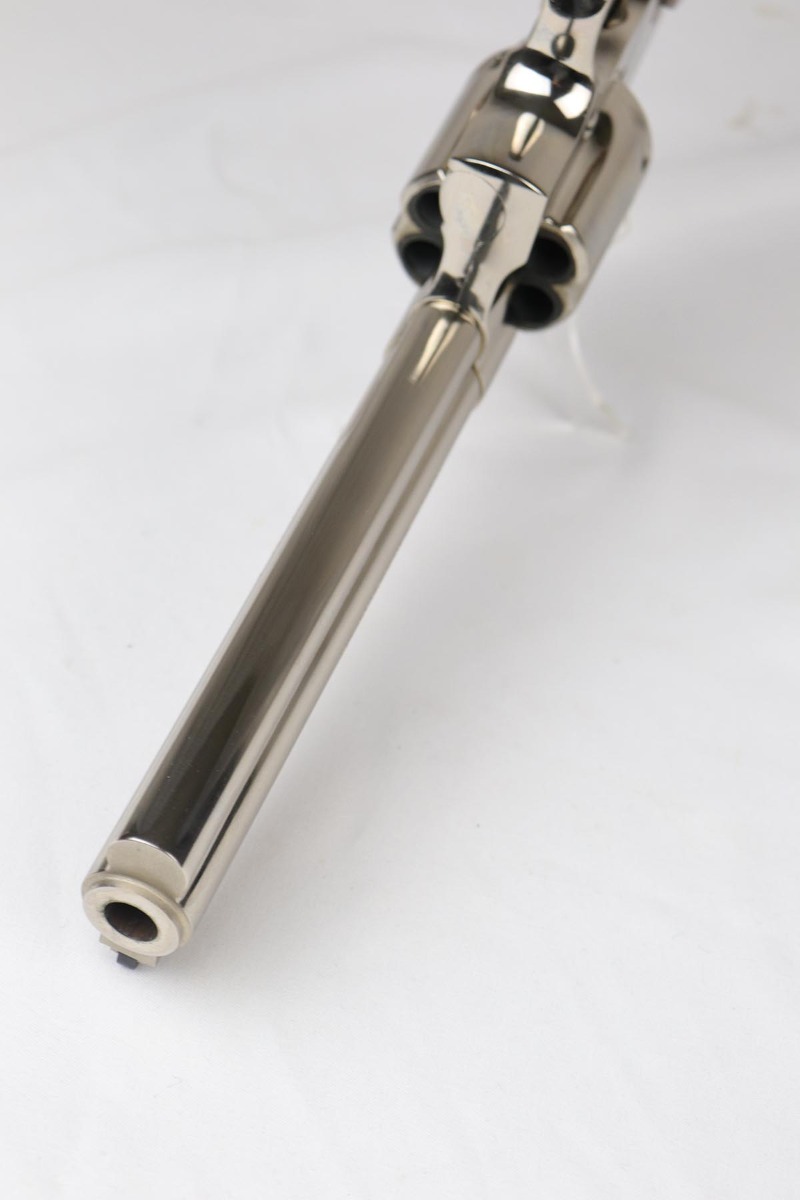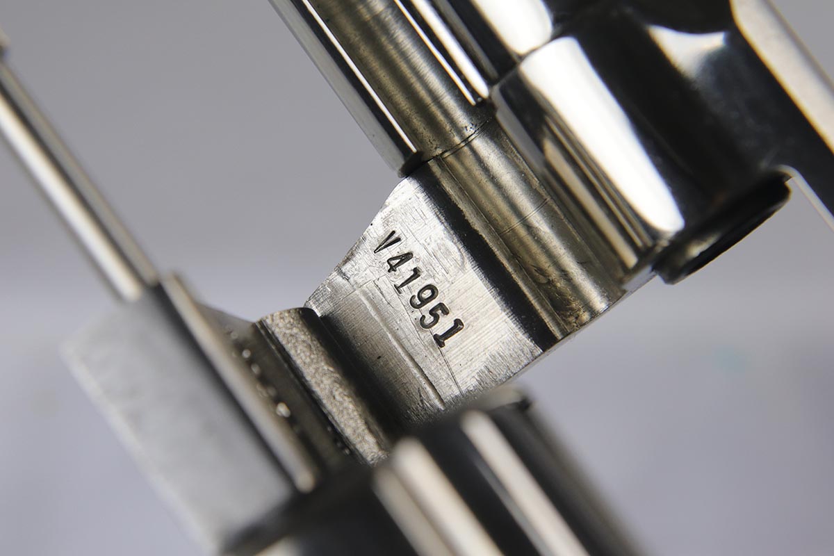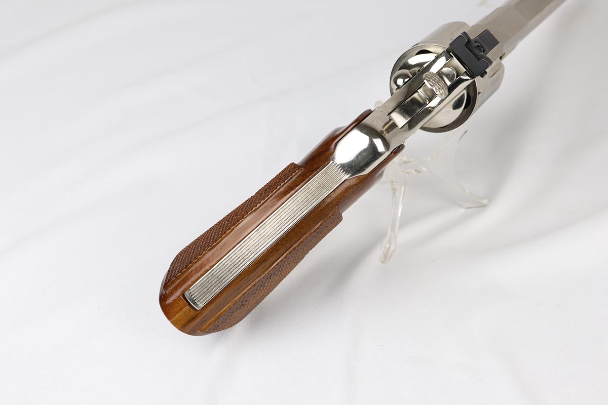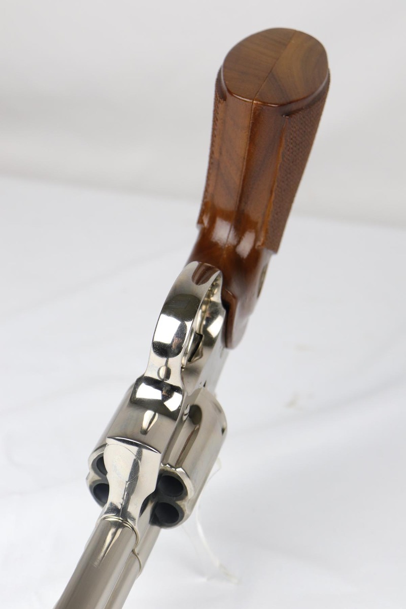 4/17/18 – This is a nearly mint condition Colt Python with original nickel finish rating at 99+%. Manufactured in 1979, this revolver has no notable flaws aside from the minor roll mark on cylinder. The bore and original wood grips are in minty condition. Good timing and mechanics. Comes with a spare set of Pachmayr rubber grips.