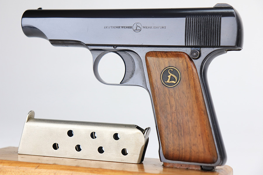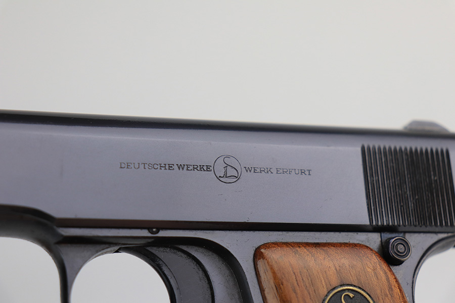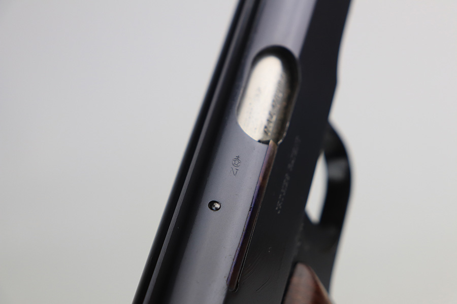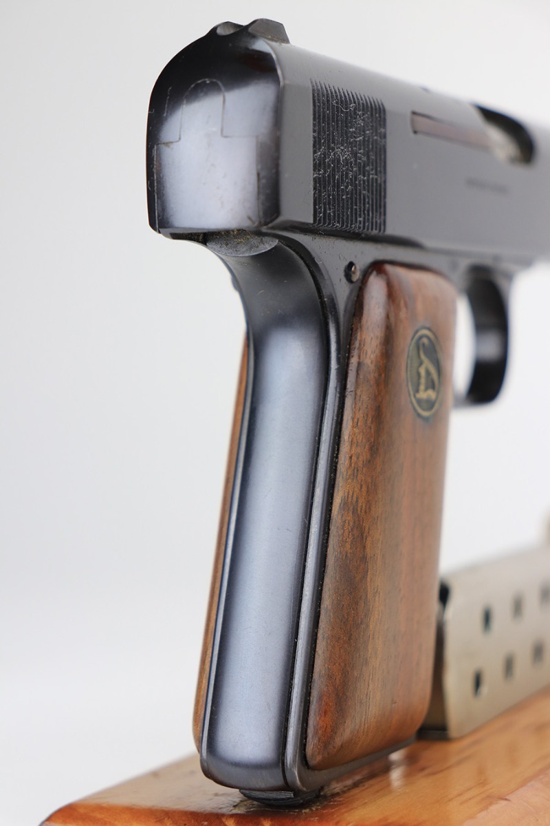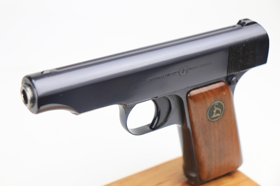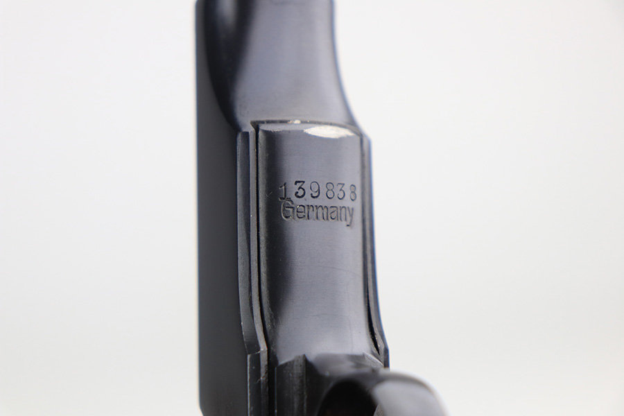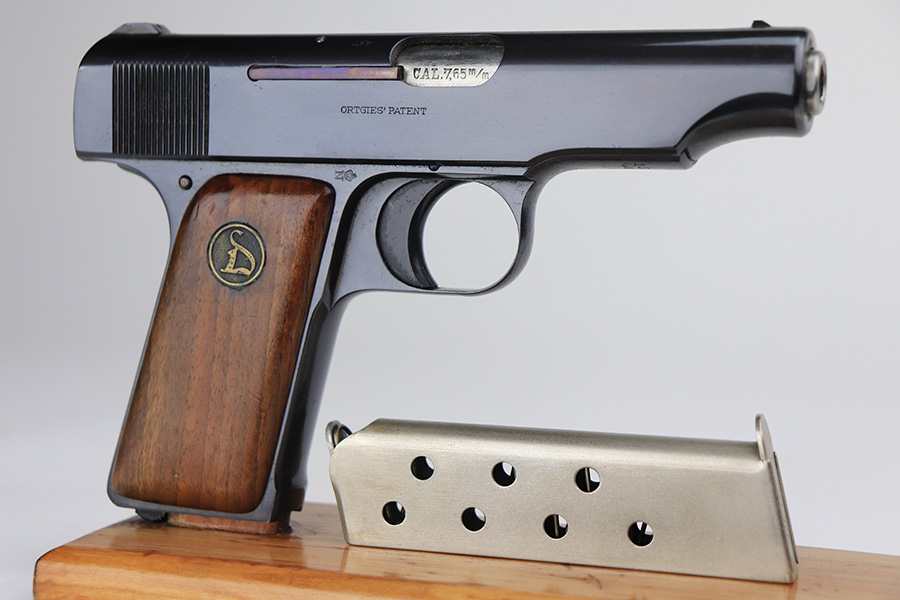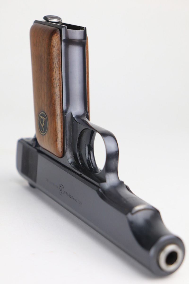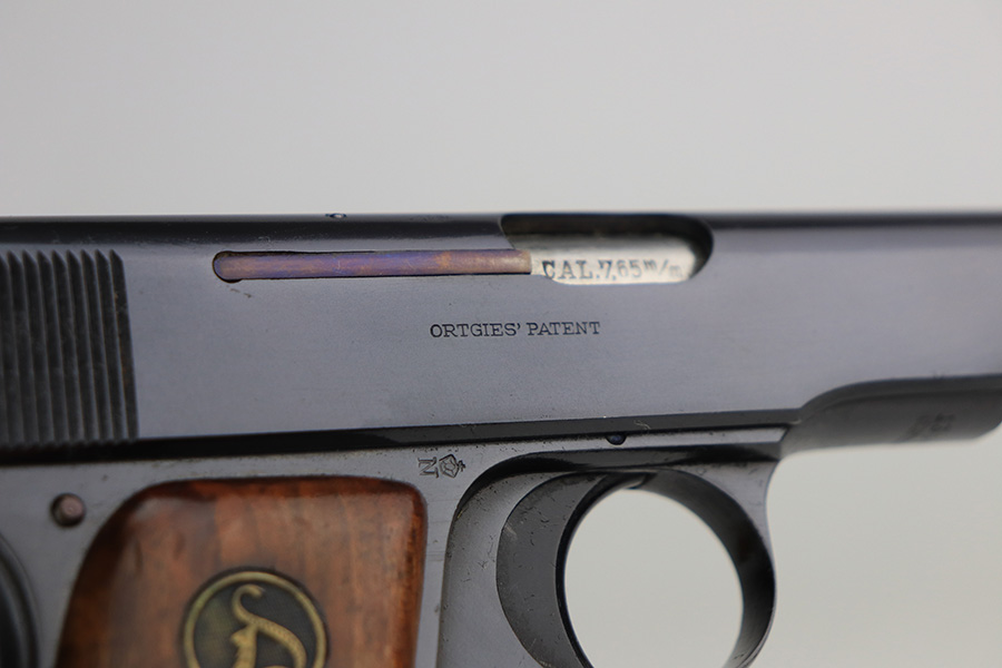 1/27/22 – This is a gorgeous, mint example of an Ortgies semi auto pistol. The gun is all matching and has the proper “Crown N” commercial proofs. There is a “Germany” export proof on the underside of the frame, indicating the gun was meant for sale in the international commercial market. The gun is truly in like-new condition with no signs of wear or finish loss. Comes with excellent period-correct grips with just a few small bruises. Also comes with a factory-nickeled magazine. Stone-mint bore. Just a beautiful example.