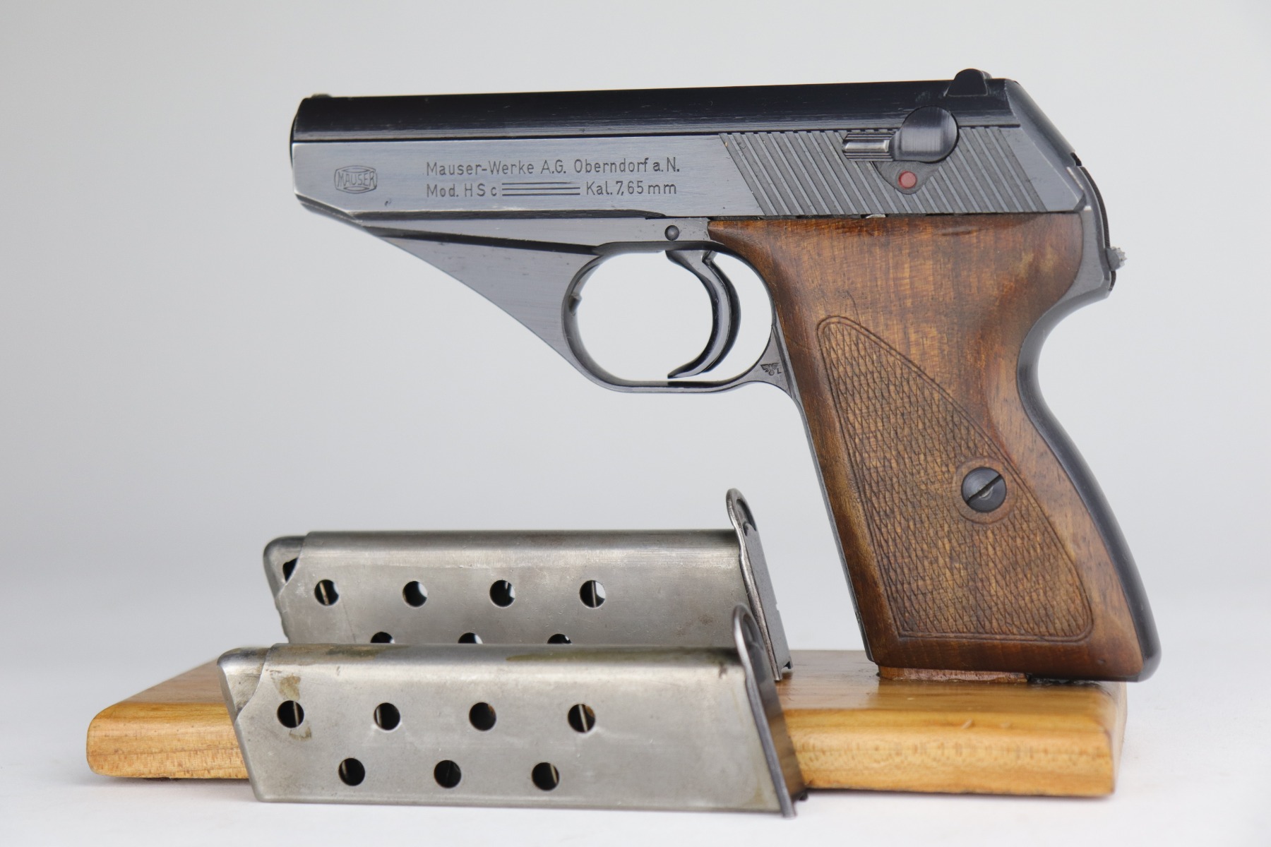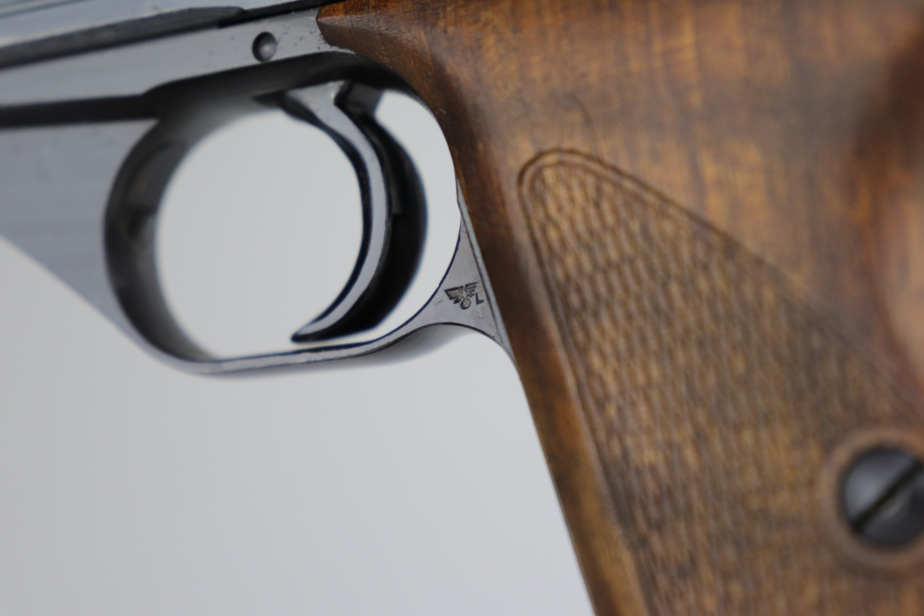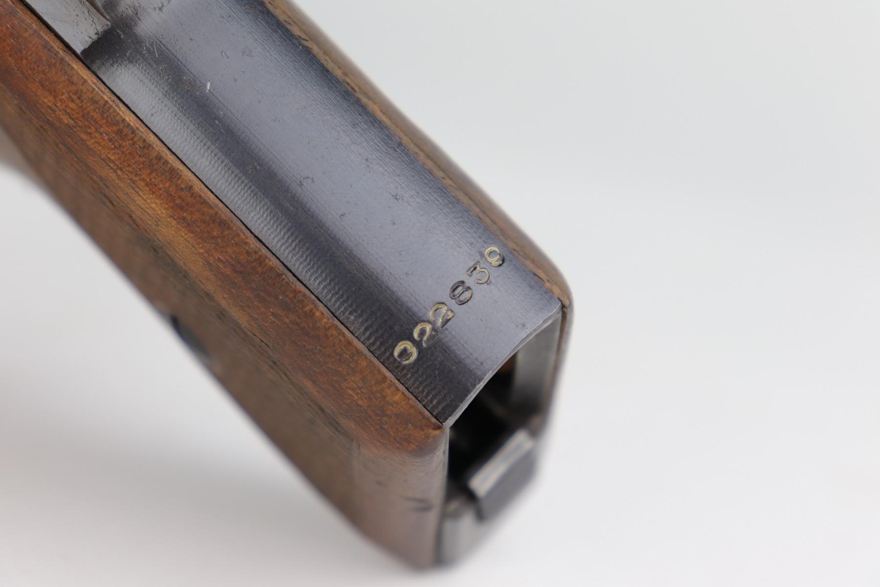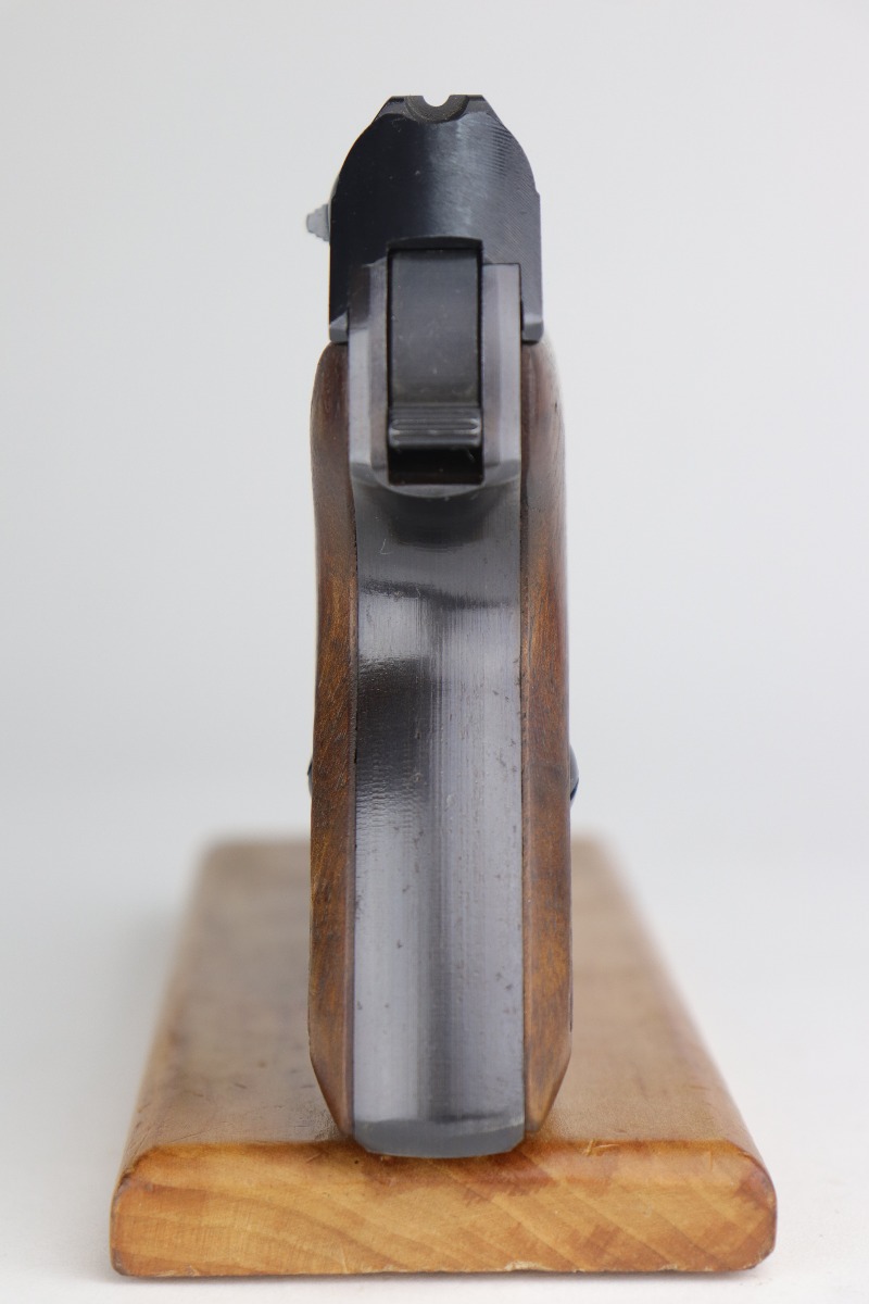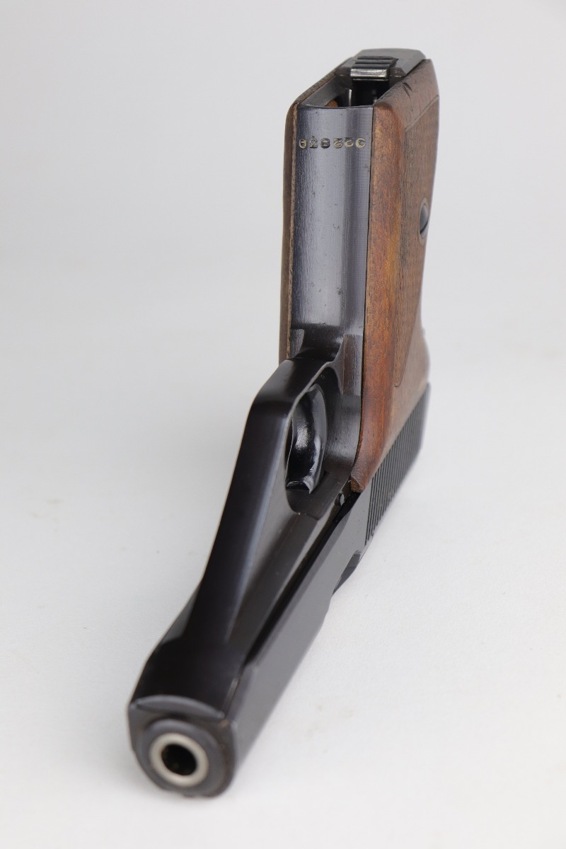 6/8/23 – This is a mint example of a Mauser HSC Rig issued to the Nazi police force in 1944. The gun is all matching and has the proper Police “Eagle L” marking on the web of the trigger guard. The rig comes with a 1941-dated police holster and two period-correct magazines. The gun is mint, retaining about 99% of its original bluing. There is just a hint of wear around the muzzle and high edges of the slide. It comes with minty wood grips. The bore is mint.