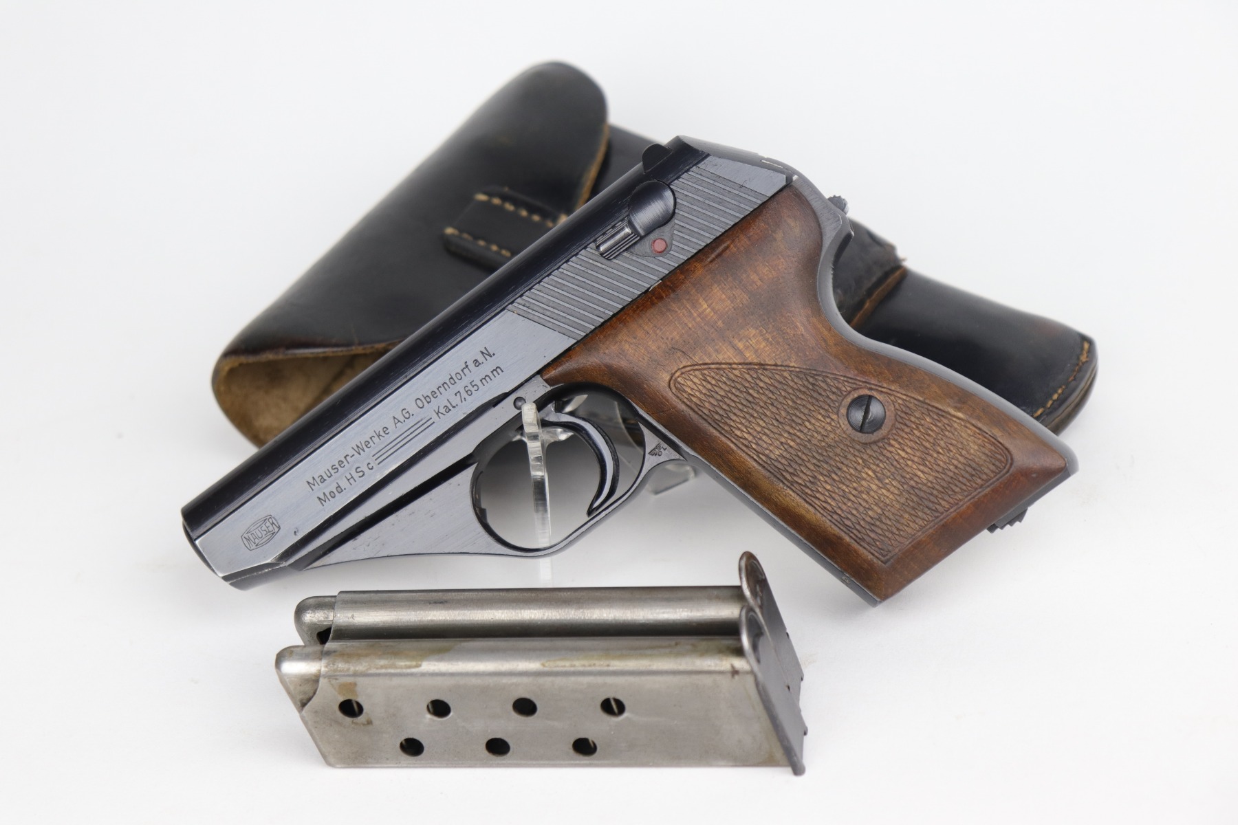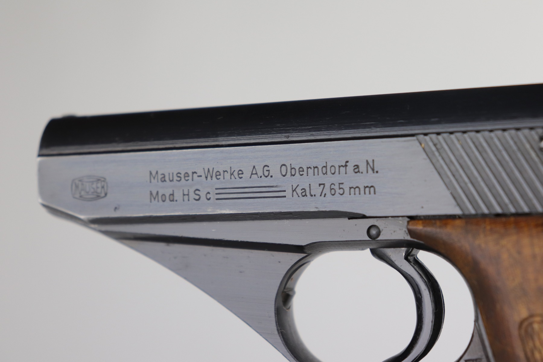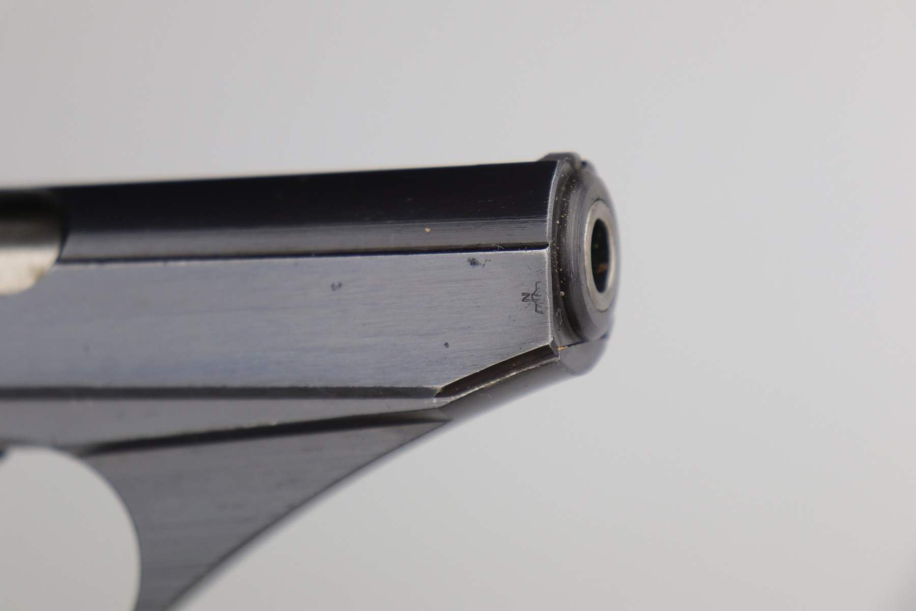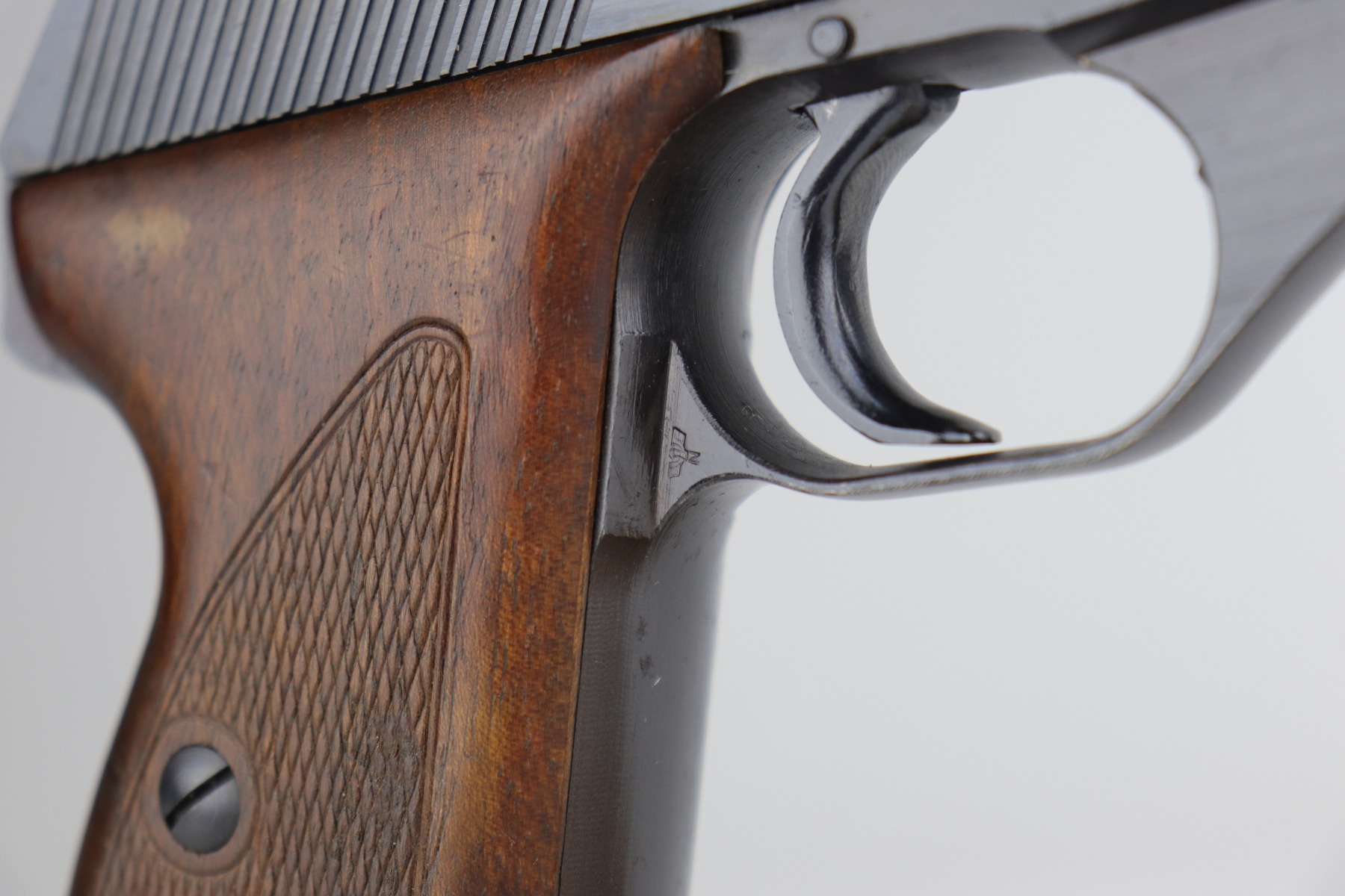 6/8/23 – This is a mint example of a Mauser HSC Rig issued to the Nazi police force in 1944. The gun is all matching and has the proper Police “Eagle L” marking on the web of the trigger guard. The rig comes with a 1941-dated police holster and two period-correct magazines. The gun is mint, retaining about 99% of its original bluing. There is just a hint of wear around the muzzle and high edges of the slide. It comes with minty wood grips. The bore is mint.