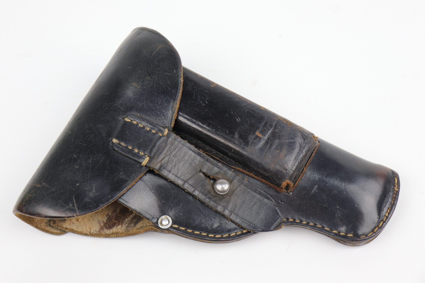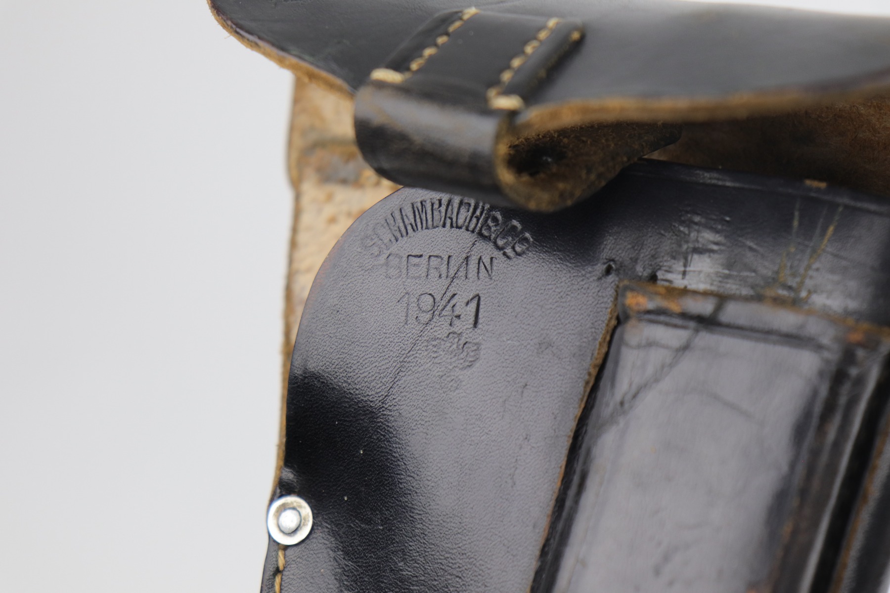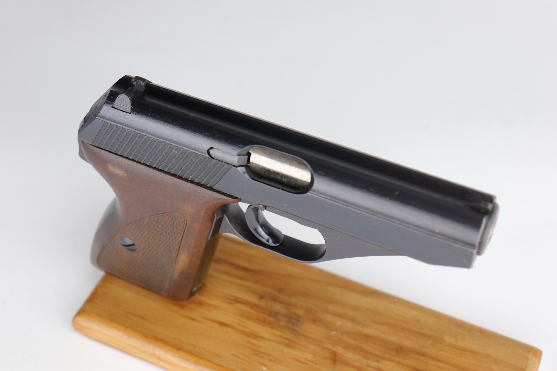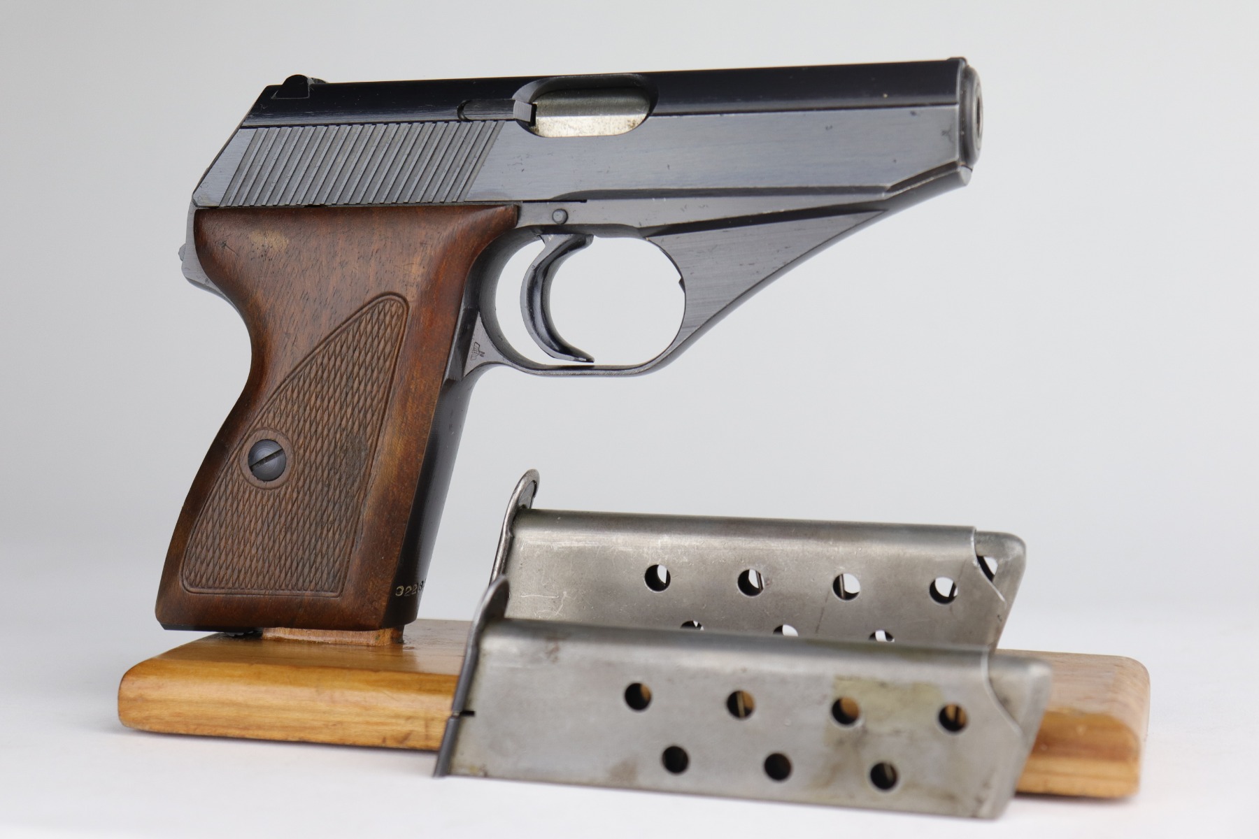 6/8/23 – This is a mint example of a Mauser HSC Rig issued to the Nazi police force in 1944. The gun is all matching and has the proper Police “Eagle L” marking on the web of the trigger guard. The rig comes with a 1941-dated police holster and two period-correct magazines. The gun is mint, retaining about 99% of its original bluing. There is just a hint of wear around the muzzle and high edges of the slide. It comes with minty wood grips. The bore is mint.