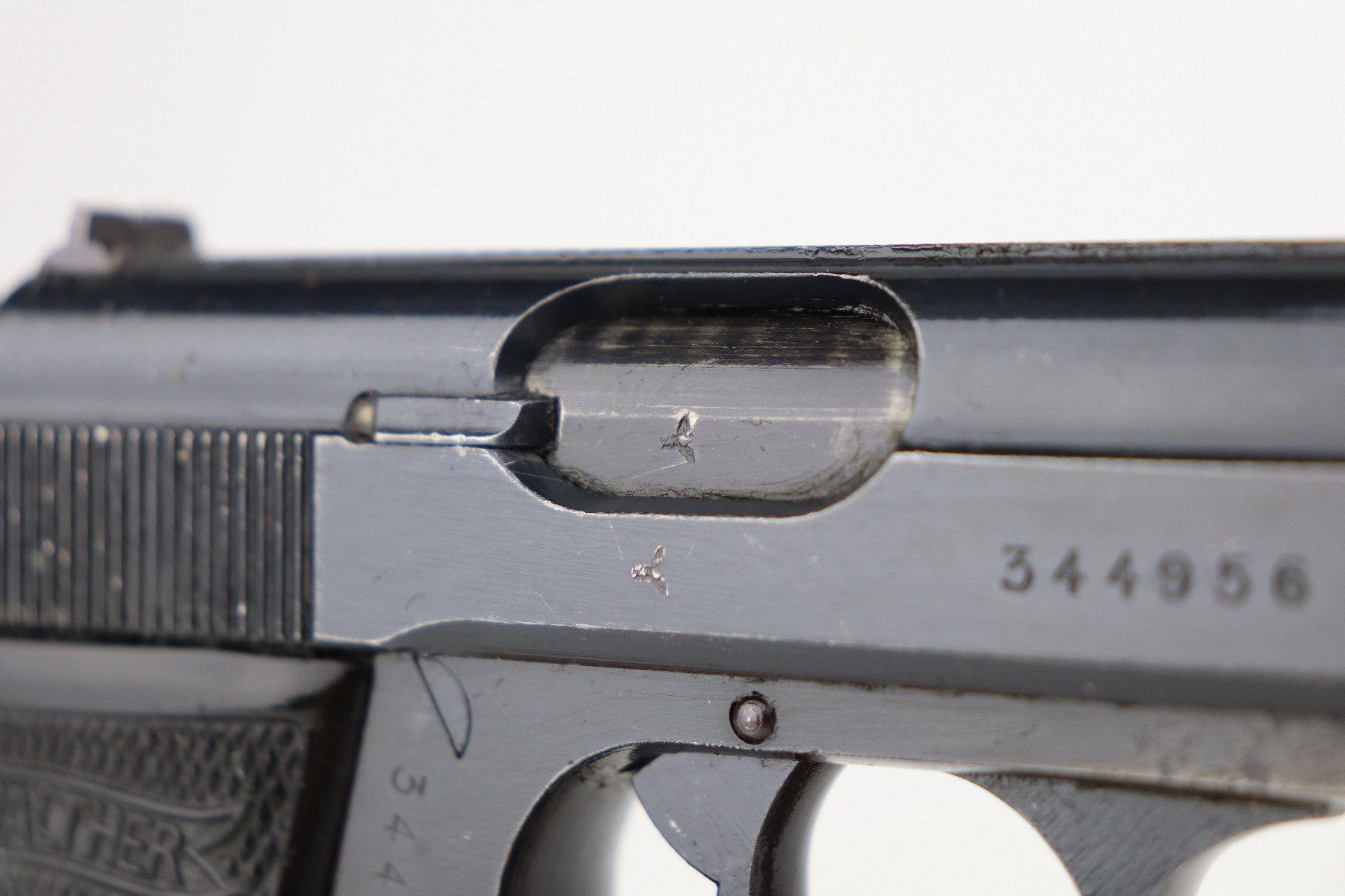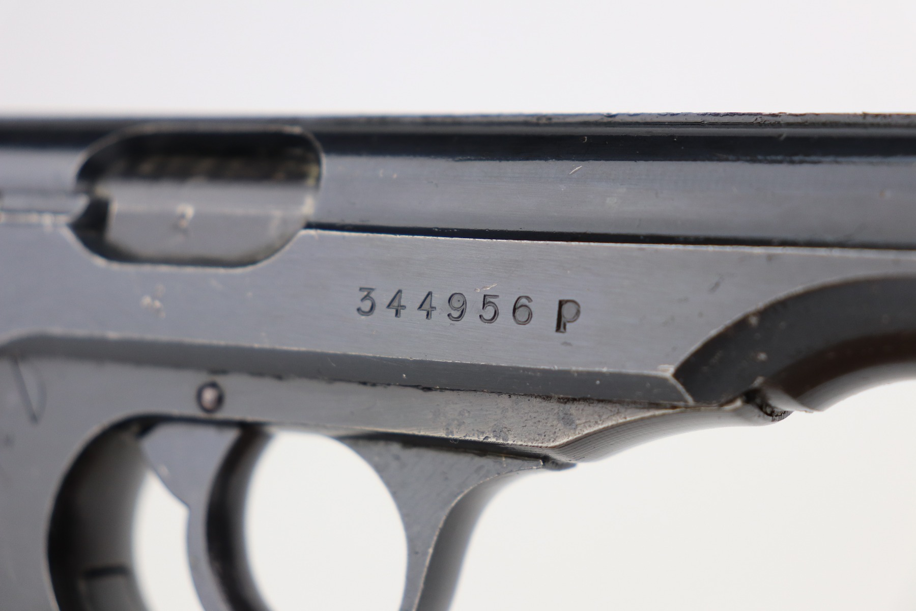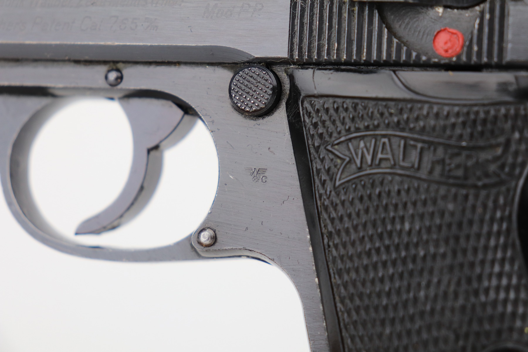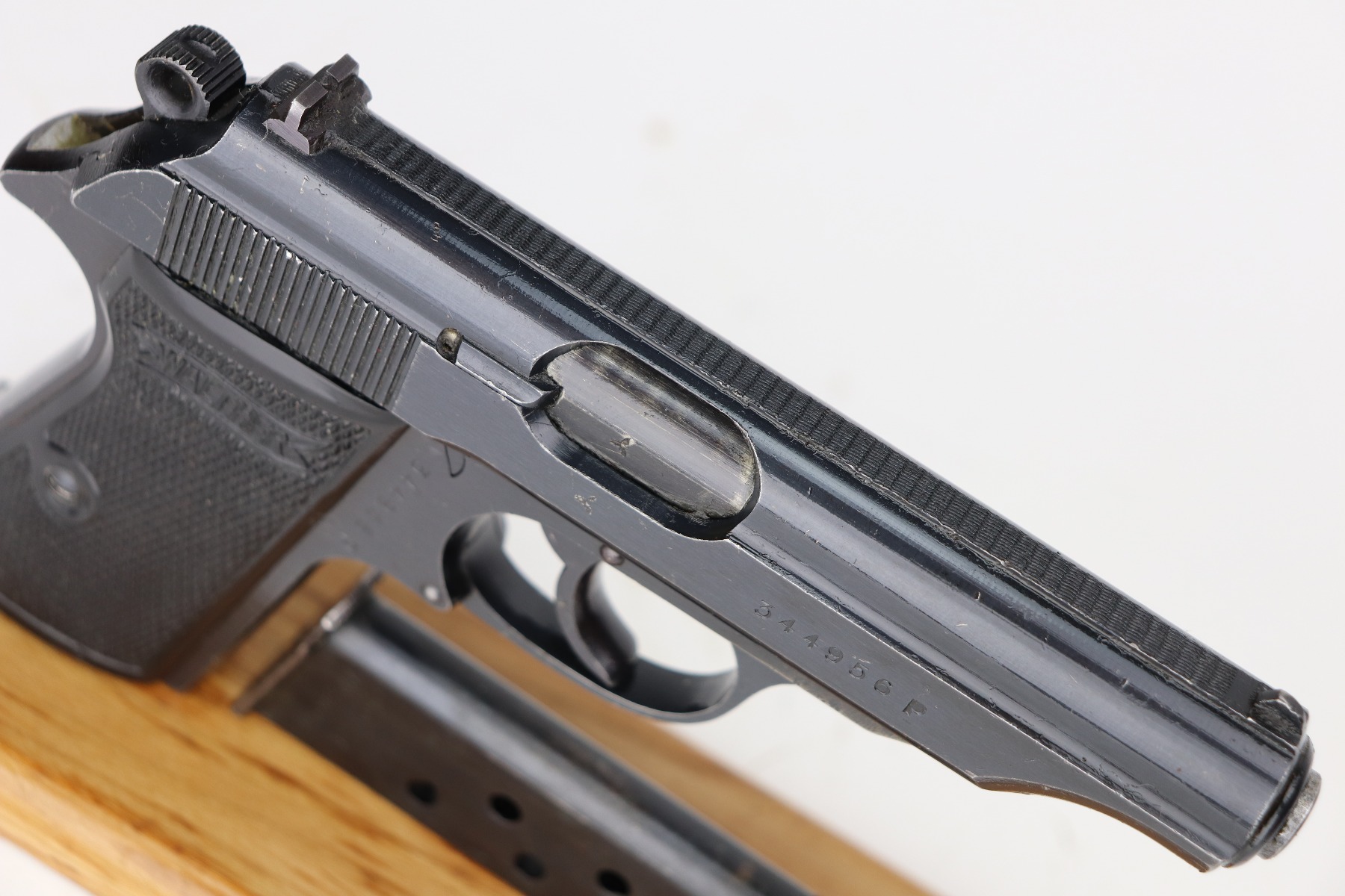 3/31/21 – This is a mint example of a Walther PP issued to the Nazi police force in 1944. It is all matching and has the proper police “Eagle C” proof. A lanyard ring was added to the base of the frame, likely after the war. The gun has retained more than 98% of its finish. There are just a few very light handling marks here and there. Comes with excellent grips and a proper wartime magazine. The bore is near-mint.