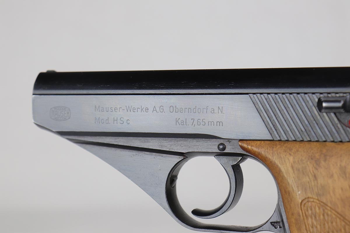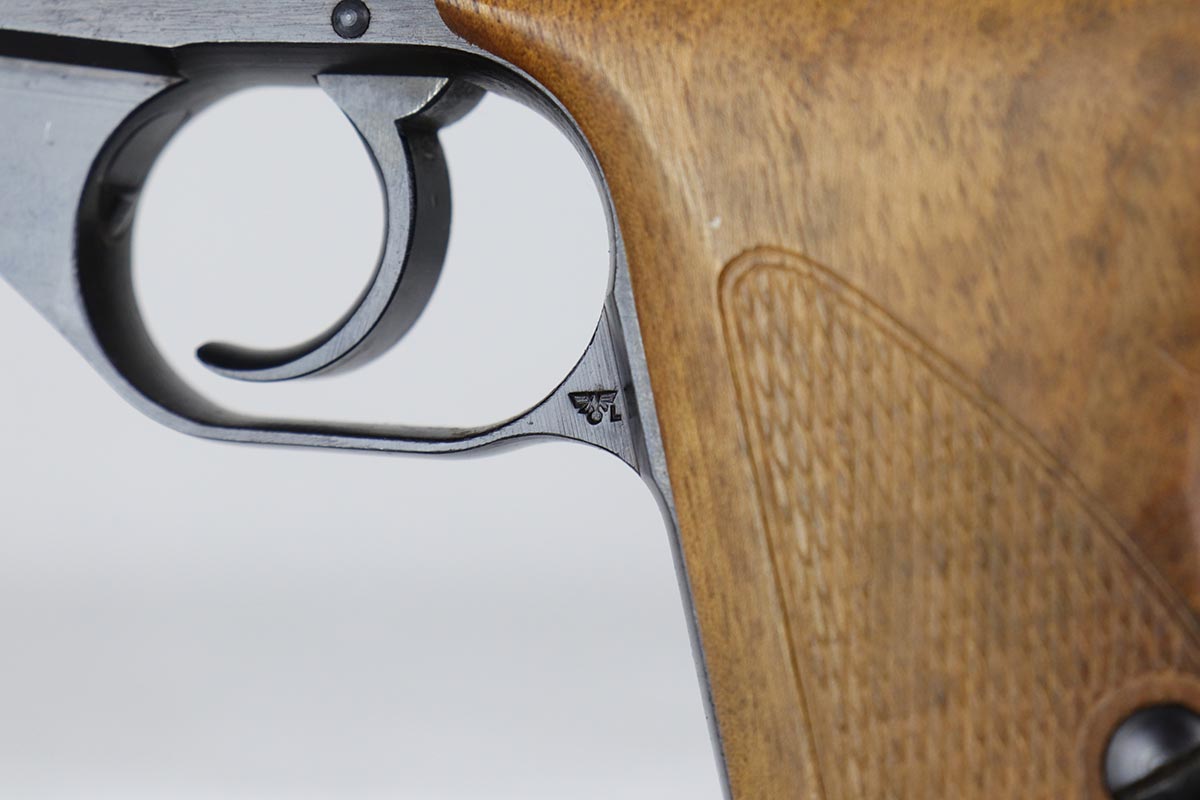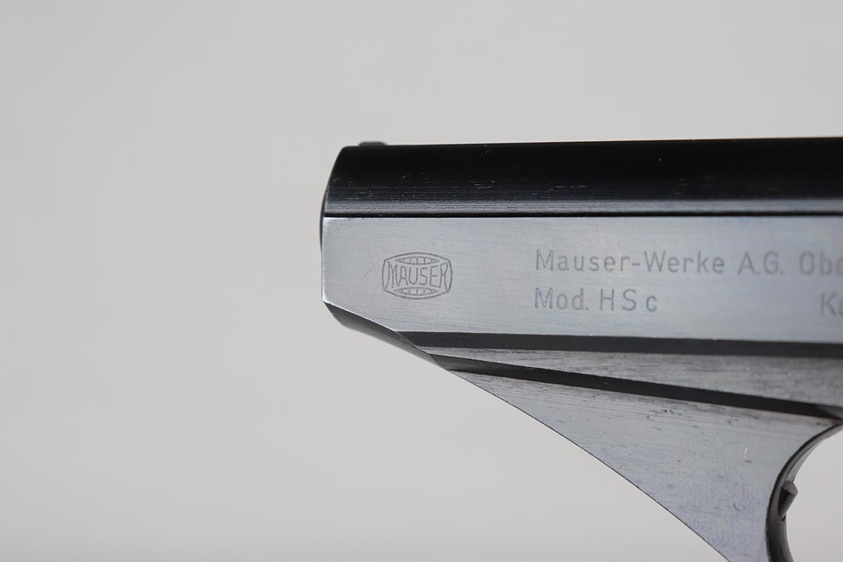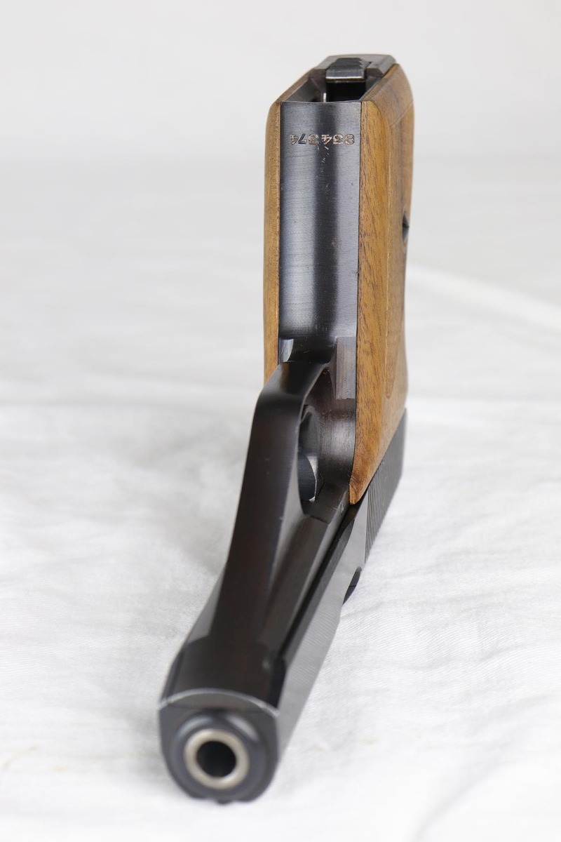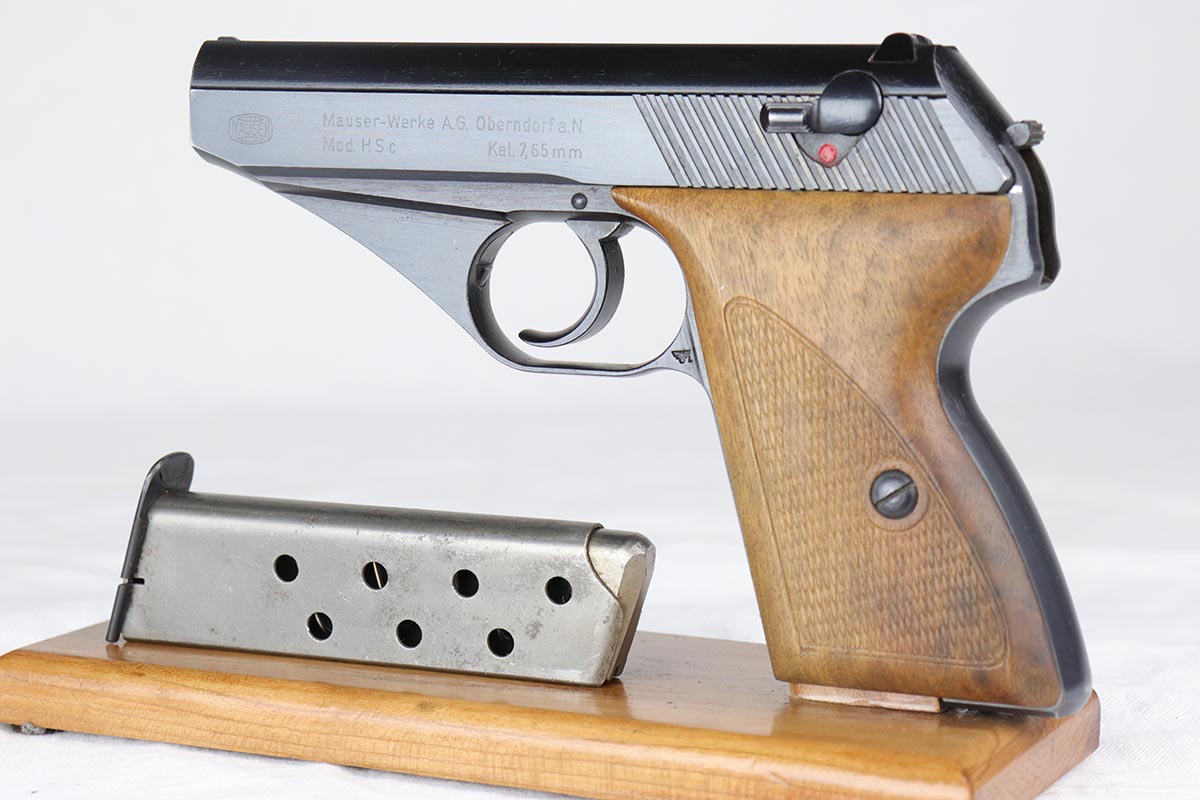 3/23/18 – This is a beautiful example of a Police issued Mauser HSc. The Eagle/L Police inspection stamp can be seen on the left side of the trigger guard. The original finish is a beautiful 99% with just a spot of wear on the back strap. The wood grips are as clean and minty as the rest of the gun. The slide, frame and barrel are all matching. The bore is as minty as the rest of the gun. Comes with a correct wartime magazine.