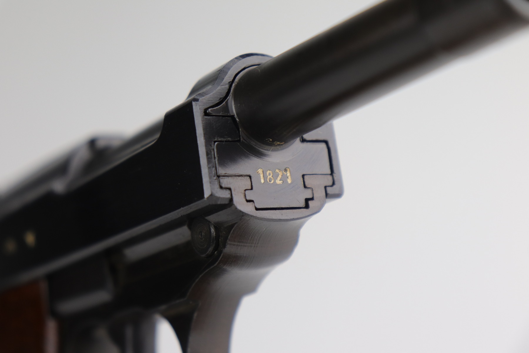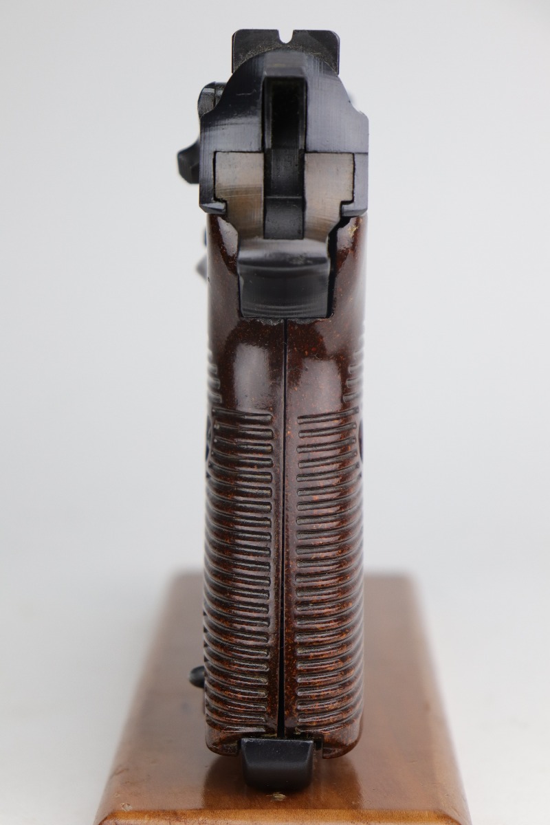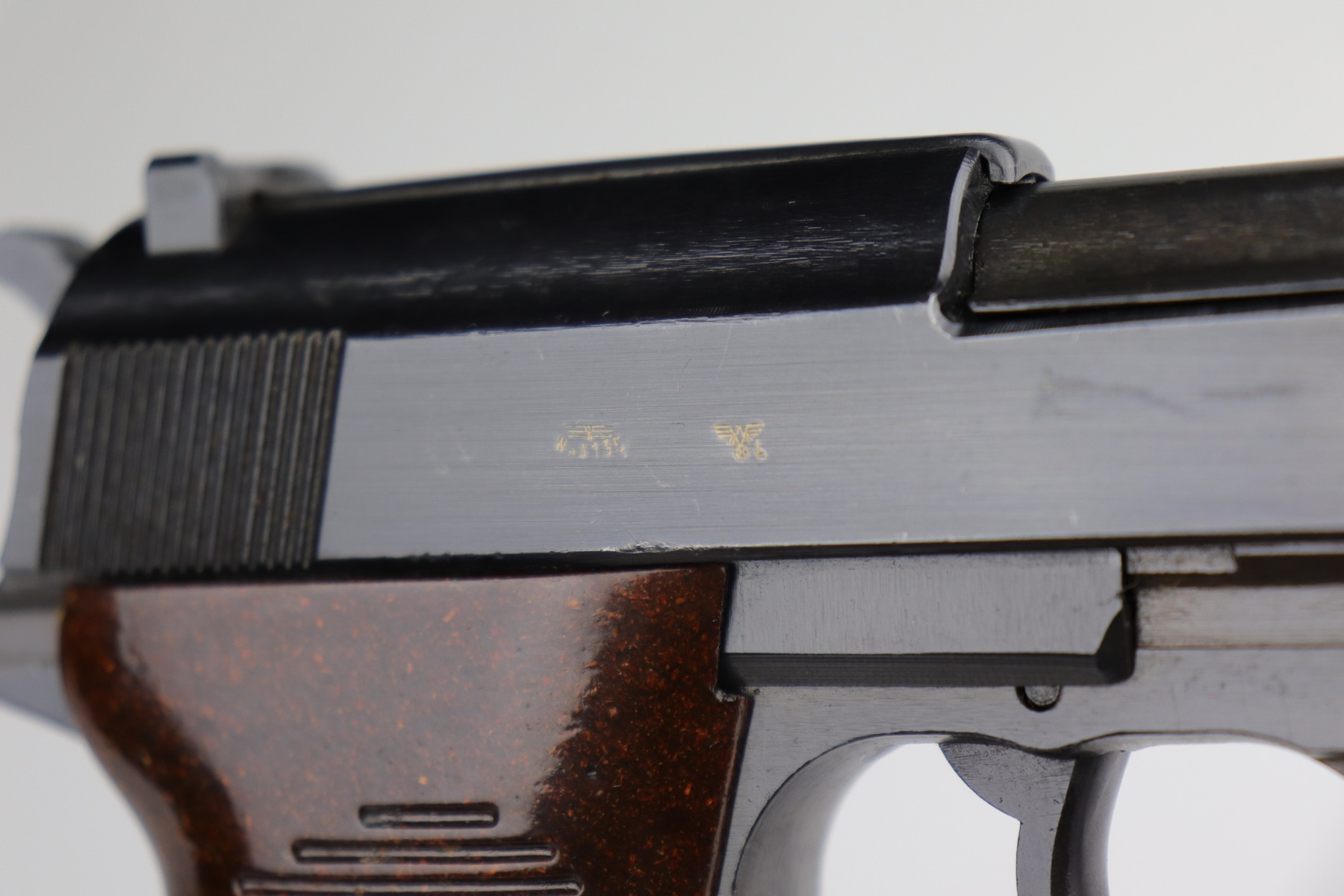 7.25/23 – This is a mint example of a Mauser P.38 issued to the Nazi police force in 1944. It is all matching and has both “Waffen 135” military proofs and an “Eagle L” police proof. This gun is in mint condition with no obvious signs of wear except a small area of minor dark discoloration on the right side of the slide. It comes with excellent grips and one period-correct magazine. The bore is minty. De-cocker is fully functional.