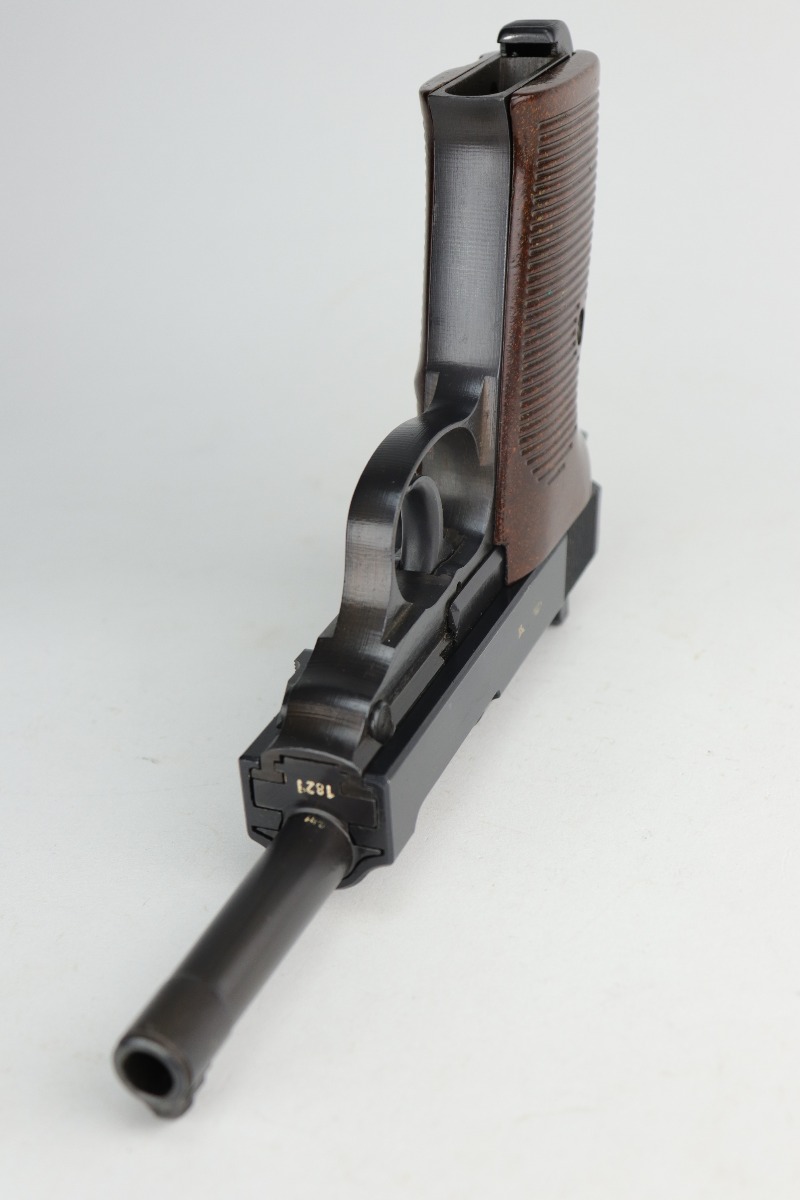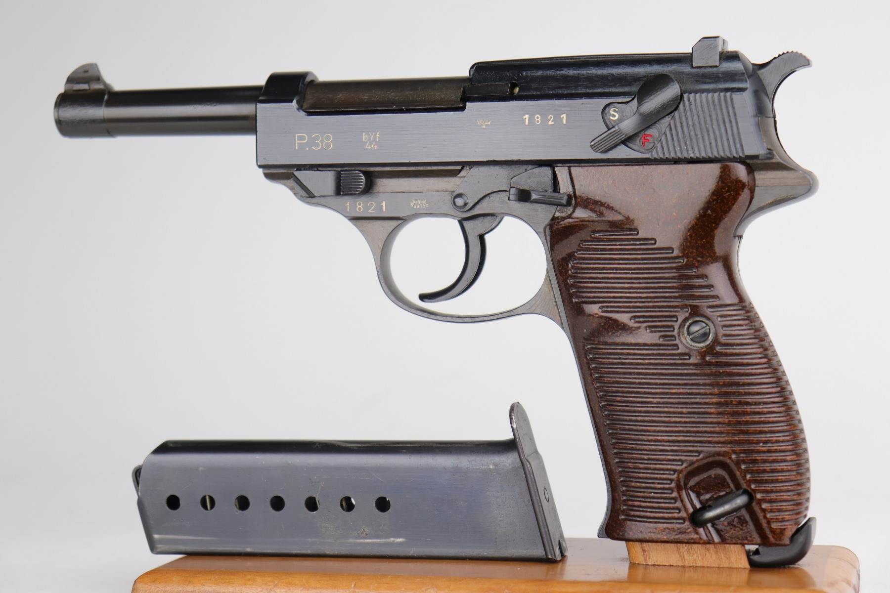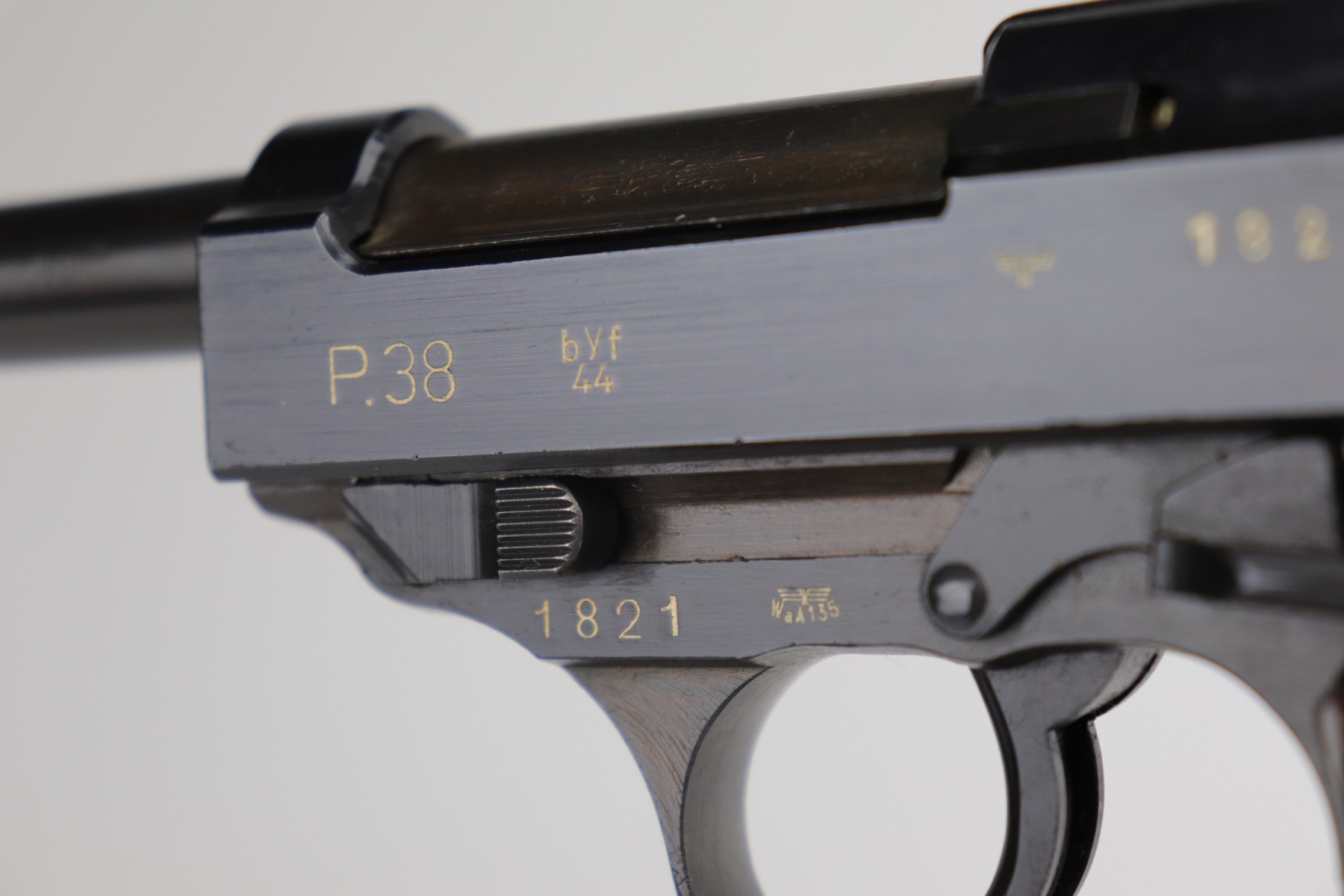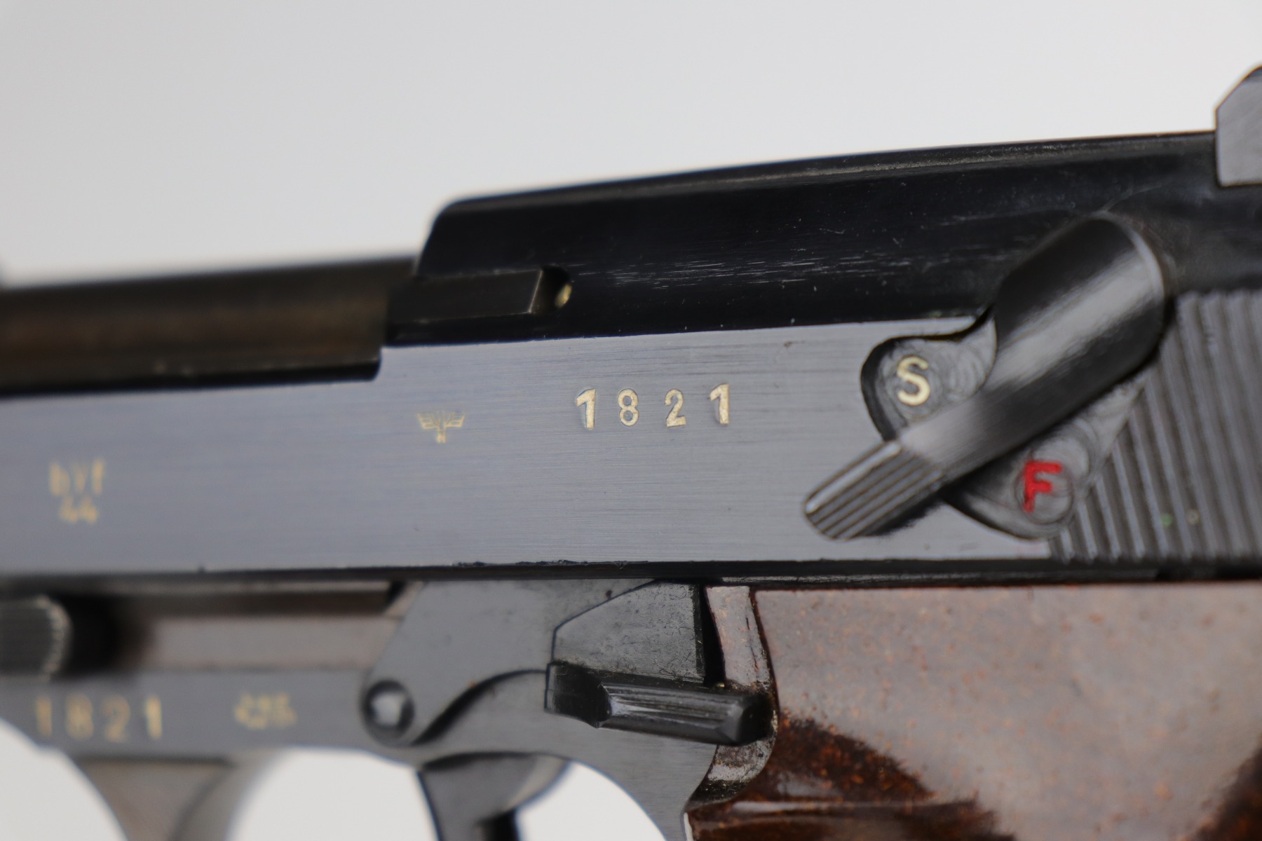 7.25/23 – This is a mint example of a Mauser P.38 issued to the Nazi police force in 1944. It is all matching and has both “Waffen 135” military proofs and an “Eagle L” police proof. This gun is in mint condition with no obvious signs of wear except a small area of minor dark discoloration on the right side of the slide. It comes with excellent grips and one period-correct magazine. The bore is minty. De-cocker is fully functional.