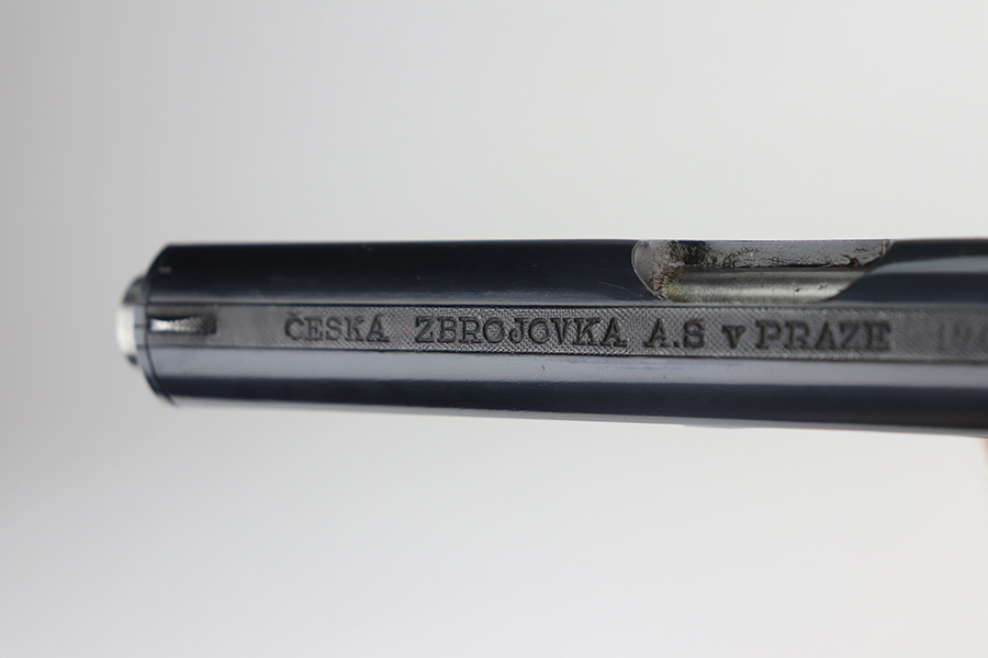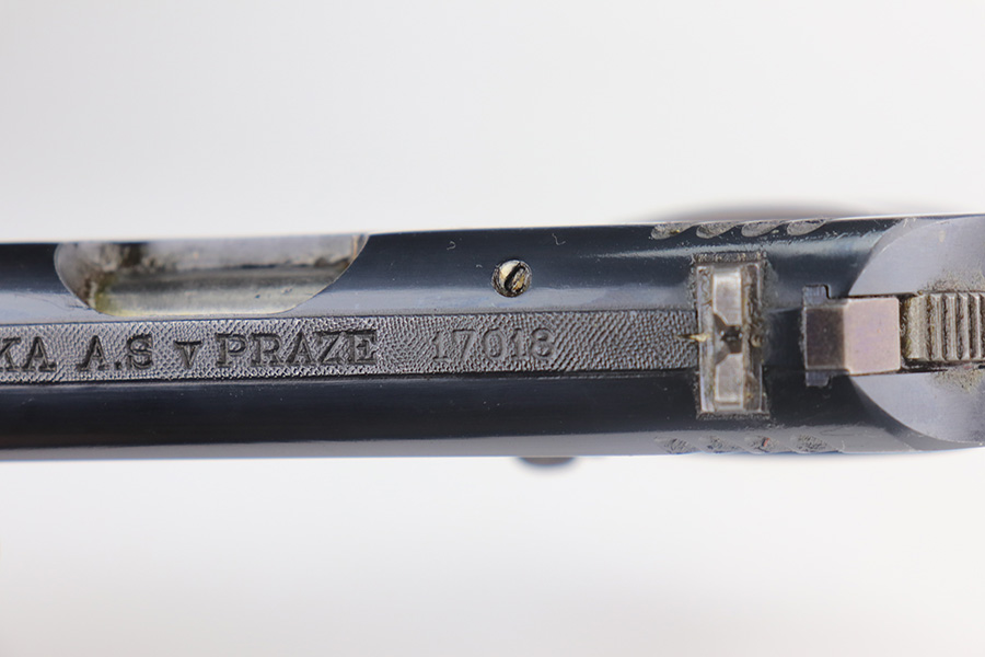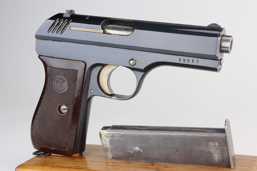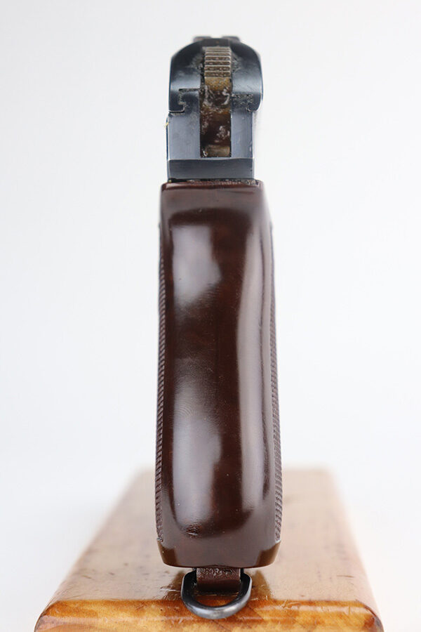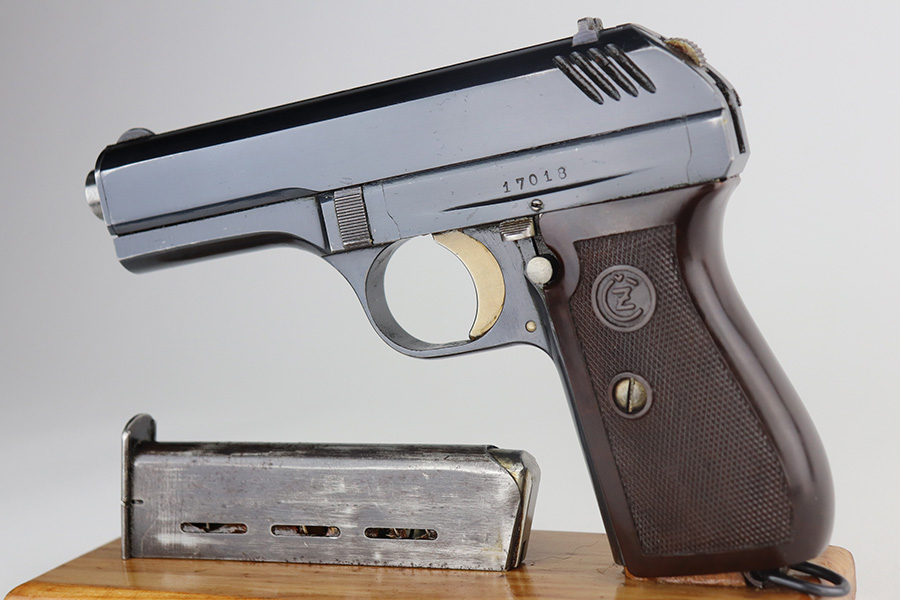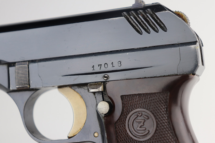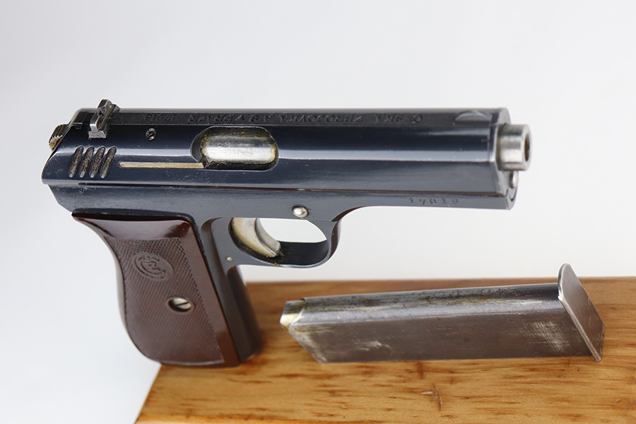 6/2/21 – This is a mint example of a CZ 27 sold in the commercial market before WW2. It is matching and has retained more than 98% of its original high polish bluing. There is just a hint of wear on the high edges of the slide. A few very light scratches on the right side of the slide. Excellent grip – no cracks or chips. Comes with one proper magazine. Mint bore.