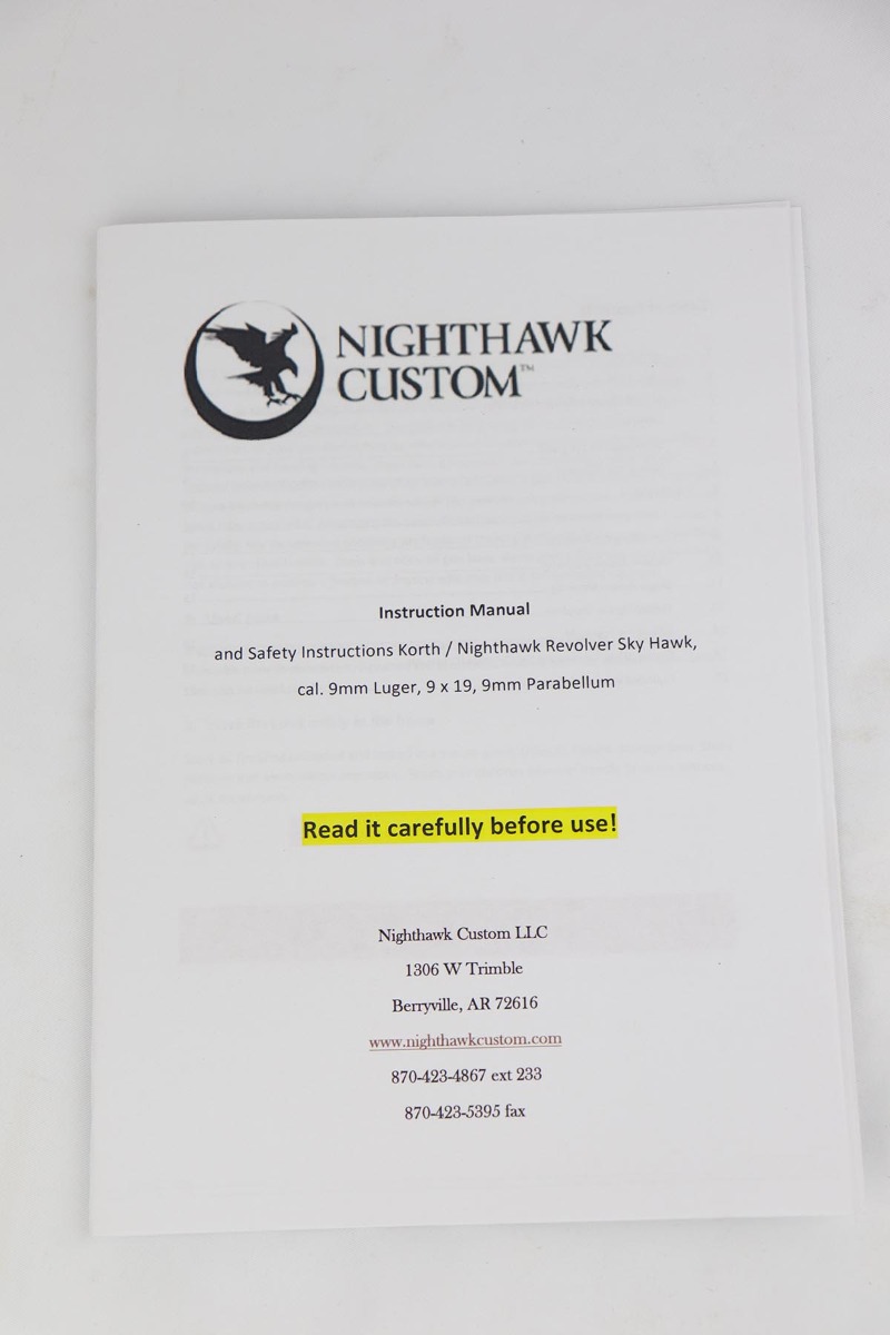 4/2/19 – This is one of the most desirable Korth revolvers to come to market in the last 20 years – a Korth-Nighthawk Skyhawk revolver chambered in 9mm Para. The biggest challenge in designing a revolver in 9mm Para is the difficulty in devising an extraction system that would work without the use of moon clips, as the 9mm Para cartridge is a rimless cartridge that sits completely inside the chamber. Korth of Germany was up to task and came up with a proprietary system of small individual extractors, that work in concert to extract all 6 chambers of the cylinder. Korth teamed up with Nighthawk industries to import these guns into US in the last 2 years. However the demand was so high that there was a 3 year order backlog at Nighthawk and now a total of 486 of these guns have been imported and sold in US with no more of these incredible revolvers to be imported in the future! Designed as an ultimate carry revolver, it has a 2 inch barrel and soft rounded lines to prevent snagging on the holster or clothes. The revolver is extremely light weight at 19.4 oz. The double action is like no other revolver action, thanks to the Korth proprietary trigger action and is apparently almost as crisp as the single action. The gun is brand new and unfired in original case, with paperwork and a test target. This is the most diminutive Korth made and is already a collector item with just a few hundred in existence in US.