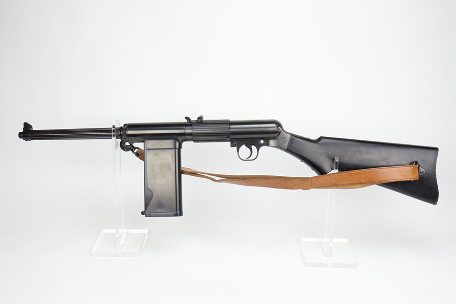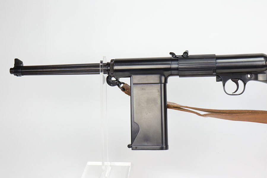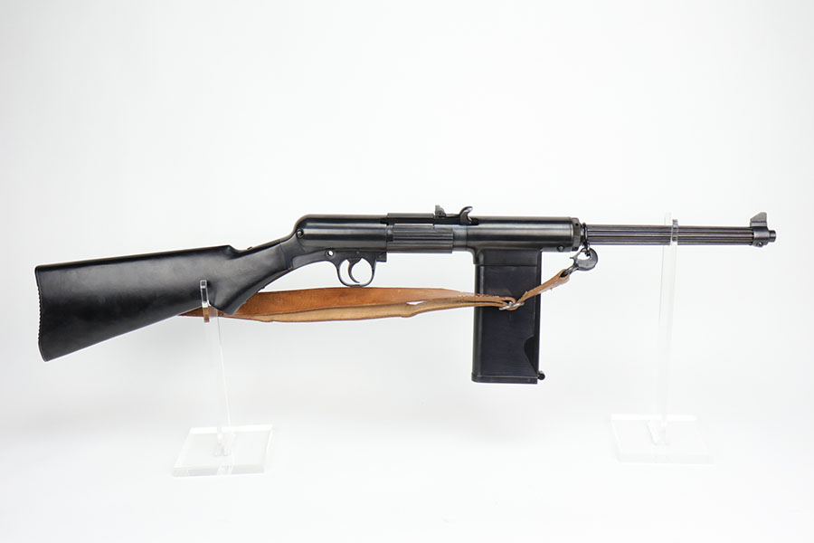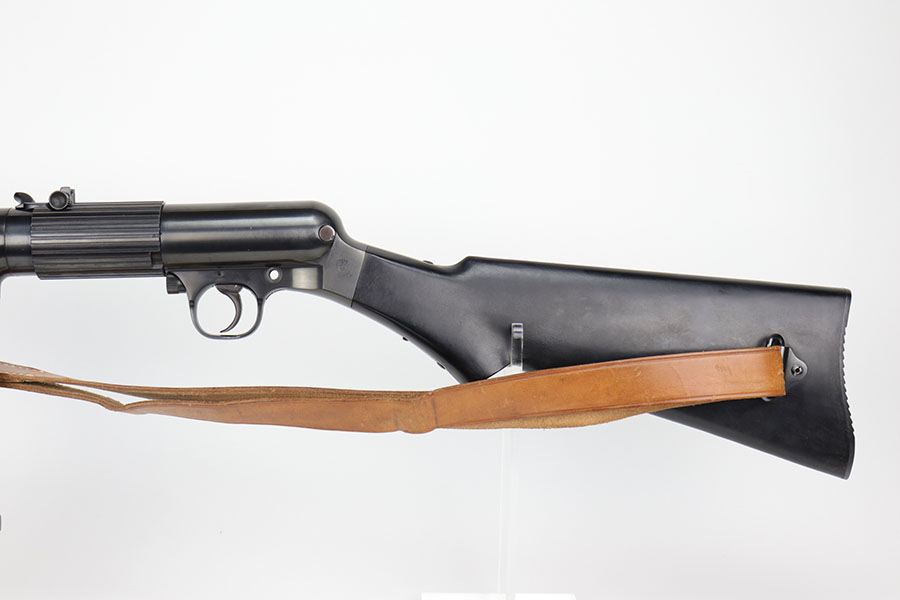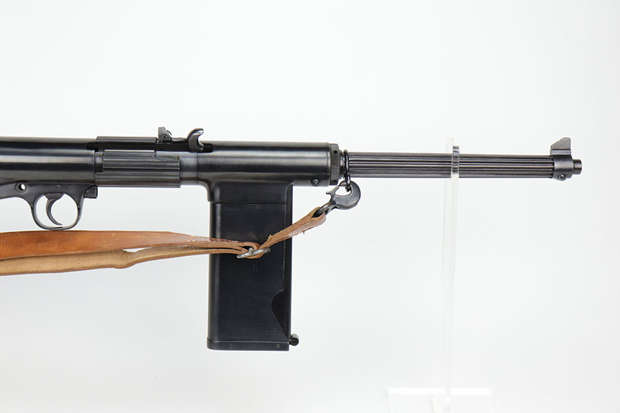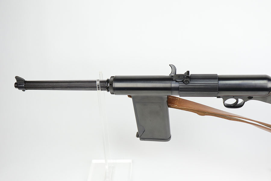 In early 1939 the British government asked Smith & Wesson to design a light rifle firing the 9×19mm Parabellum cartridge for military use. The British government advanced one million dollars toward production of the design following receipt of prototypes. Testing at the Royal Small Arms Factory revealed the rifle had been designed for cartridges as loaded by United States civilian cartridge companies, and the higher pressure United Kingdom military loads caused broken receivers after as few as 1,000 rounds. The British government required redesign so rifles would withstand firing 5,000 rounds without failure. The receiver was strengthened with an external sleeve to meet that requirement. Rifles with the strengthened receiver were designated Mark II and rifles with original receivers were subsequently referred to as Mark I. This rifle is one of the original Mark II examples in exquisite, original condition. The British government cancelled the production contract after receiving 60 prototypes and 950 rifles. Approximately 750 were Mark I rifles, and about 200 were the stronger Mark II design. The rifles were not issued to the armed forces and most were cut in half and dumped at sea when the second world war ended. Five were saved for display in museums including the Tower of London. Smith & Wesson continued production with serial numbers as high as 2200 and the rifle was tested by the United States Army at Aberdeen Proving Ground. The Army rejected the design because the rifle was chambered for what was then a non-standard cartridge for the United States military. There was some discussion about redesign to permit full-automatic fire, but production was halted after a total of 1,227 rifles had been manufactured. The short-barreled weapons were considered unsuitable for sale to civilians under the National Firearms Act, so an inventory of 217 remained at the Smith & Wesson factory until a dealer negotiated Curio and Relic Firearms status with the Bureau of Alcohol, Tobacco, Firearms and Explosives in 1975. Firearms collectors subsequently purchased 137 Mark I and 80 Mark II rifles.