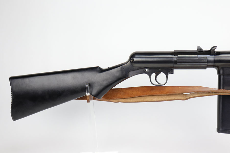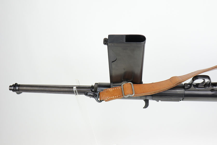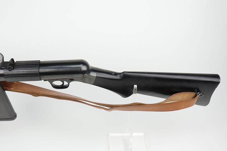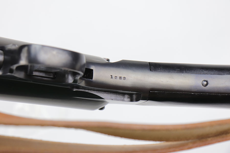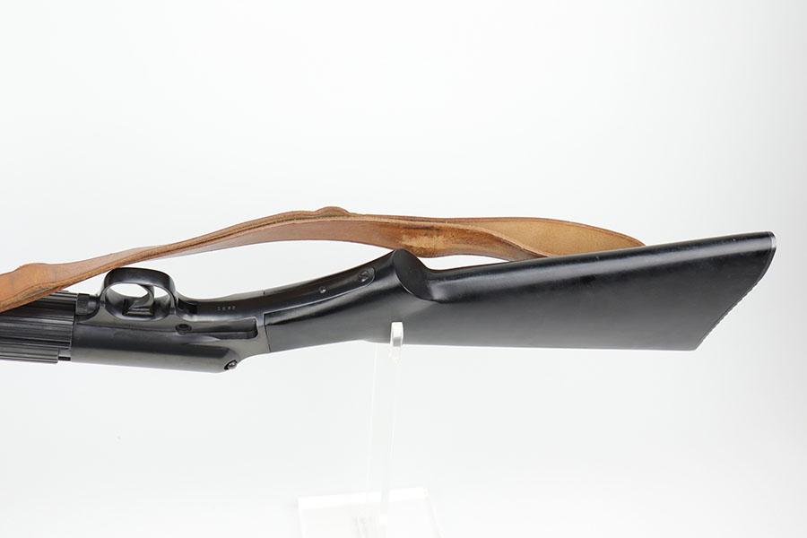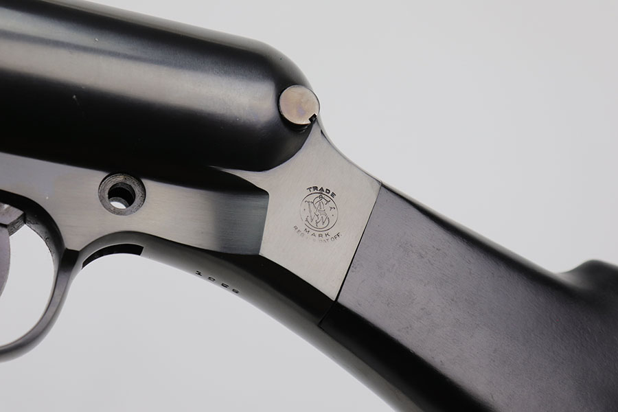 In early 1939 the British government asked Smith & Wesson to design a light rifle firing the 9×19mm Parabellum cartridge for military use. The British government advanced one million dollars toward production of the design following receipt of prototypes. Testing at the Royal Small Arms Factory revealed the rifle had been designed for cartridges as loaded by United States civilian cartridge companies, and the higher pressure United Kingdom military loads caused broken receivers after as few as 1,000 rounds. The British government required redesign so rifles would withstand firing 5,000 rounds without failure. The receiver was strengthened with an external sleeve to meet that requirement. Rifles with the strengthened receiver were designated Mark II and rifles with original receivers were subsequently referred to as Mark I. This rifle is one of the original Mark II examples in exquisite, original condition. The British government cancelled the production contract after receiving 60 prototypes and 950 rifles. Approximately 750 were Mark I rifles, and about 200 were the stronger Mark II design. The rifles were not issued to the armed forces and most were cut in half and dumped at sea when the second world war ended. Five were saved for display in museums including the Tower of London. Smith & Wesson continued production with serial numbers as high as 2200 and the rifle was tested by the United States Army at Aberdeen Proving Ground. The Army rejected the design because the rifle was chambered for what was then a non-standard cartridge for the United States military. There was some discussion about redesign to permit full-automatic fire, but production was halted after a total of 1,227 rifles had been manufactured. The short-barreled weapons were considered unsuitable for sale to civilians under the National Firearms Act, so an inventory of 217 remained at the Smith & Wesson factory until a dealer negotiated Curio and Relic Firearms status with the Bureau of Alcohol, Tobacco, Firearms and Explosives in 1975. Firearms collectors subsequently purchased 137 Mark I and 80 Mark II rifles.