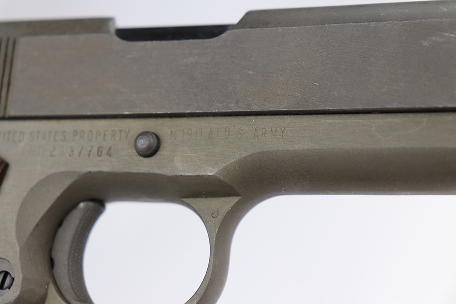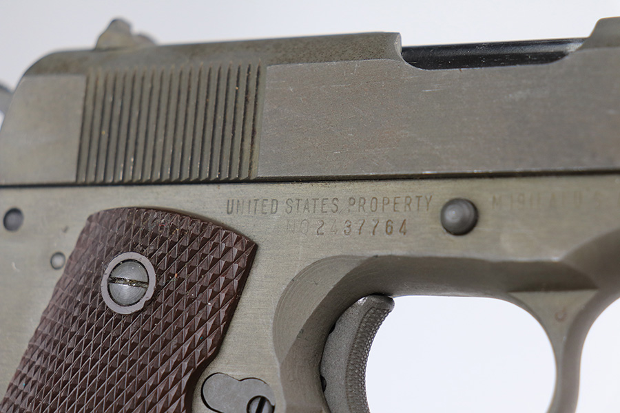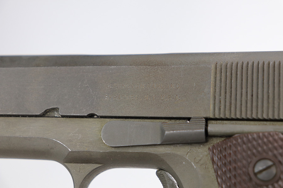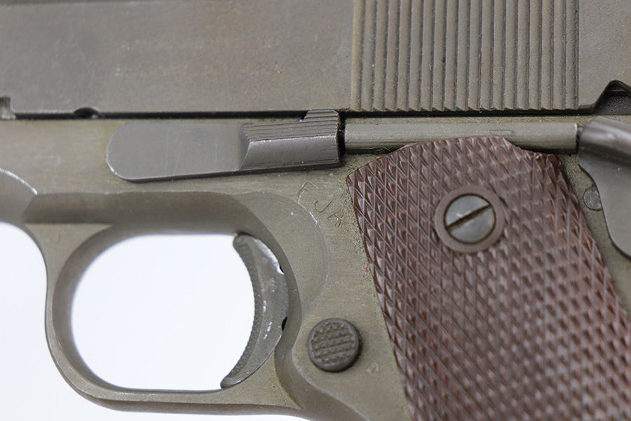 3/11/22 – This is a mint Remington Rand 1911A1 from 1945. The gun has no finish or handling wear, with mint bore and grips. Minor oxidation along the top of the slide. Proper inspection marks on frame and slide, with correct HS barrel. ‘L’ marked magazine. FJA and ‘P’ proof on left side frame, with crossed cannons on right side.