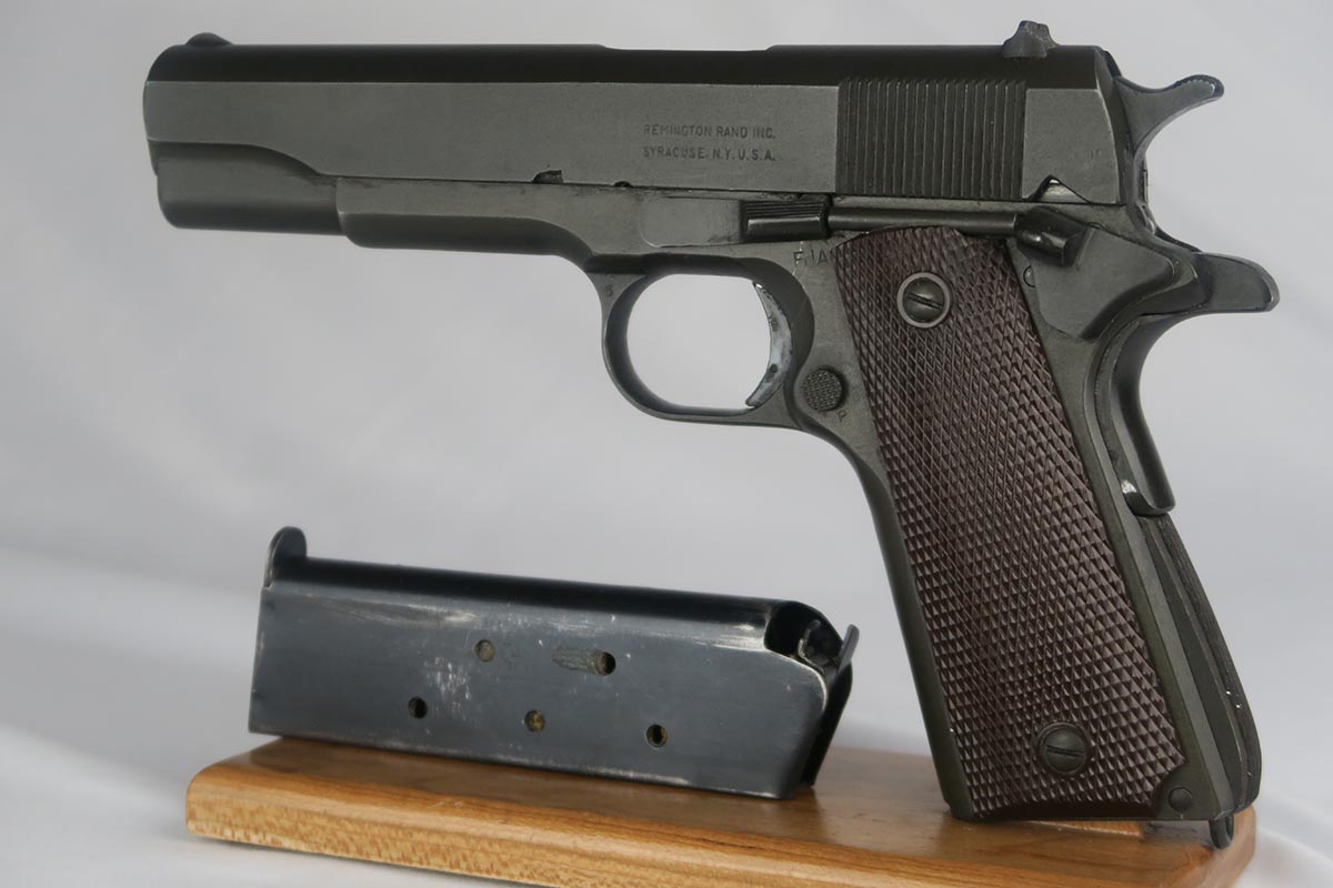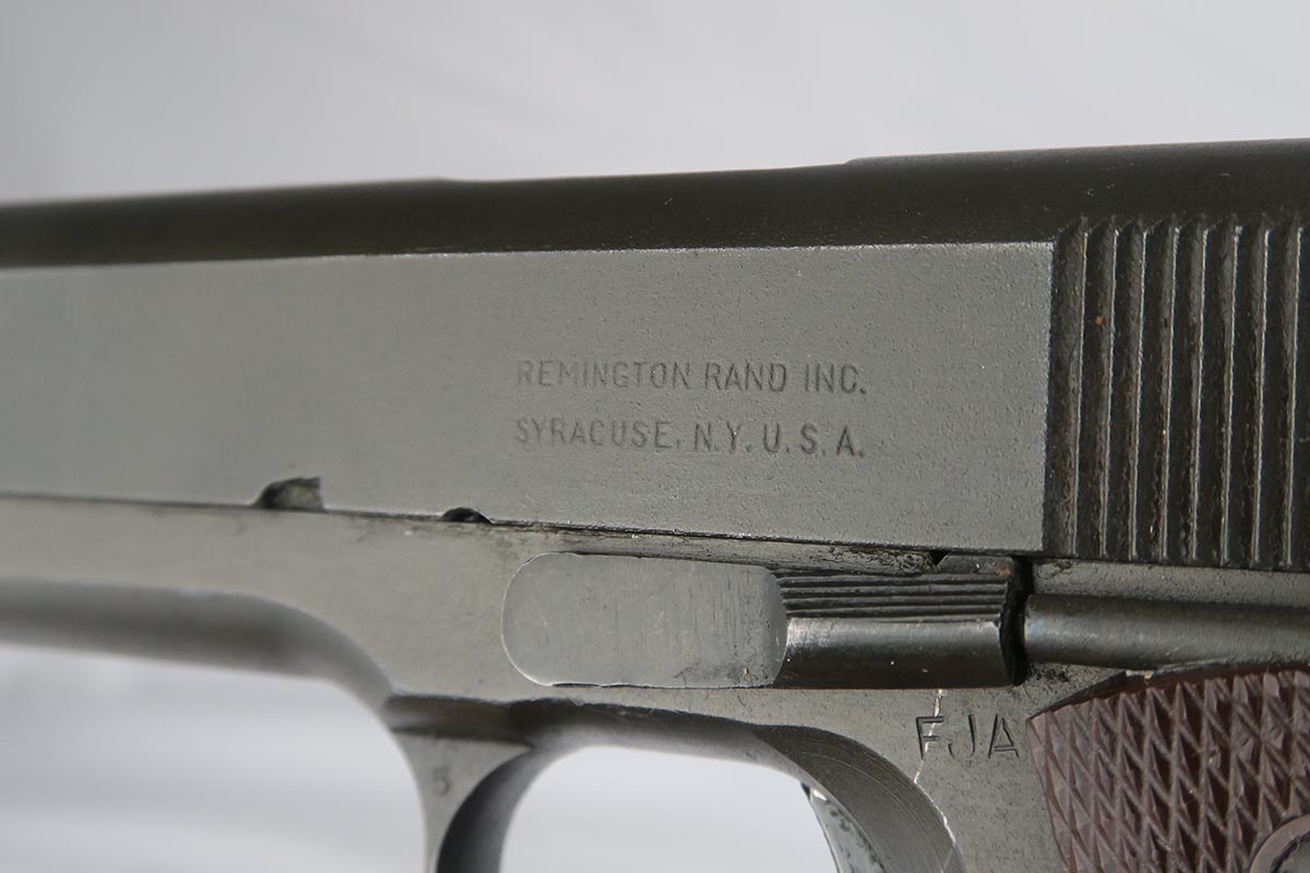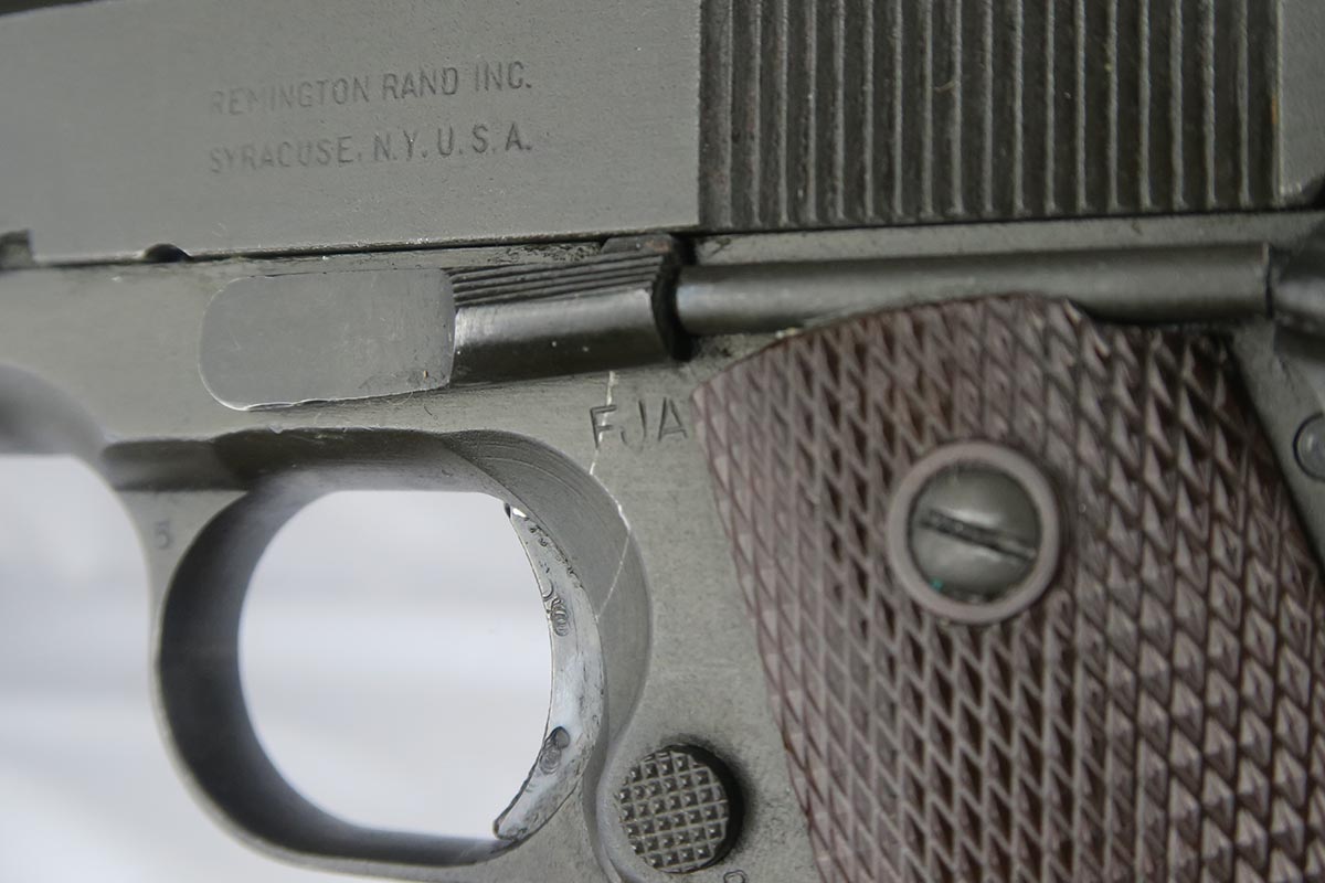 9/19/17 – This is a mint condition Remington Rand M1911A1.  It is all correct and original with no flaws to mention – the photos speak for themselves. FJA inspector proof on frame, and P proof on slide and frame.  Mint bore and grips.  Crossed cannons cartouche on frame.  Serial dates the pistol to either end of ’43 or early ’44.  Barrel is marked S P for Springfield Armory.