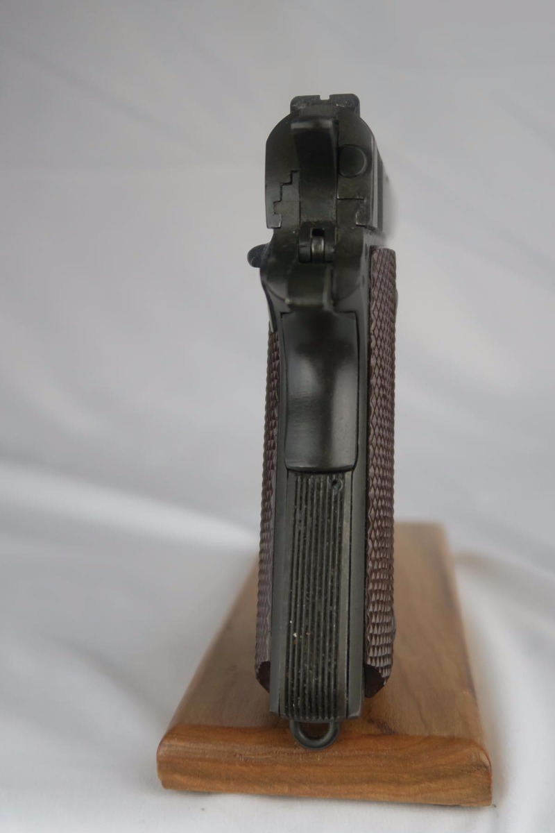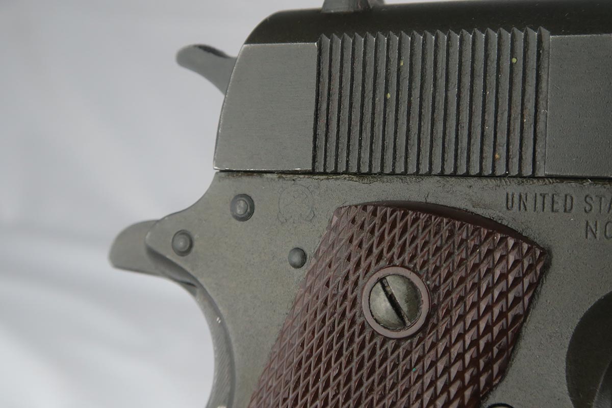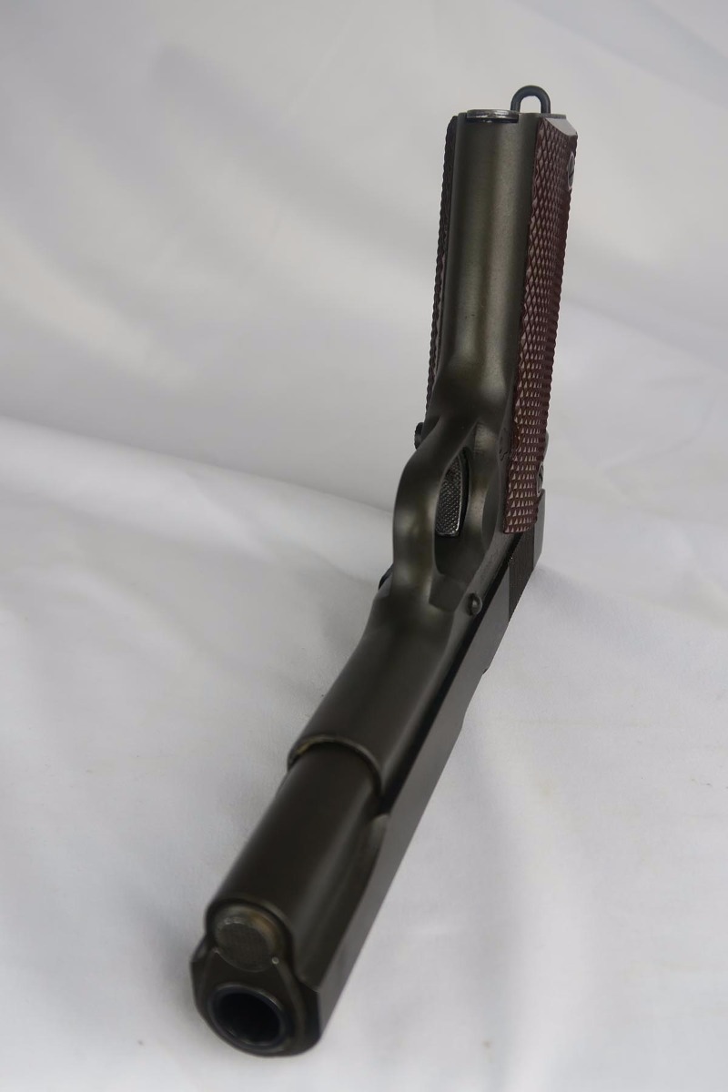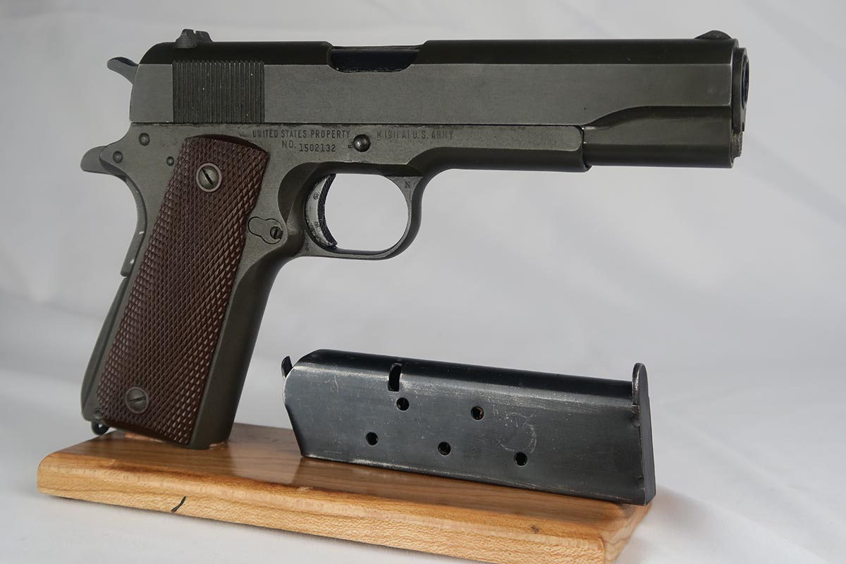 9/19/17 – This is a mint condition Remington Rand M1911A1.  It is all correct and original with no flaws to mention – the photos speak for themselves. FJA inspector proof on frame, and P proof on slide and frame.  Mint bore and grips.  Crossed cannons cartouche on frame.  Serial dates the pistol to either end of ’43 or early ’44.  Barrel is marked S P for Springfield Armory.