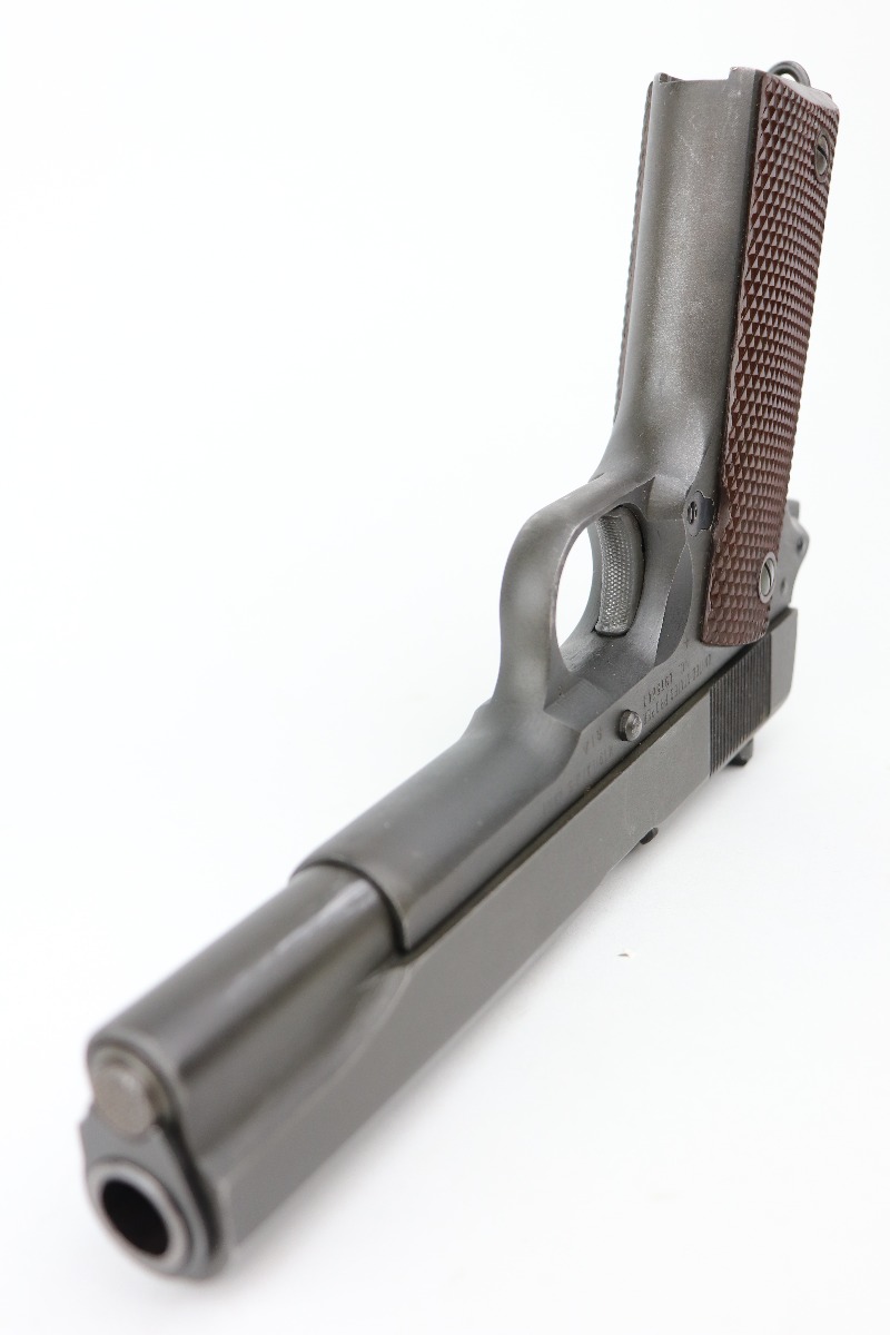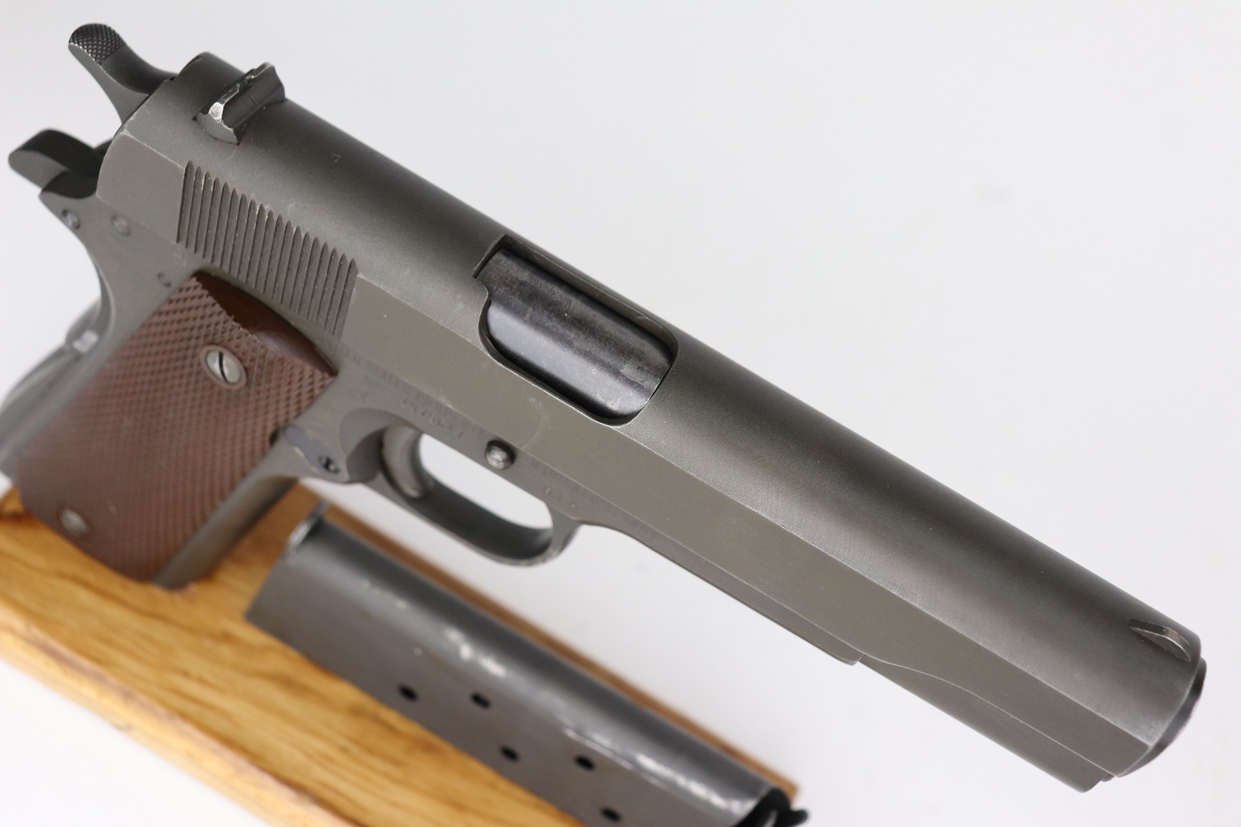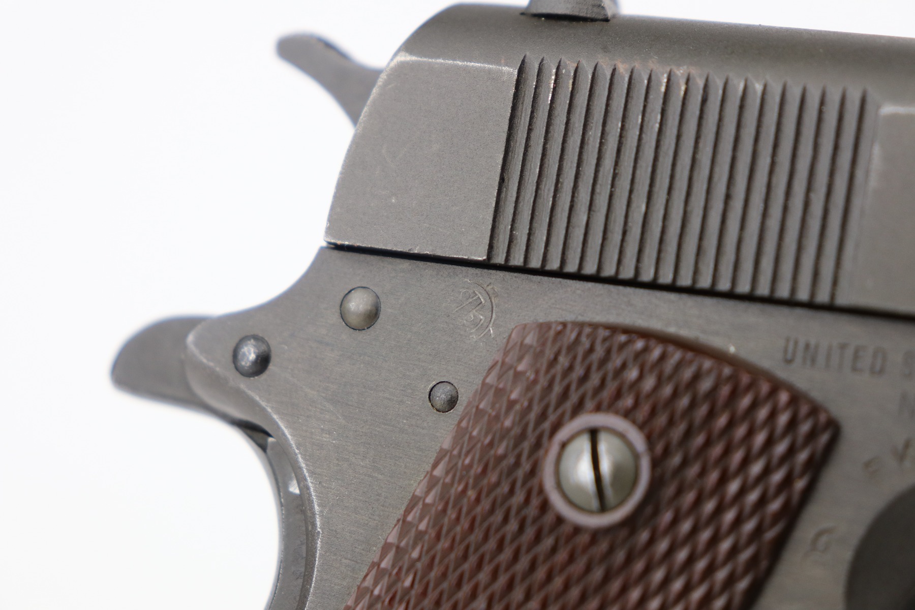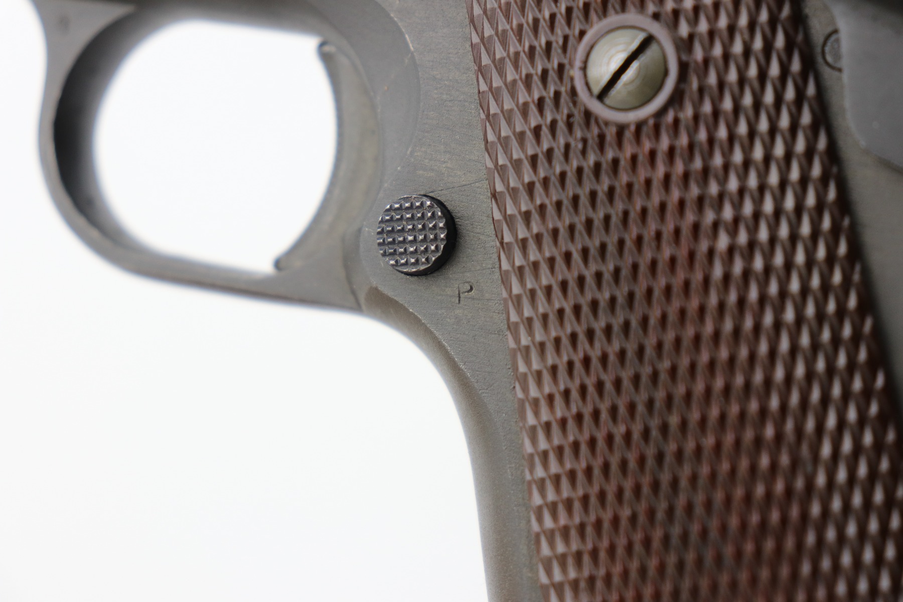 3/25/21 – This is a mint example of a Remington Rand Model 1911A1 issued to the US military in 1944. It is “US Property” marked and has the proper military cartouche. It has “RIA” and “FK” arsenal markings. The finish looks completely original to us, so although it has these arsenal markings, we do not believe it has been refinished. It has a Hi Standard barrel. The gun has retained about 99% of its finish. There is just a small hint of wear around the high edges. It comes with excellent grips and a period-correct magazine. The bore is very nice – shiny with strong rifling and minor freckling in the grooves.