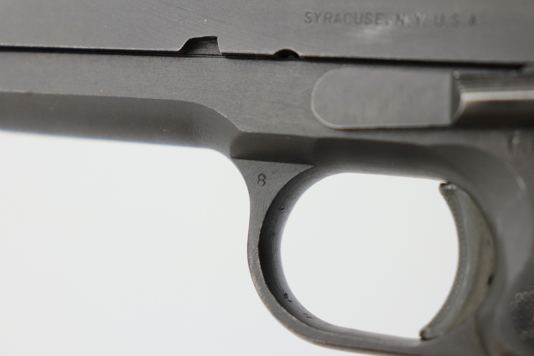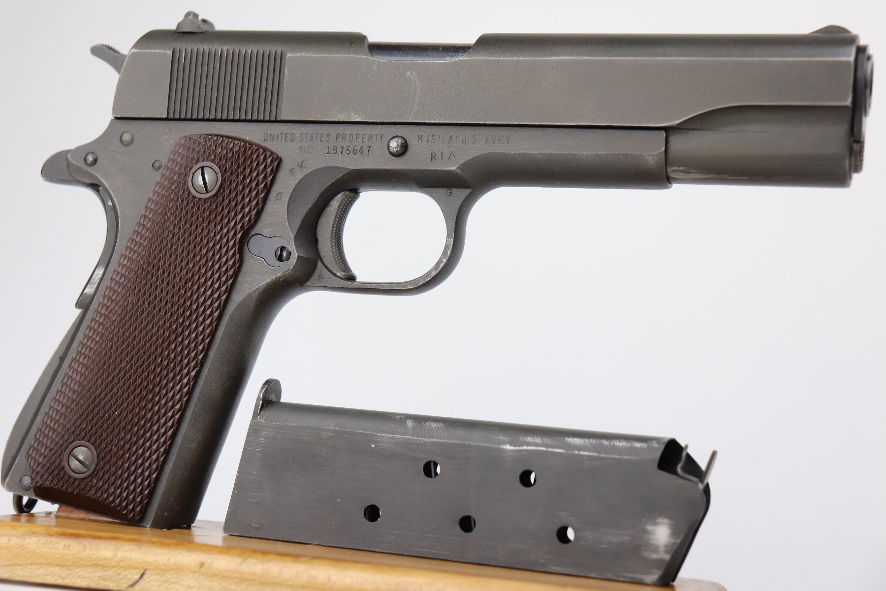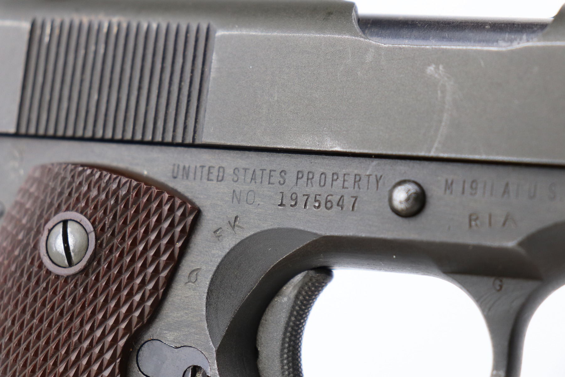3/25/21 – This is a mint example of a Remington Rand Model 1911A1 issued to the US military in 1944. It is “US Property” marked and has the proper military cartouche. It has “RIA” and “FK” arsenal markings. The finish looks completely original to us, so although it has these arsenal markings, we do not believe it has been refinished. It has a Hi Standard barrel. The gun has retained about 99% of its finish. There is just a small hint of wear around the high edges. It comes with excellent grips and a period-correct magazine. The bore is very nice – shiny with strong rifling and minor freckling in the grooves.