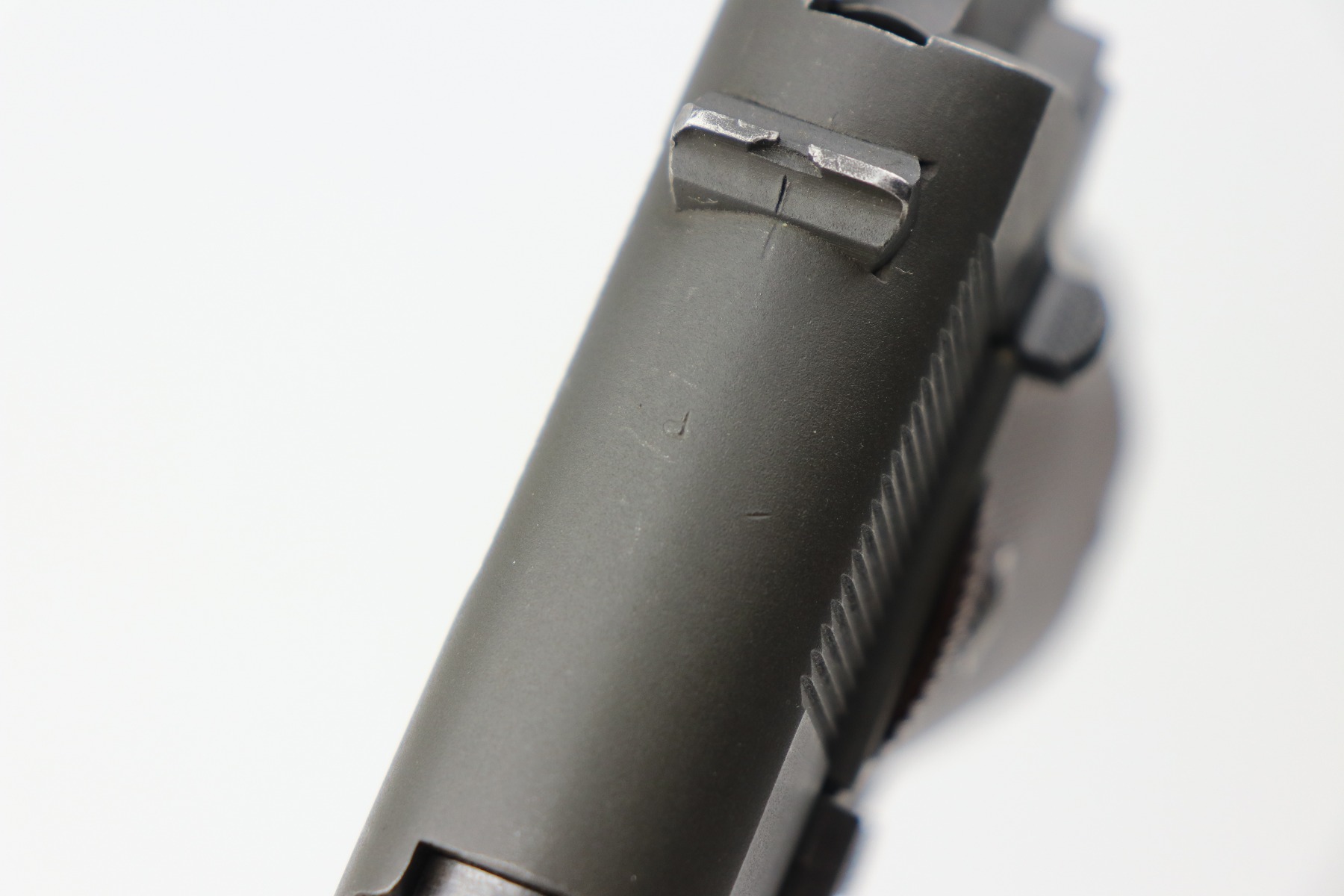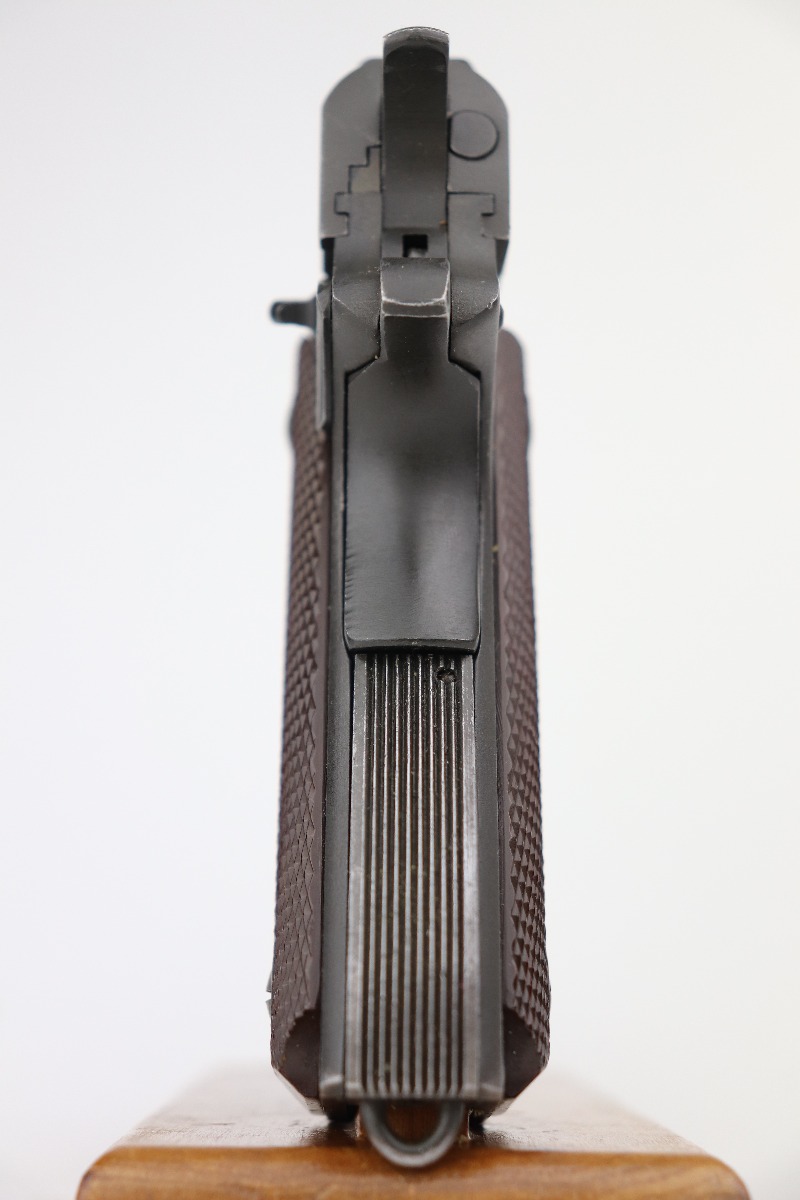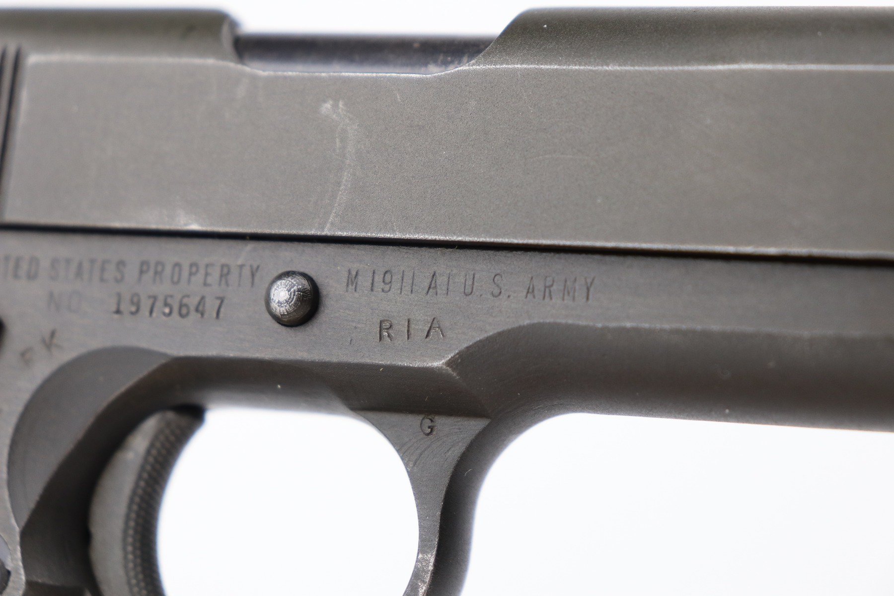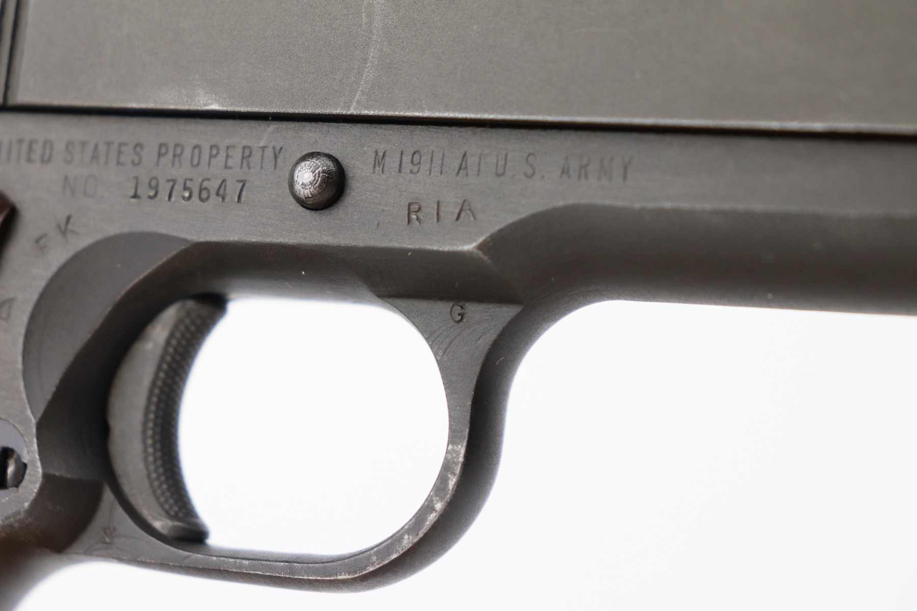 3/25/21 – This is a mint example of a Remington Rand Model 1911A1 issued to the US military in 1944. It is “US Property” marked and has the proper military cartouche. It has “RIA” and “FK” arsenal markings. The finish looks completely original to us, so although it has these arsenal markings, we do not believe it has been refinished. It has a Hi Standard barrel. The gun has retained about 99% of its finish. There is just a small hint of wear around the high edges. It comes with excellent grips and a period-correct magazine. The bore is very nice – shiny with strong rifling and minor freckling in the grooves.