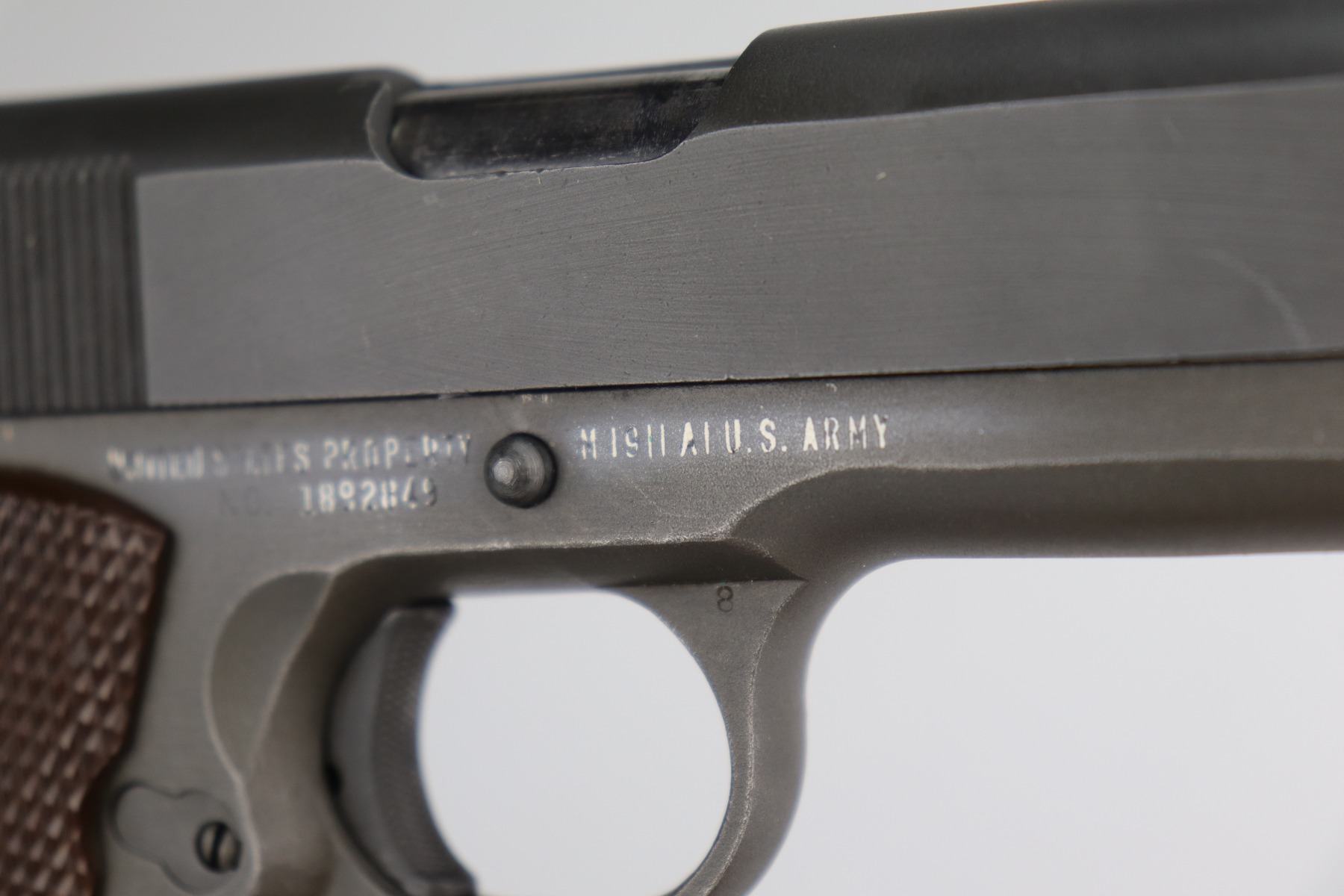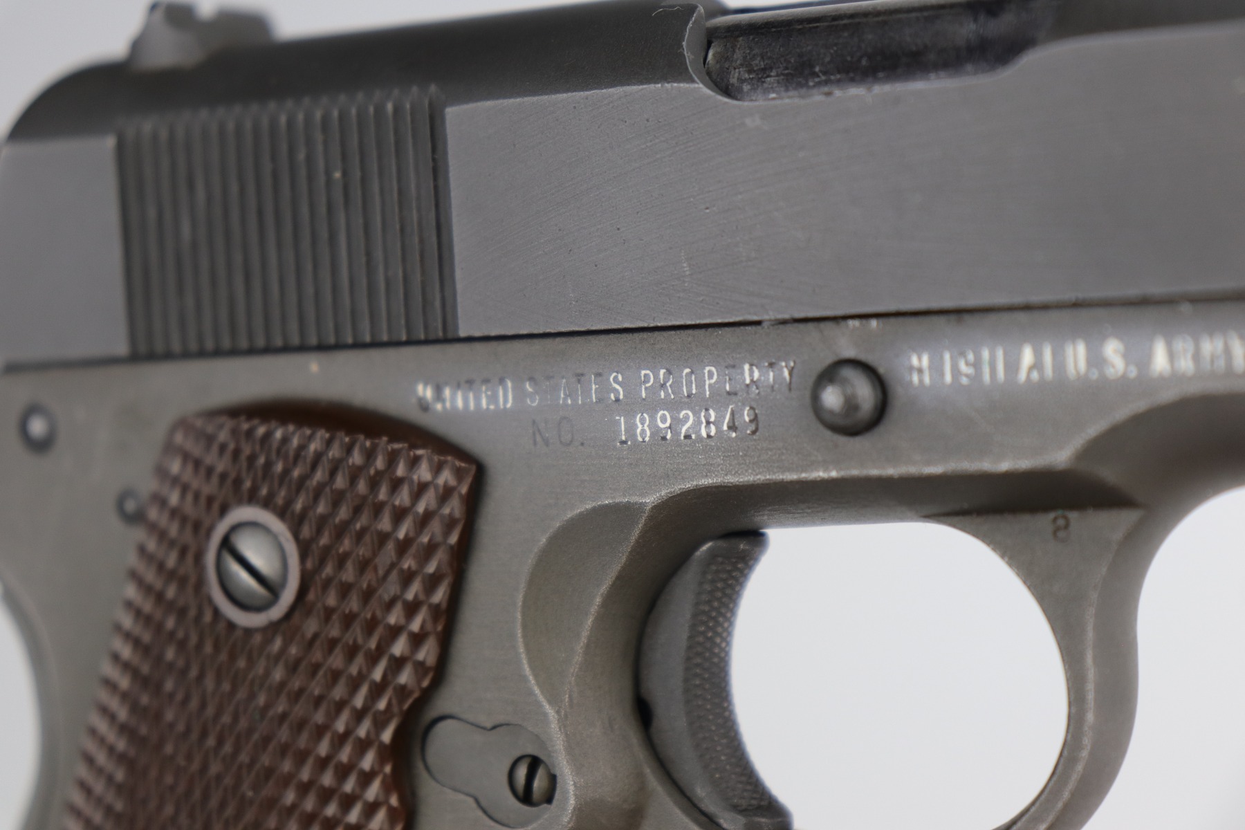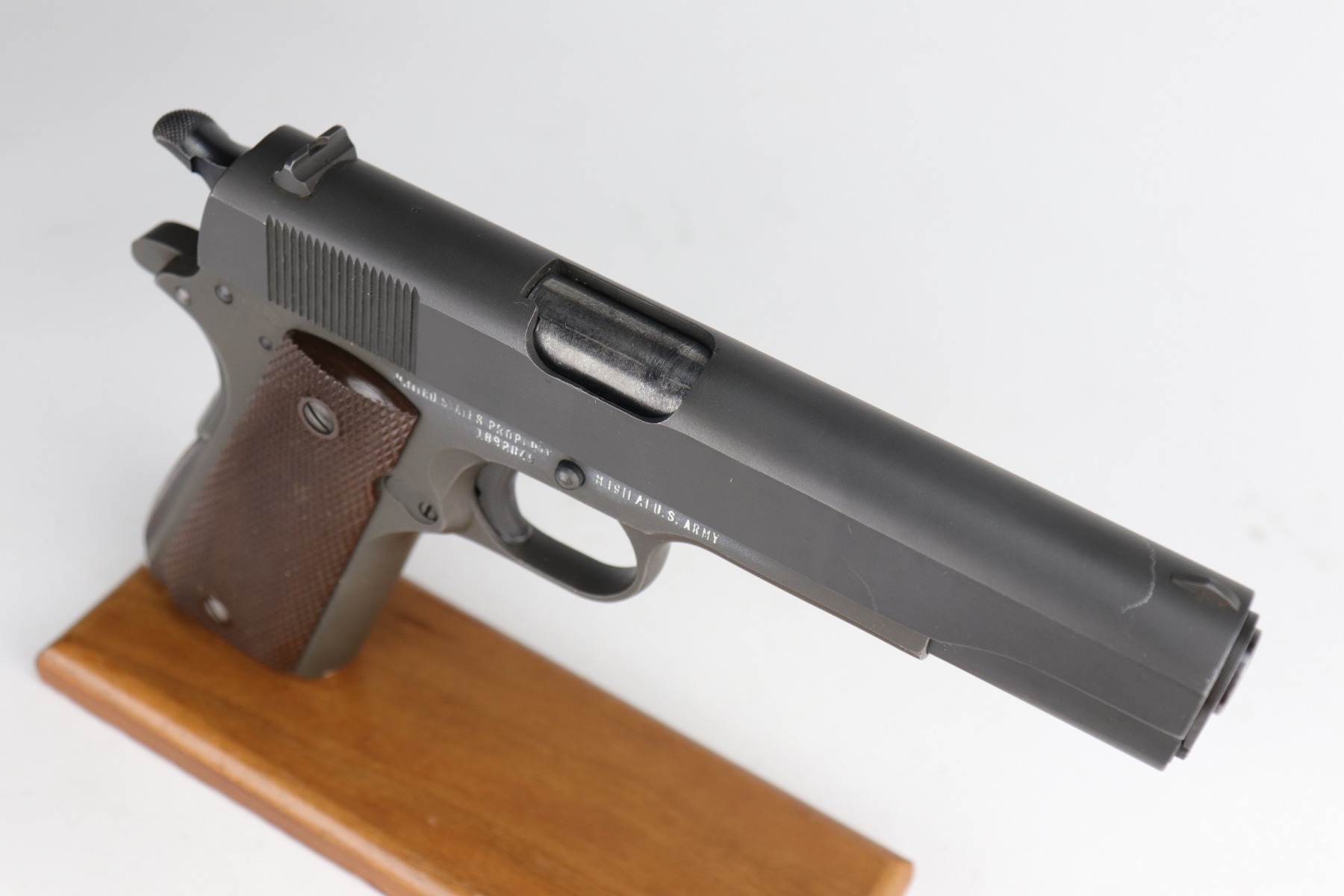 1/4/21 – This is a mint example of a Remington Rand Model 1911A1 issued to the US Military in 1944. It is all correct and has the proper cross-canon military cartouche on the tang. It is in mint condition. There is just one small scratch on the top of the slide and one on the right side of the slide. Comes with excellent grips and a proper magazine. The bore is minty.
