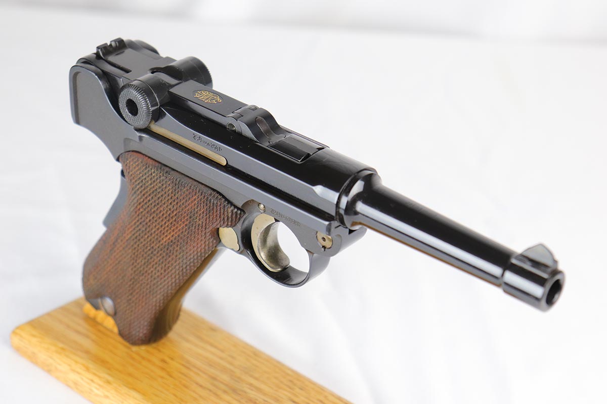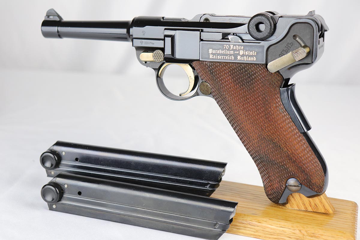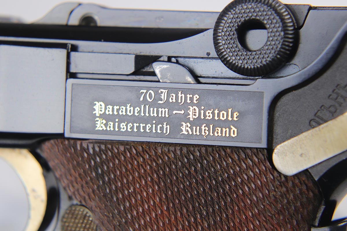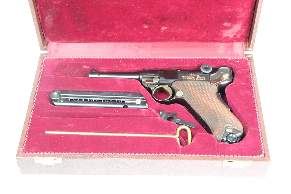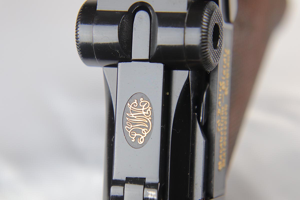 4/27/18 – This is one of the rarest of the 1970s Mauser made lugers – a Russian commemorative luger with crossed Nagant rifles on the chamber. The gun is as new and comes with a nice Mauser marked presentation case with all the accessories. The gun is gold engraved on the left side, designating it as a “Russian model”. Only 250 of these sets were made to commemorate the rare Russian model, made in very limited numbers in the early 1900s. The metal finish and the blueing are impressive, rivaling the pre-war guns. A superb limited production presentation set.
