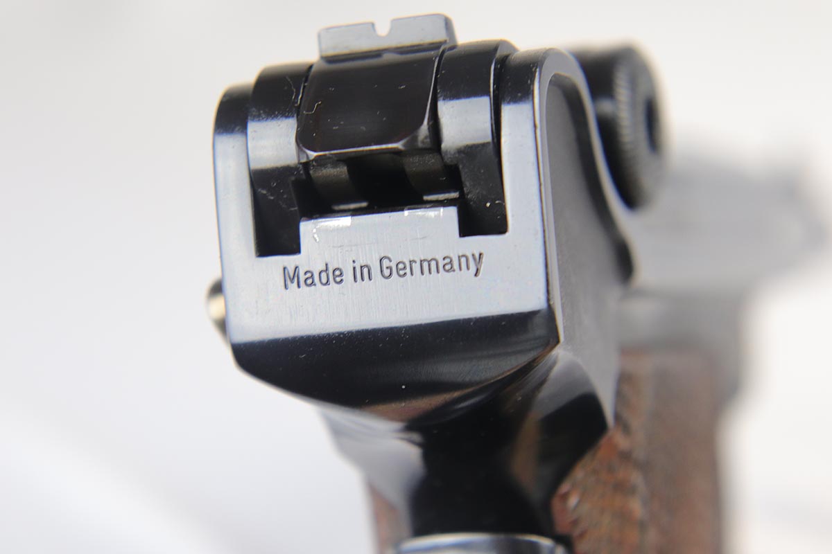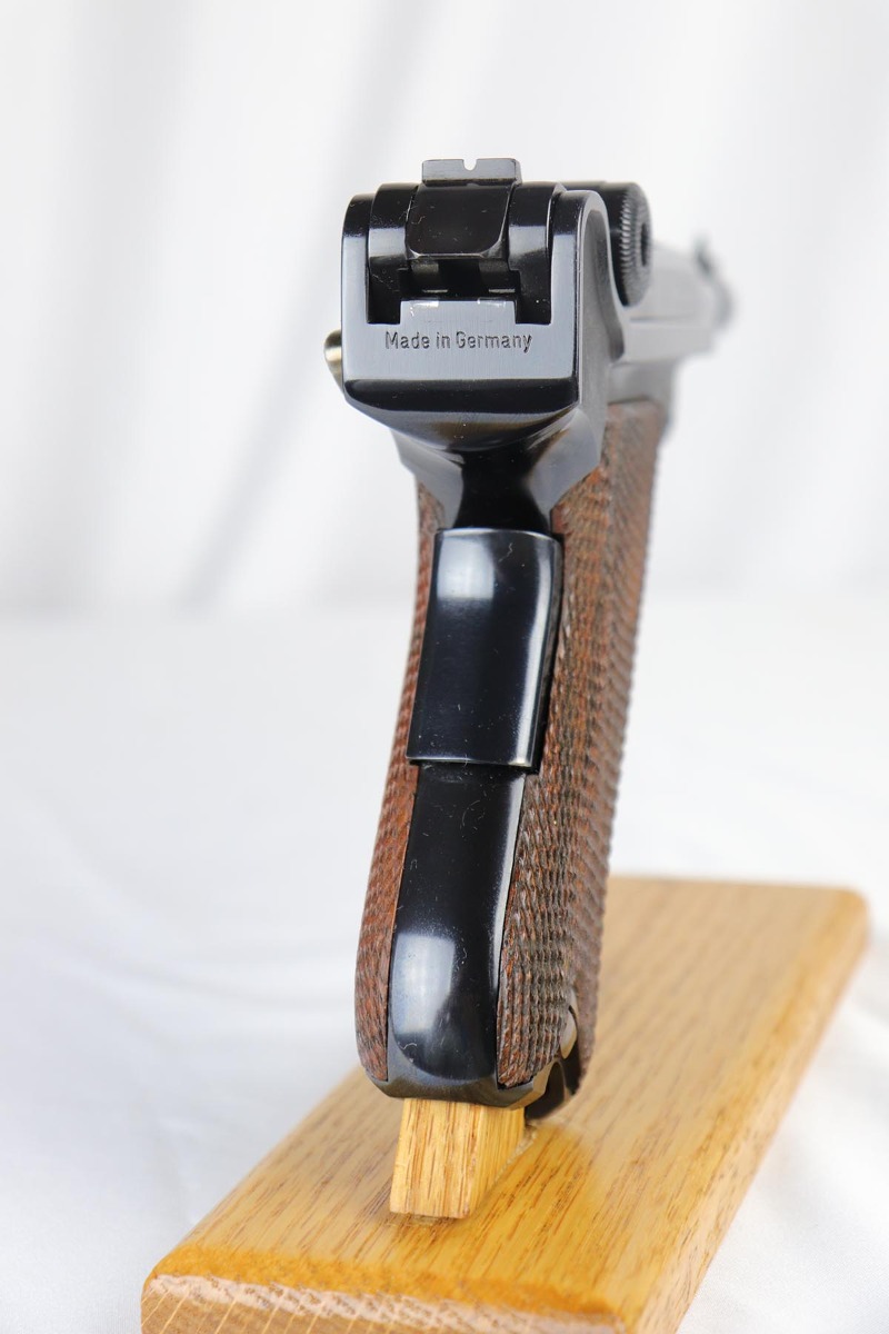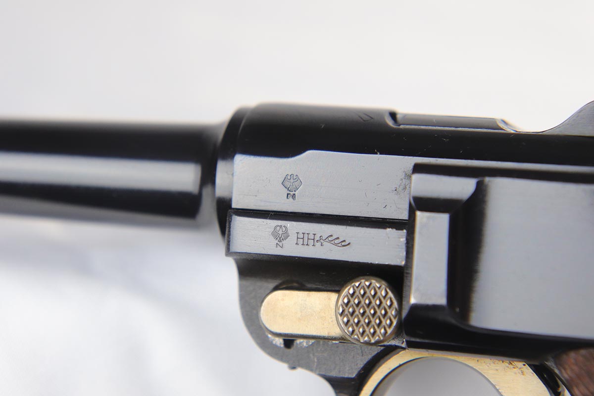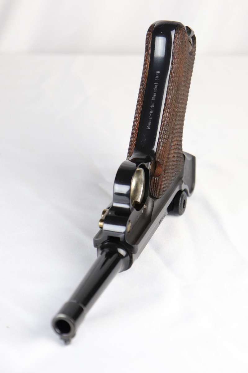 4/27/18 – This is one of the rarest of the 1970s Mauser made lugers – a Russian commemorative luger with crossed Nagant rifles on the chamber. The gun is as new and comes with a nice Mauser marked presentation case with all the accessories. The gun is gold engraved on the left side, designating it as a “Russian model”. Only 250 of these sets were made to commemorate the rare Russian model, made in very limited numbers in the early 1900s. The metal finish and the blueing are impressive, rivaling the pre-war guns. A superb limited production presentation set.