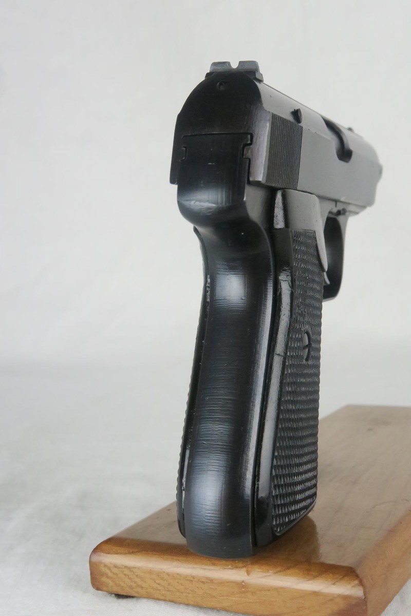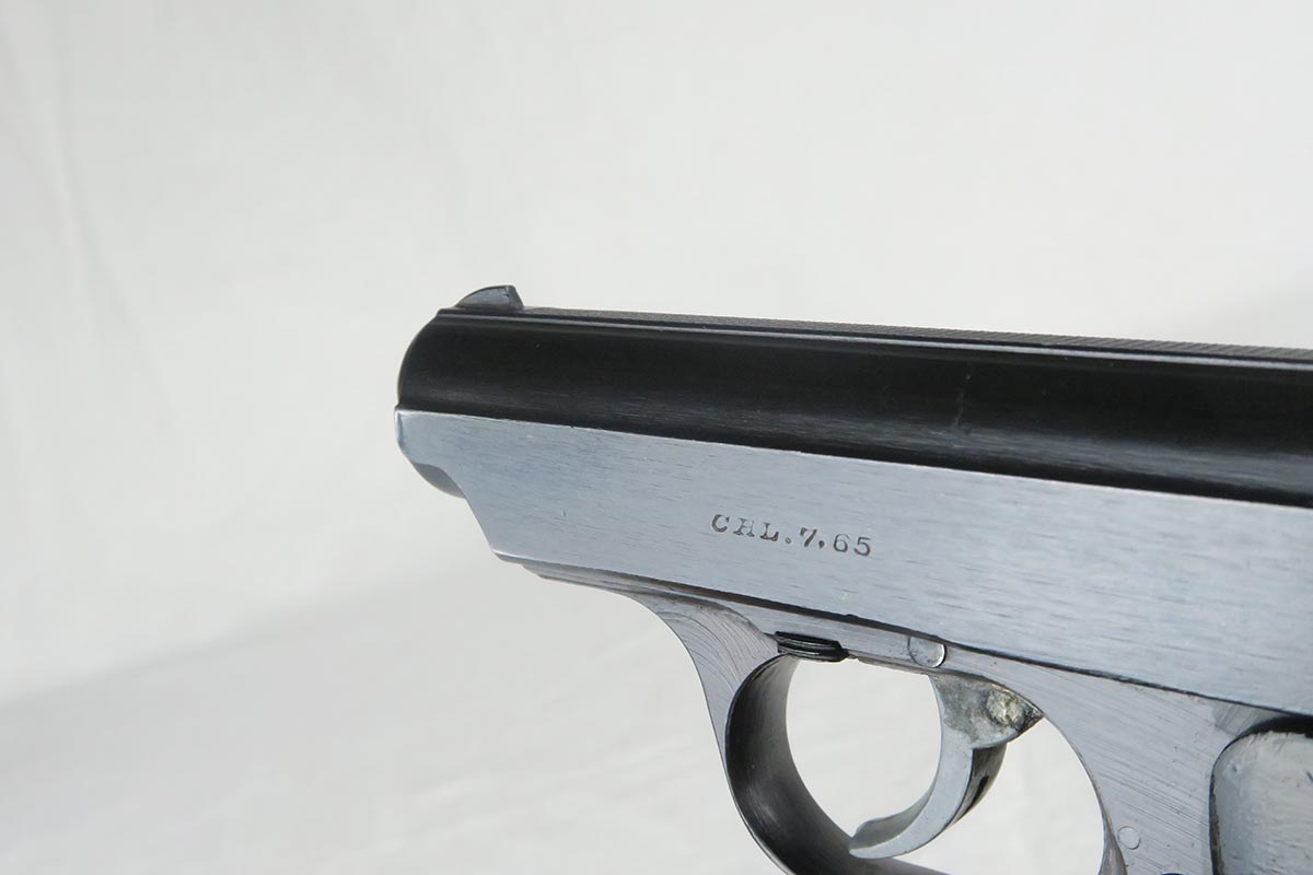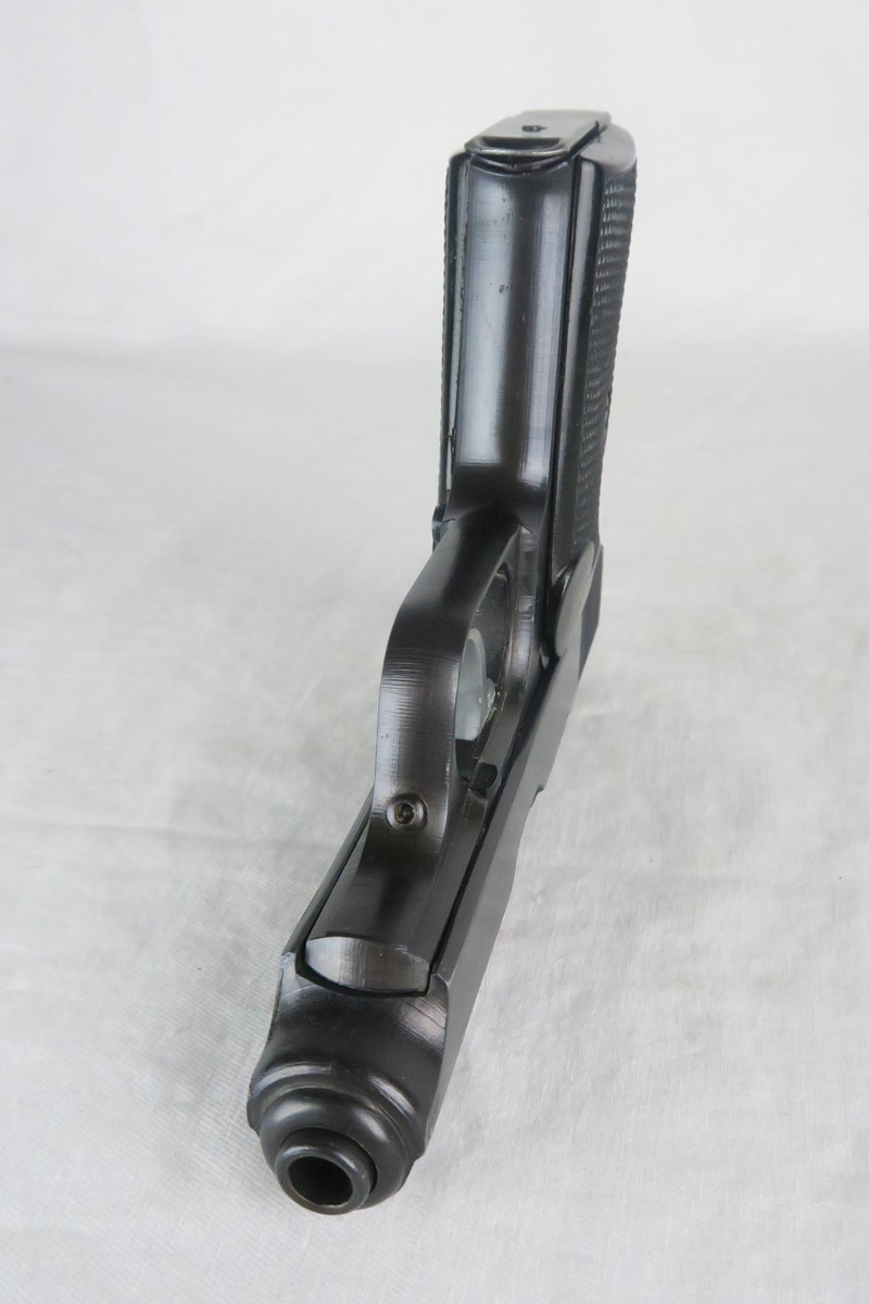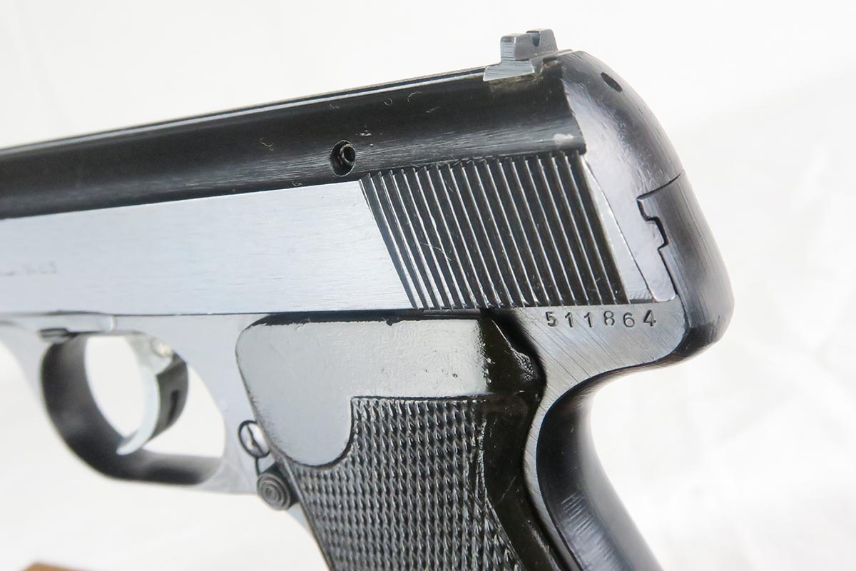 12/15/17 – This is a fairly rare and unique Sauer 38h, as it has no test or firing proofs on the gun.  The serial makes it one that was made in the last month or so of the war (April, 1945).  The fact that it has no proofs indicates that it was in the factory, unissued, at the end and most likely picked up by the GI’s or sent out the door in a rush without any kind of inspection.   The original finish is 99% with only minor muzzle wear.  Matching slide and frame.  7.65 caliber with excellent bore.   The grips and magazine are also late war correct. There is no safety and no de-cocker, both late war features.   One flaw in the design of these guns (and you will see it often if you handle a lot of them) is that when the grip screw are tightened all the way down, the magazine is hard to get in and out.  So we loosen the grips a bit and it works well but then the grips have a bit of wiggle in them.  Otherwise a very fine design, with easy take down and firing mechanism.  Works in both double and single action.