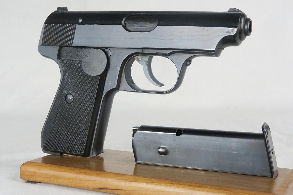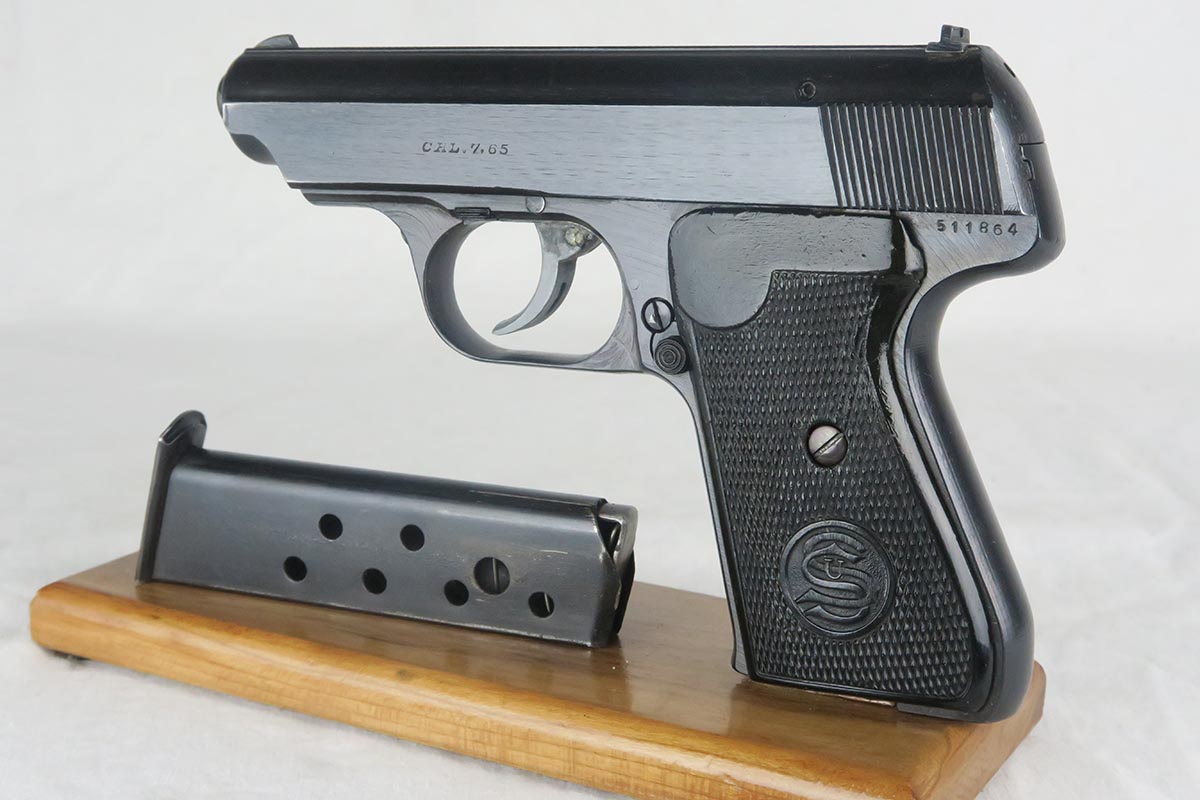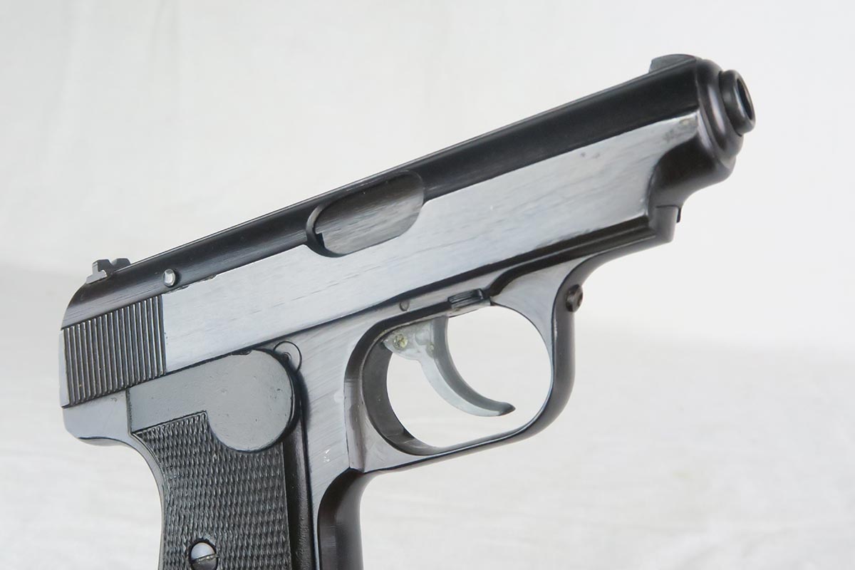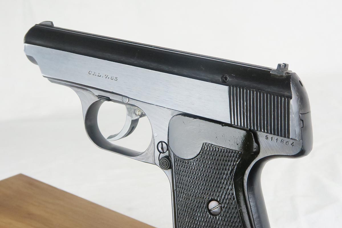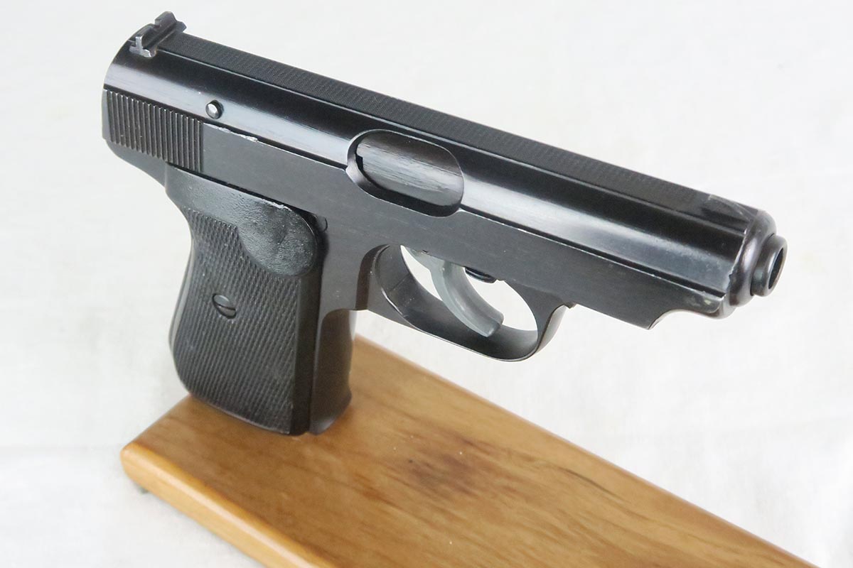 12/15/17 – This is a fairly rare and unique Sauer 38h, as it has no test or firing proofs on the gun.  The serial makes it one that was made in the last month or so of the war (April, 1945).  The fact that it has no proofs indicates that it was in the factory, unissued, at the end and most likely picked up by the GI’s or sent out the door in a rush without any kind of inspection.   The original finish is 99% with only minor muzzle wear.  Matching slide and frame.  7.65 caliber with excellent bore.   The grips and magazine are also late war correct. There is no safety and no de-cocker, both late war features.   One flaw in the design of these guns (and you will see it often if you handle a lot of them) is that when the grip screw are tightened all the way down, the magazine is hard to get in and out.  So we loosen the grips a bit and it works well but then the grips have a bit of wiggle in them.  Otherwise a very fine design, with easy take down and firing mechanism.  Works in both double and single action.