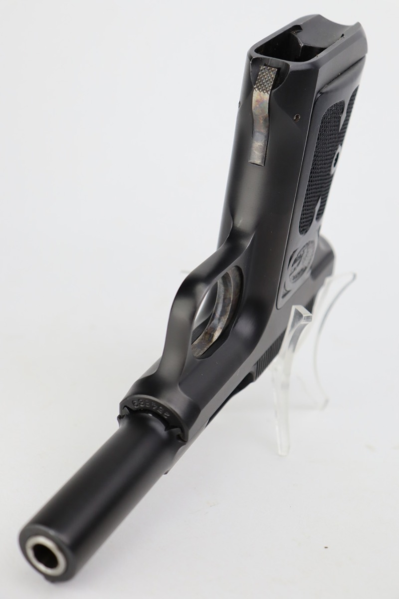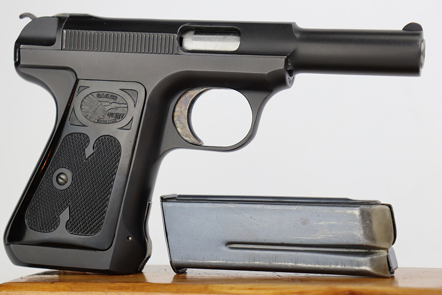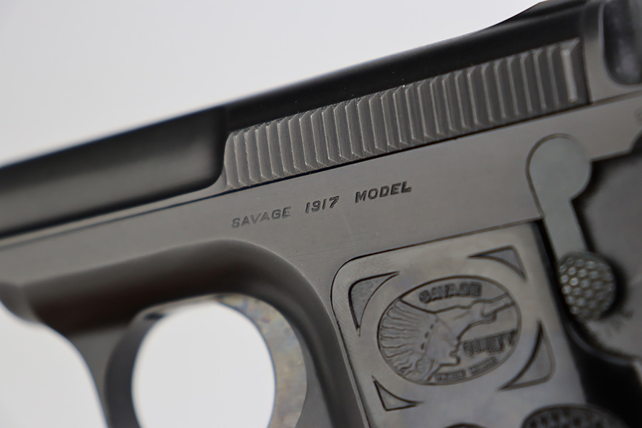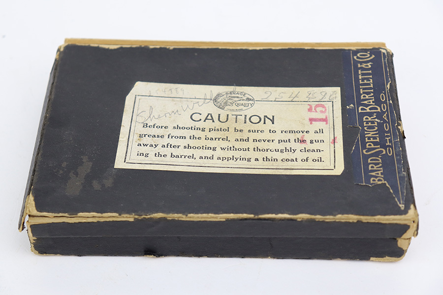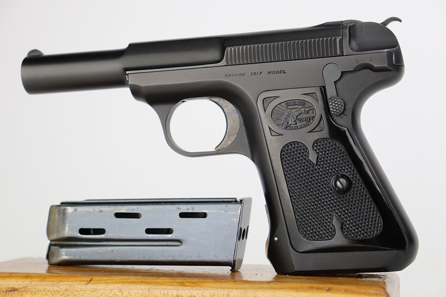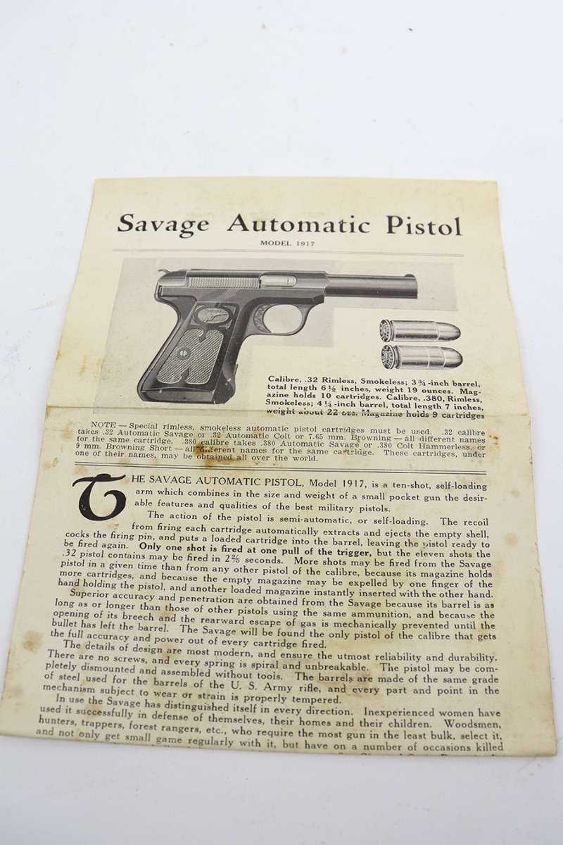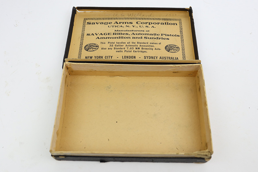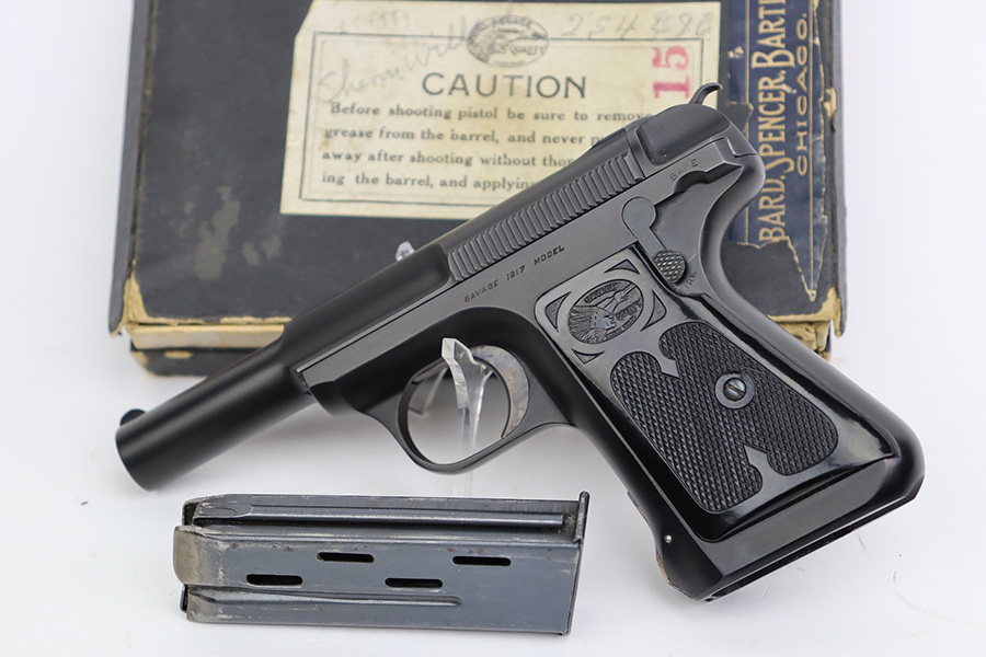7/31/23 – This is mint condition Savage 1917 pistol in its original box, manufactured in 1923 and chambered in .32 ACP. The box is serialized with handwritten numbers, and listing also includes the original owners manual. The gun has retained nearly all of its original finish, with no wear to note. Bore is pristine. Excellent grips.