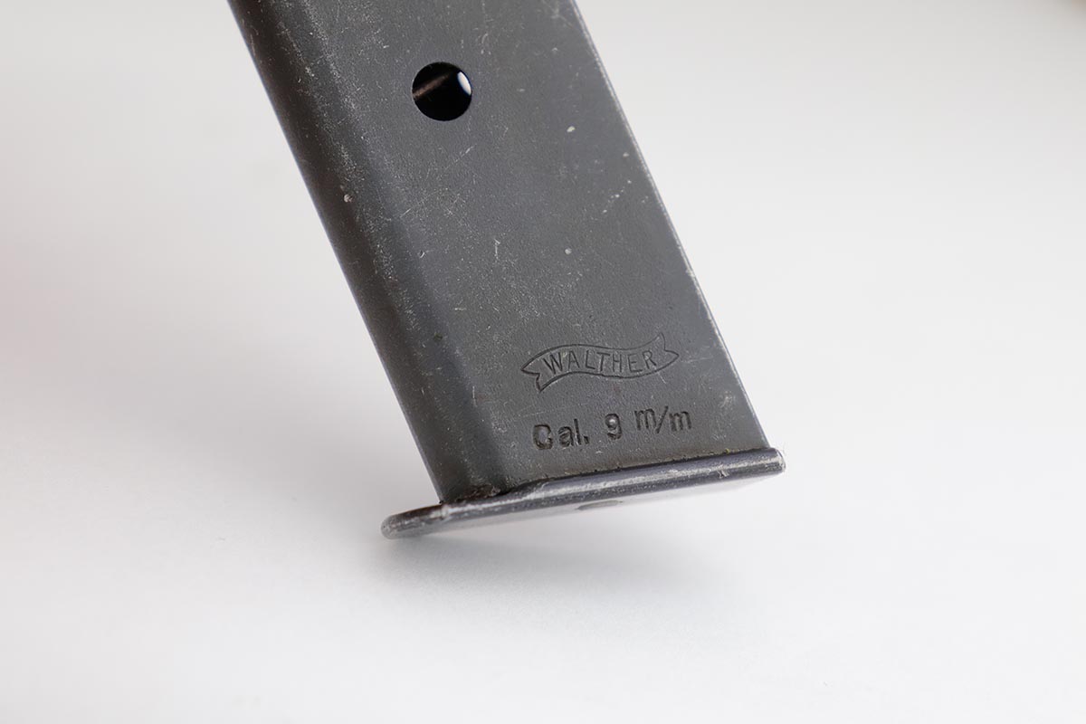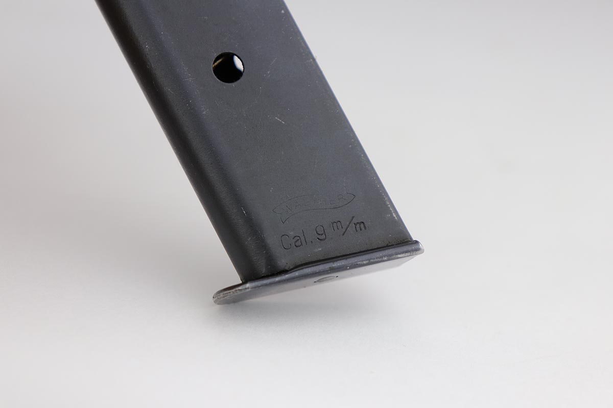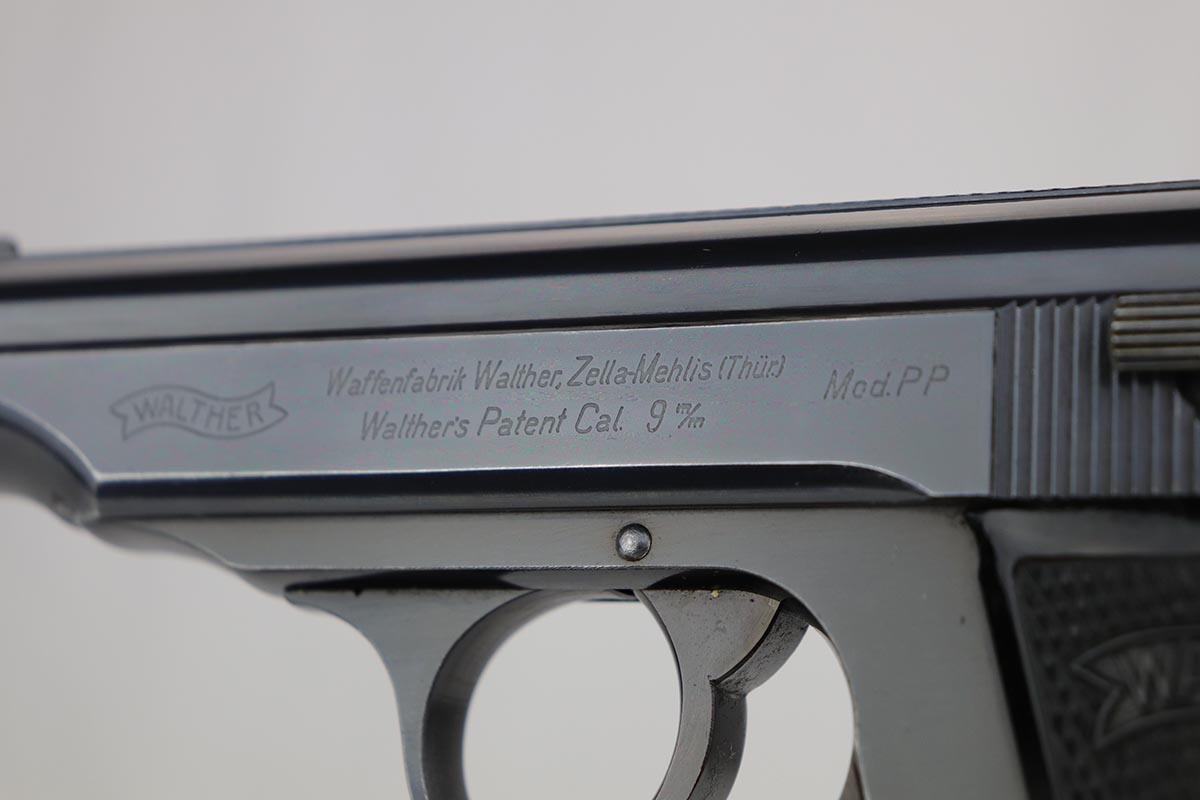 8/27/19 – This is a minty Walther PP rig from the Nazi era, chambered the desirable and less commonly seen 9mm Kurz. The pistol retains 99% high-polish blue, with just a hint of wear on the muzzle and mag release from being in the holster. Minty bore and grips, too. Rig includes two correct magazines. It is completed by an excellent but unmarked holster from the time period.