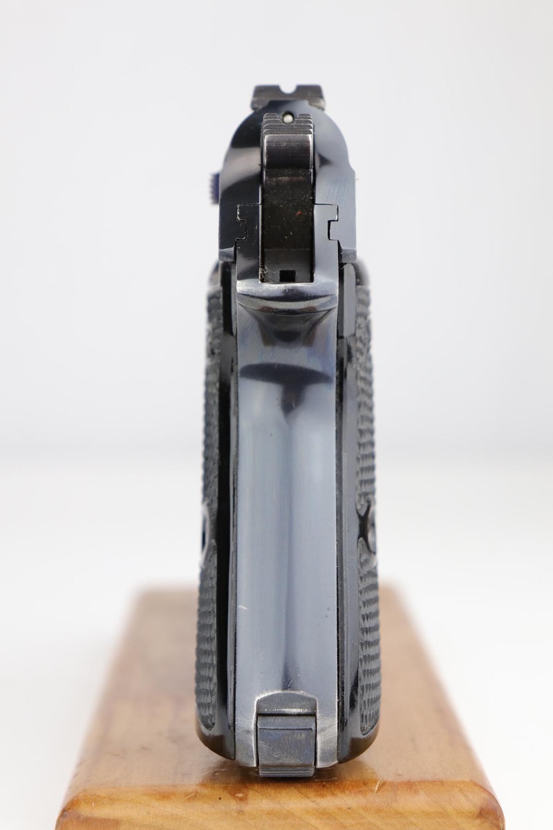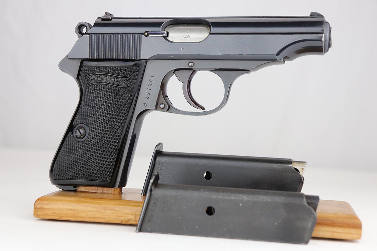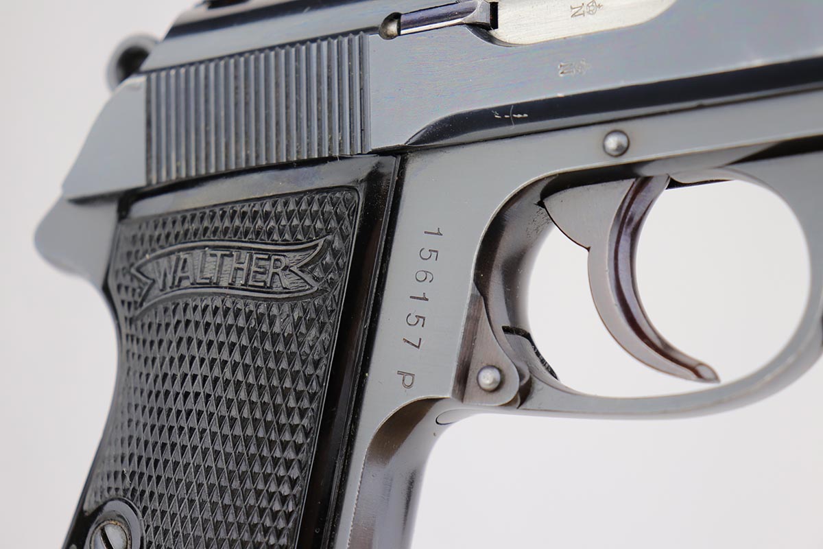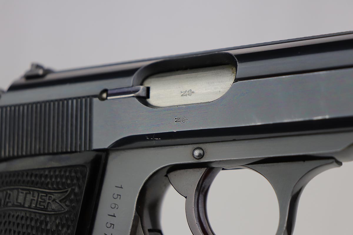8/27/19 – This is a minty Walther PP rig from the Nazi era, chambered the desirable and less commonly seen 9mm Kurz. The pistol retains 99% high-polish blue, with just a hint of wear on the muzzle and mag release from being in the holster. Minty bore and grips, too. Rig includes two correct magazines. It is completed by an excellent but unmarked holster from the time period.
