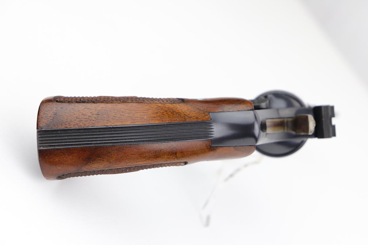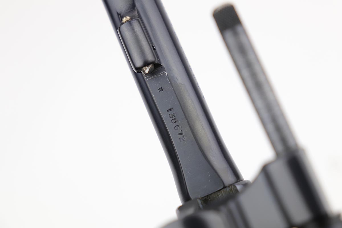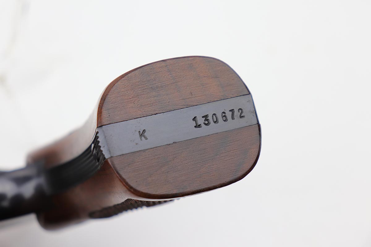 9/27/19 – This is a Smith & Wesson K-22 Masterpiece in nearly unused condition. It has 99% blue with a minor roll mark on the cylinder, and small hints of high edge wear. Beautiful case-hardening is present on the trigger and hammer. Excellent grips with only minor handling wear. Right panel is matching to the revolver while left panel is correctly unnumbered. Mint bore. Serial dates this one to about 1951.