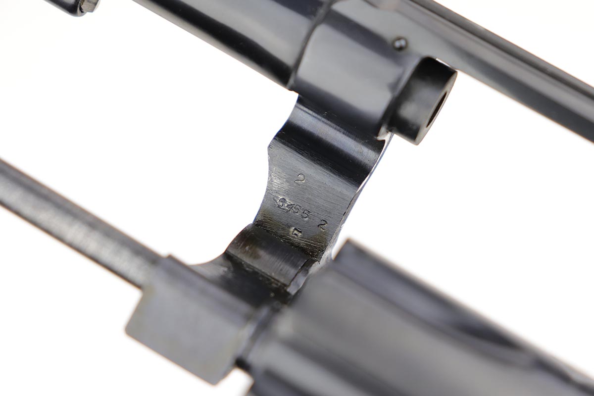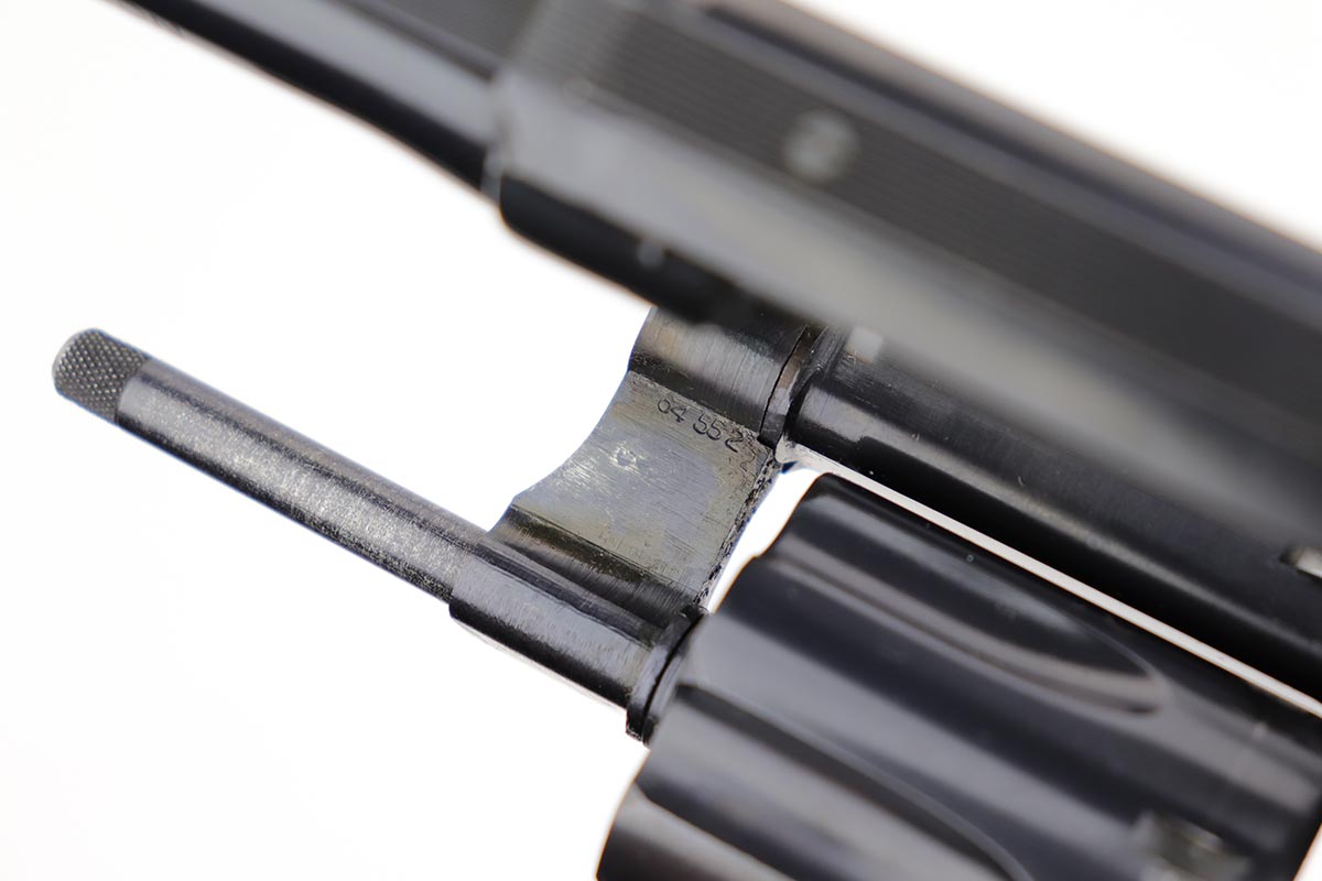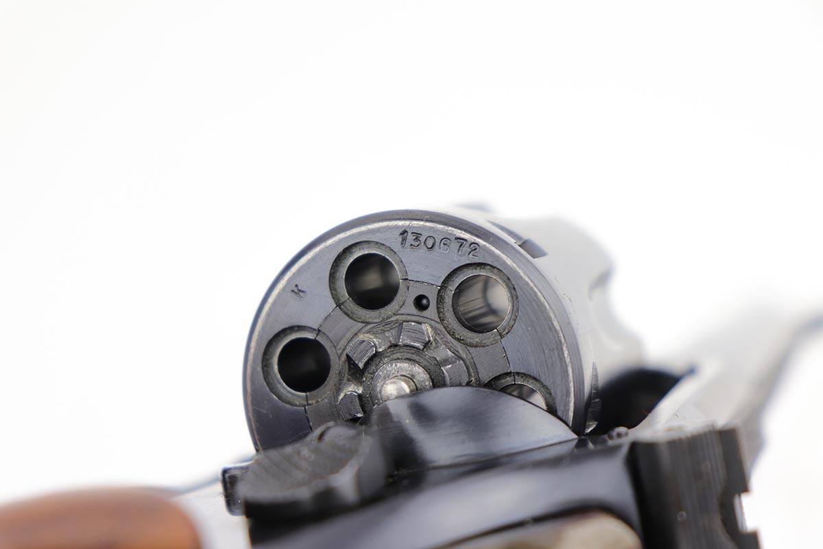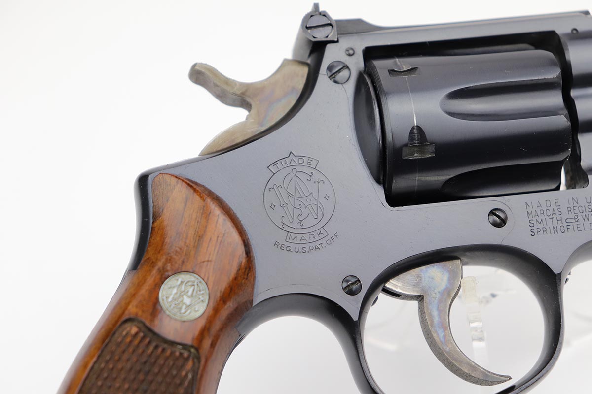 9/27/19 – This is a Smith & Wesson K-22 Masterpiece in nearly unused condition. It has 99% blue with a minor roll mark on the cylinder, and small hints of high edge wear. Beautiful case-hardening is present on the trigger and hammer. Excellent grips with only minor handling wear. Right panel is matching to the revolver while left panel is correctly unnumbered. Mint bore. Serial dates this one to about 1951.