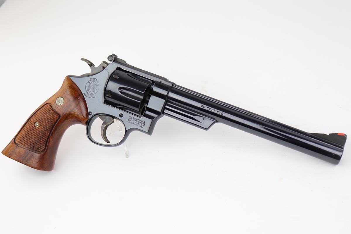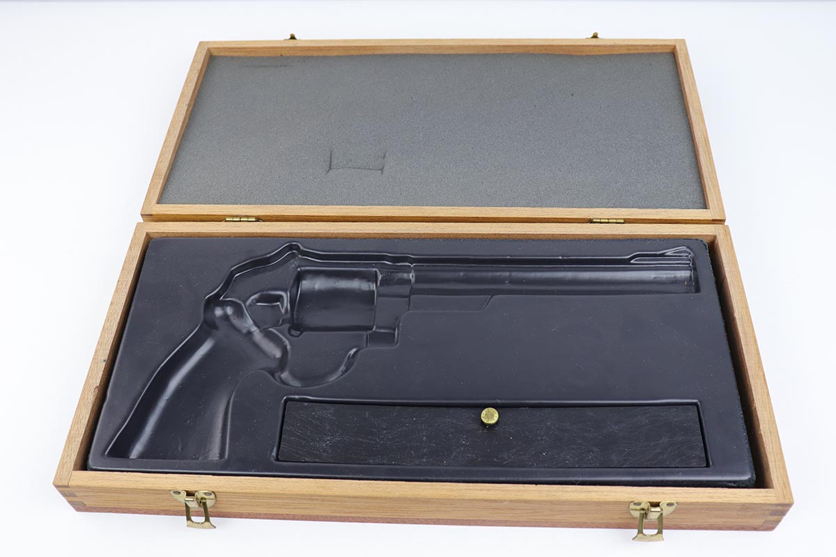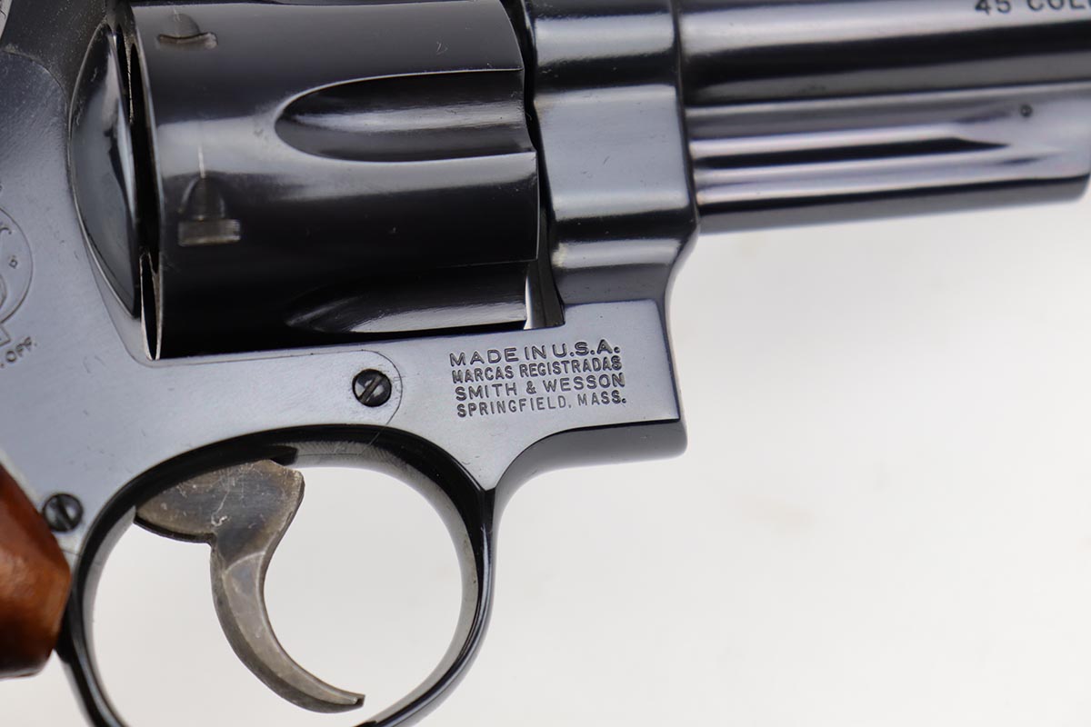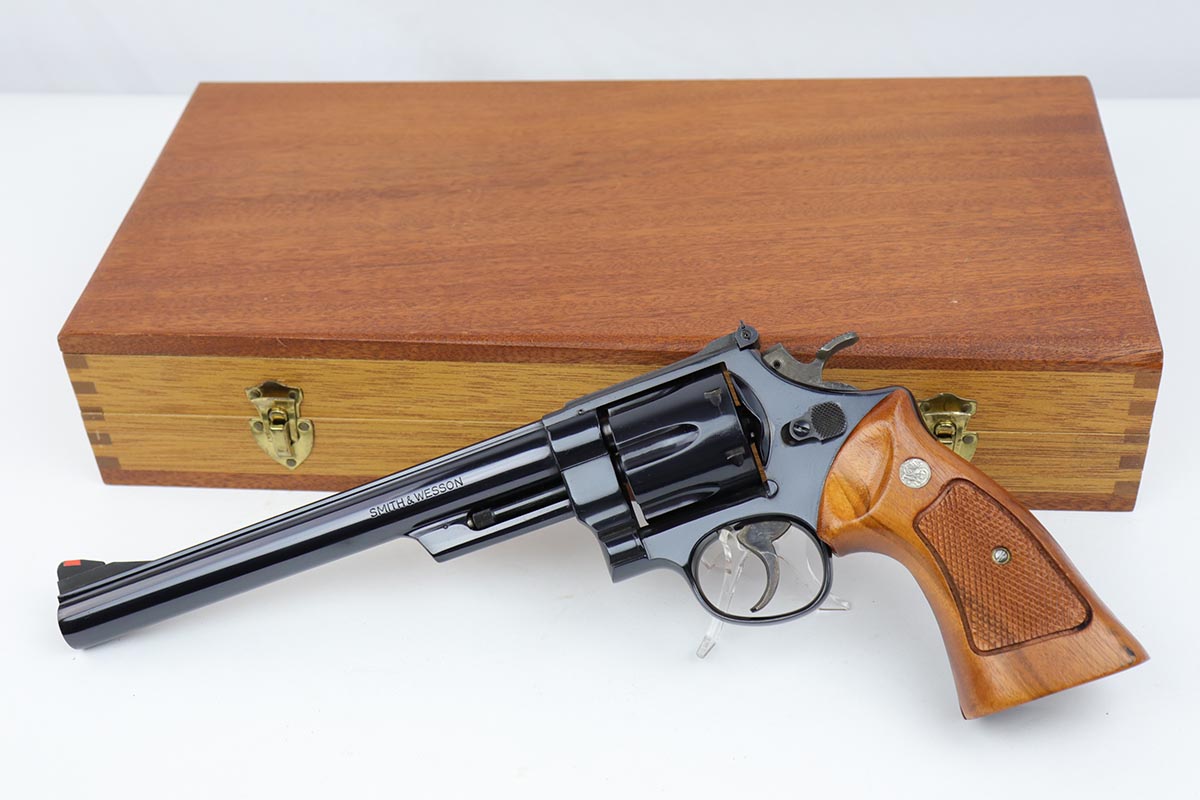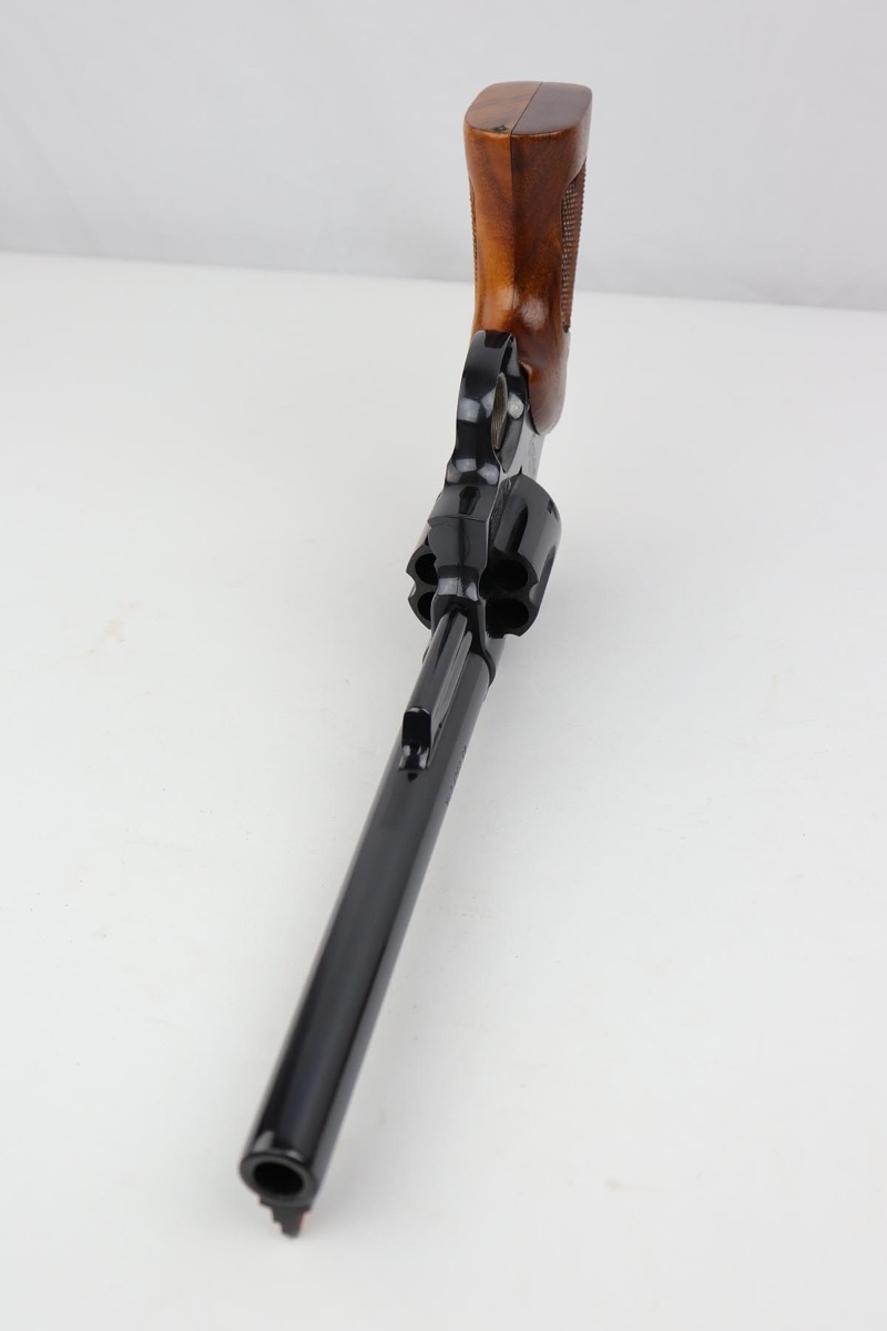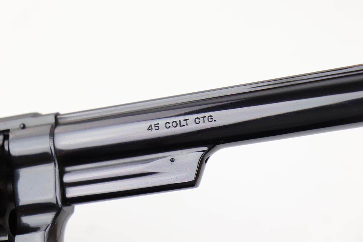 5/9/19 – This is a mint example of a Smith & Wesson model 25-5 revolver, chambered in .45 Colt, with 8 & 3/8 inch barrel. The revolver shows virtually no finish loss, with just a hint of roll mark on the cylinder. Perfect mechanics, bore and grips. Very nice case hardening on hammer and trigger. The revolver is accompanied by a very nice, wooden case and spare cleaning kit. This barrel length was used on later manufactured revolvers, so likely dates to the 1980s and requires an FFL.