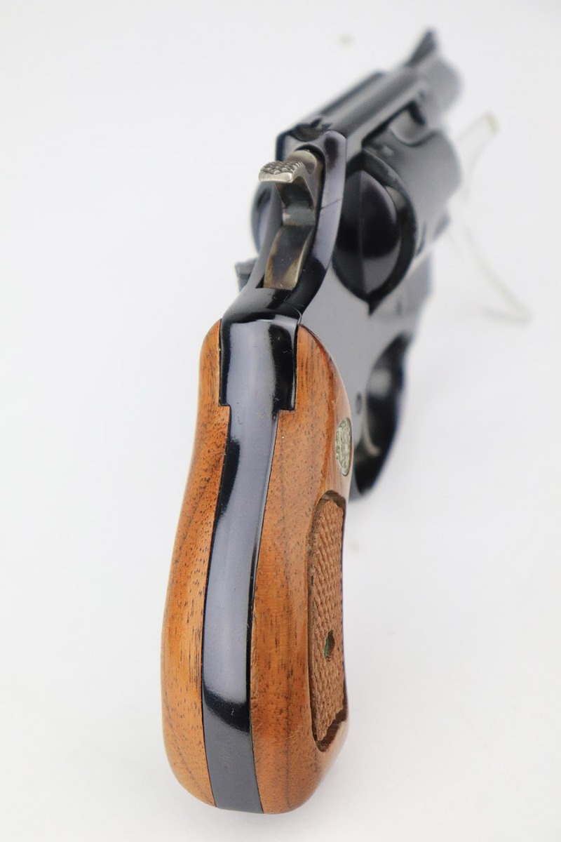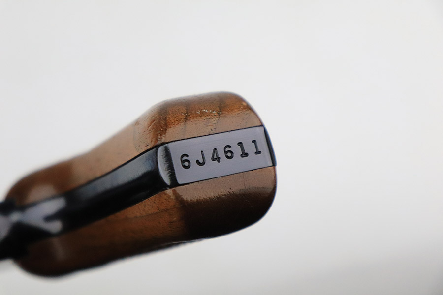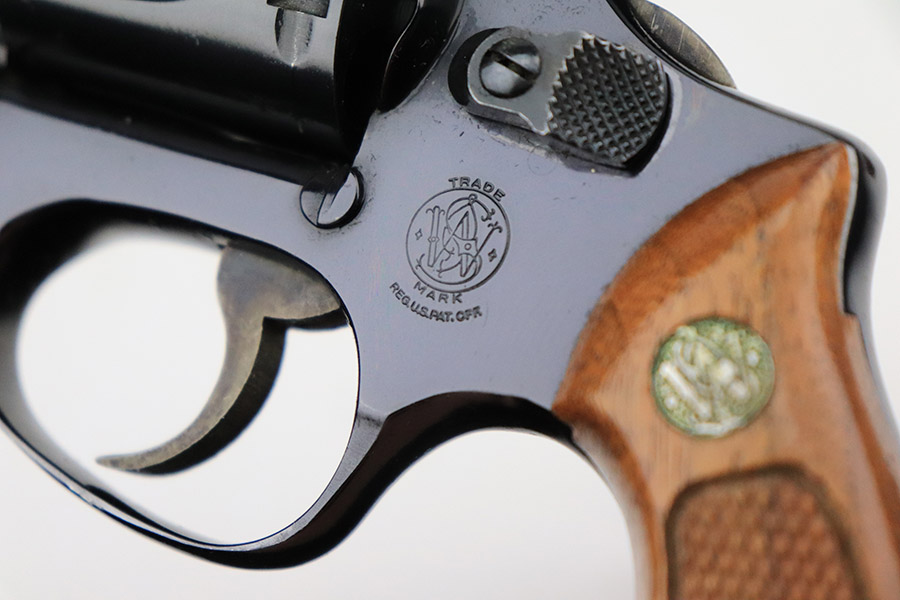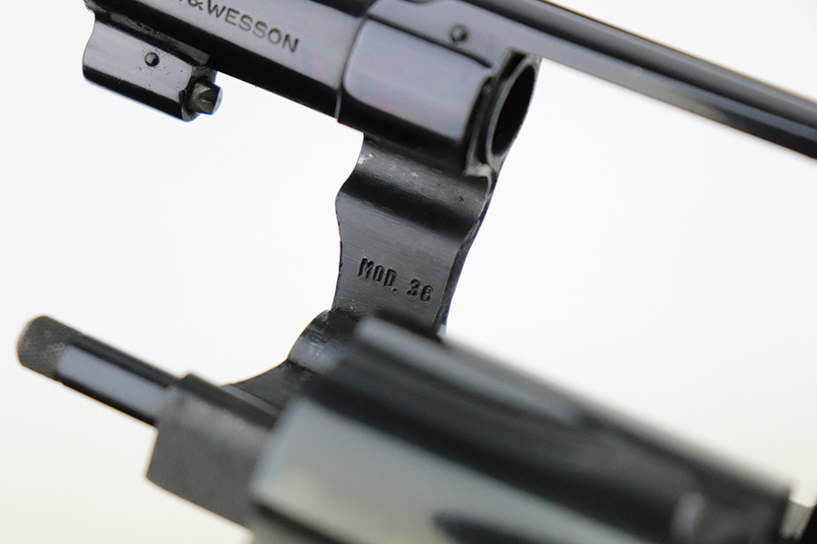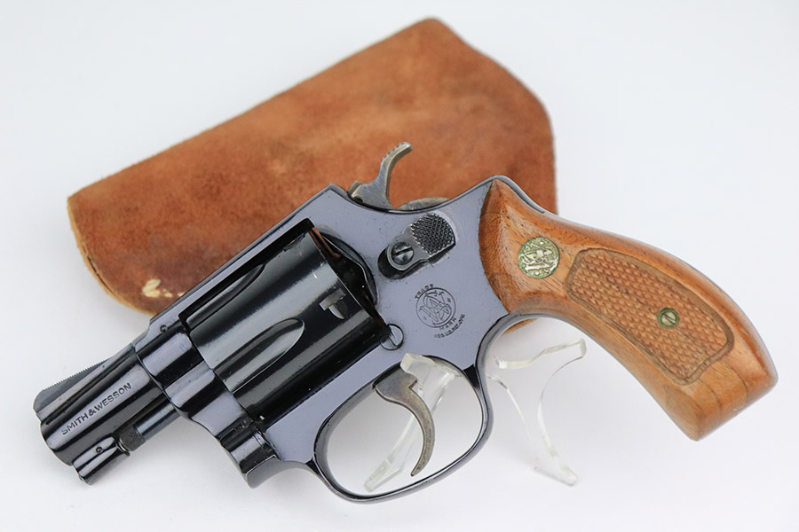 10/26/22 – This is a mint example of a Smith & Wesson Model 36 revolver, manufactured in the late 1960’s and chambered in .38 Special. 2″ barrel. The gun is in like-new condition with essentially no signs of wear or use – just the slightest hint of a roll mark on the cylinder. Excellent case-hardening on the hammer and trigger. Comes with minty hand-checkered wood grips with a matching number on the right grip panel. Mint bore. The cylinder is tight, and the action is smooth. Comes with a nice soft leather holster.
