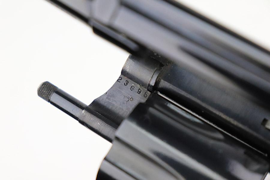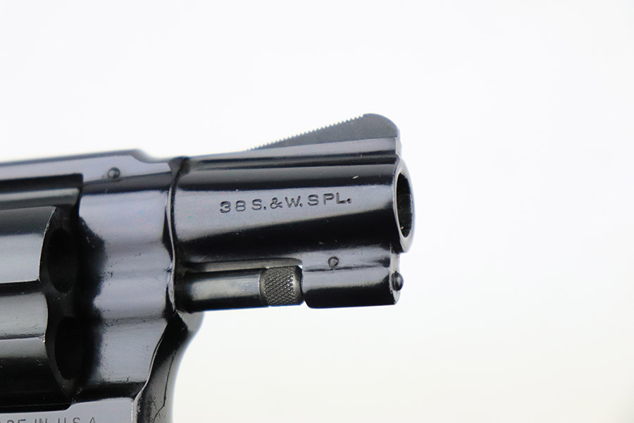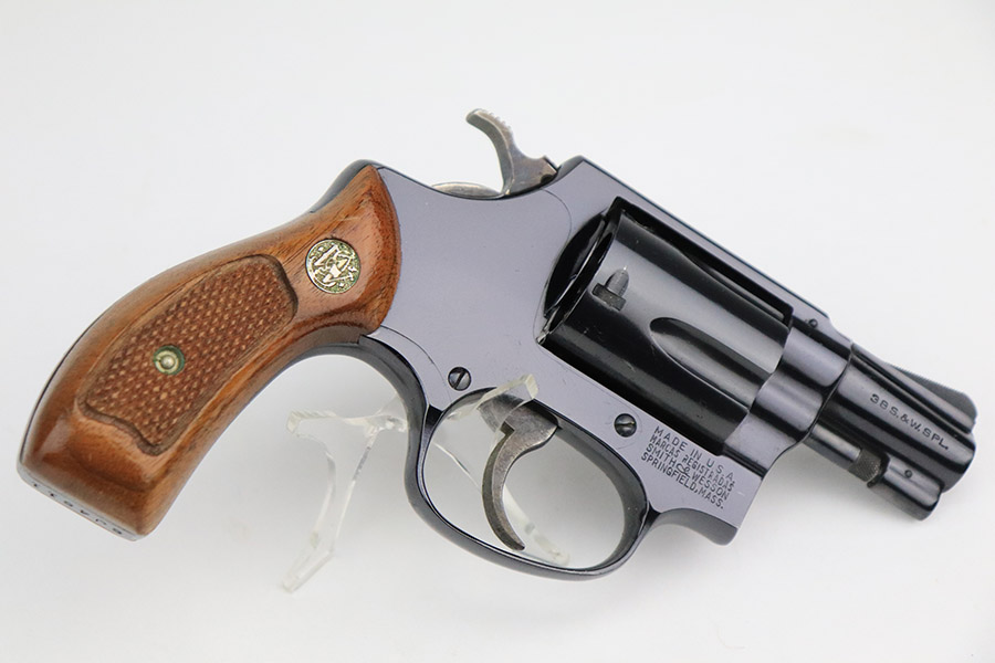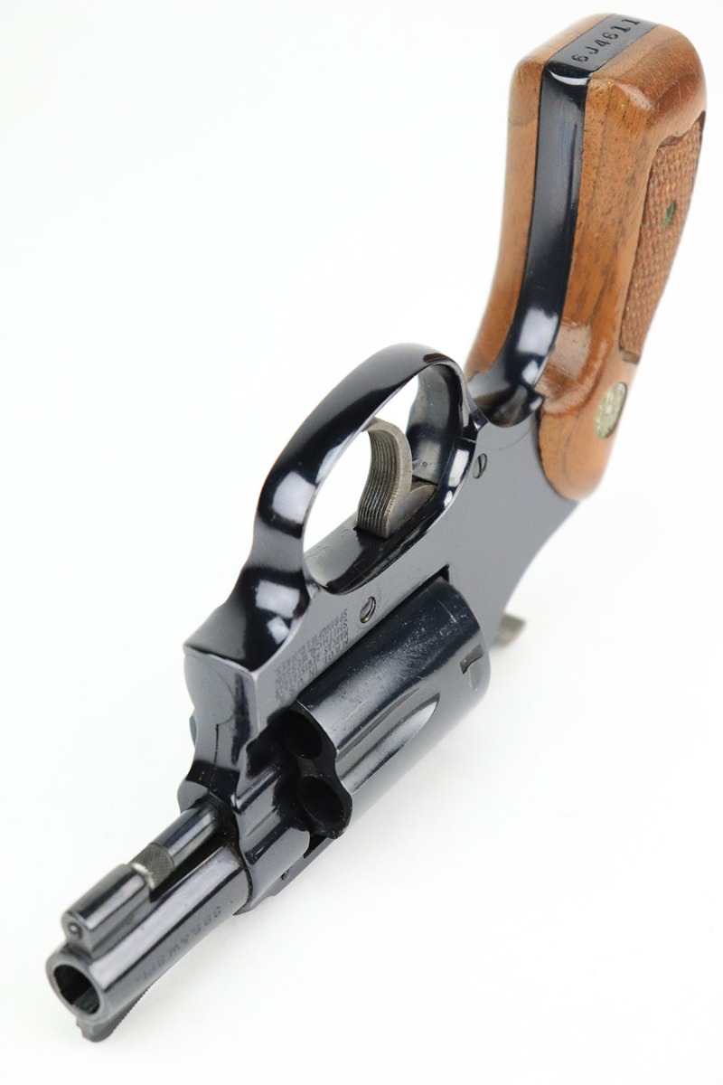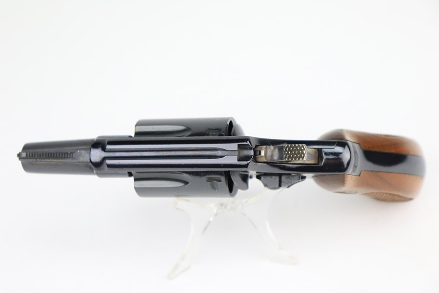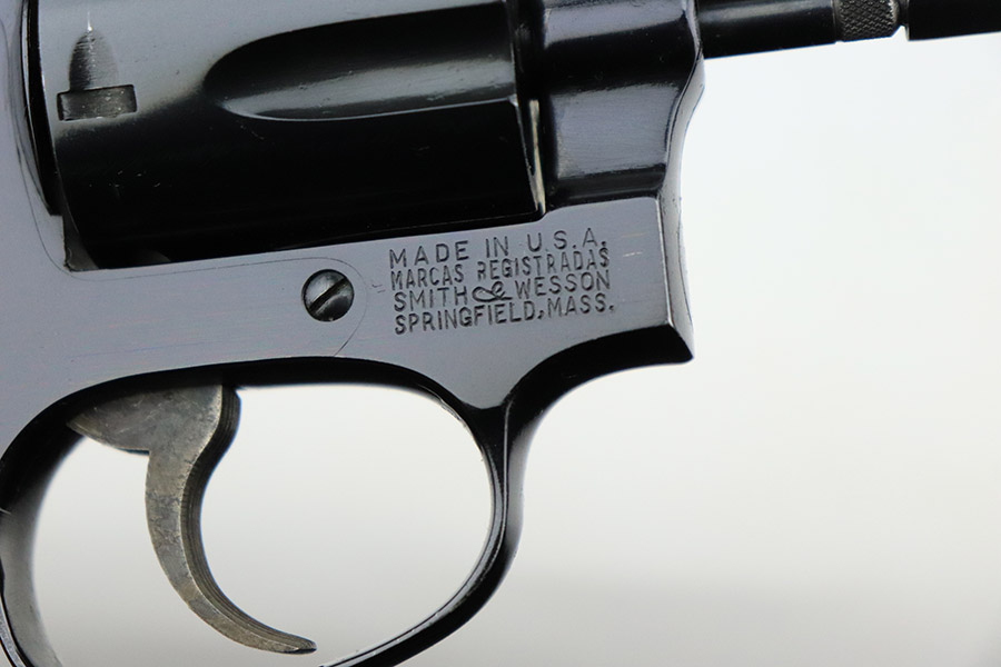 10/26/22 – This is a mint example of a Smith & Wesson Model 36 revolver, manufactured in the late 1960’s and chambered in .38 Special. 2″ barrel. The gun is in like-new condition with essentially no signs of wear or use – just the slightest hint of a roll mark on the cylinder. Excellent case-hardening on the hammer and trigger. Comes with minty hand-checkered wood grips with a matching number on the right grip panel. Mint bore. The cylinder is tight, and the action is smooth. Comes with a nice soft leather holster.