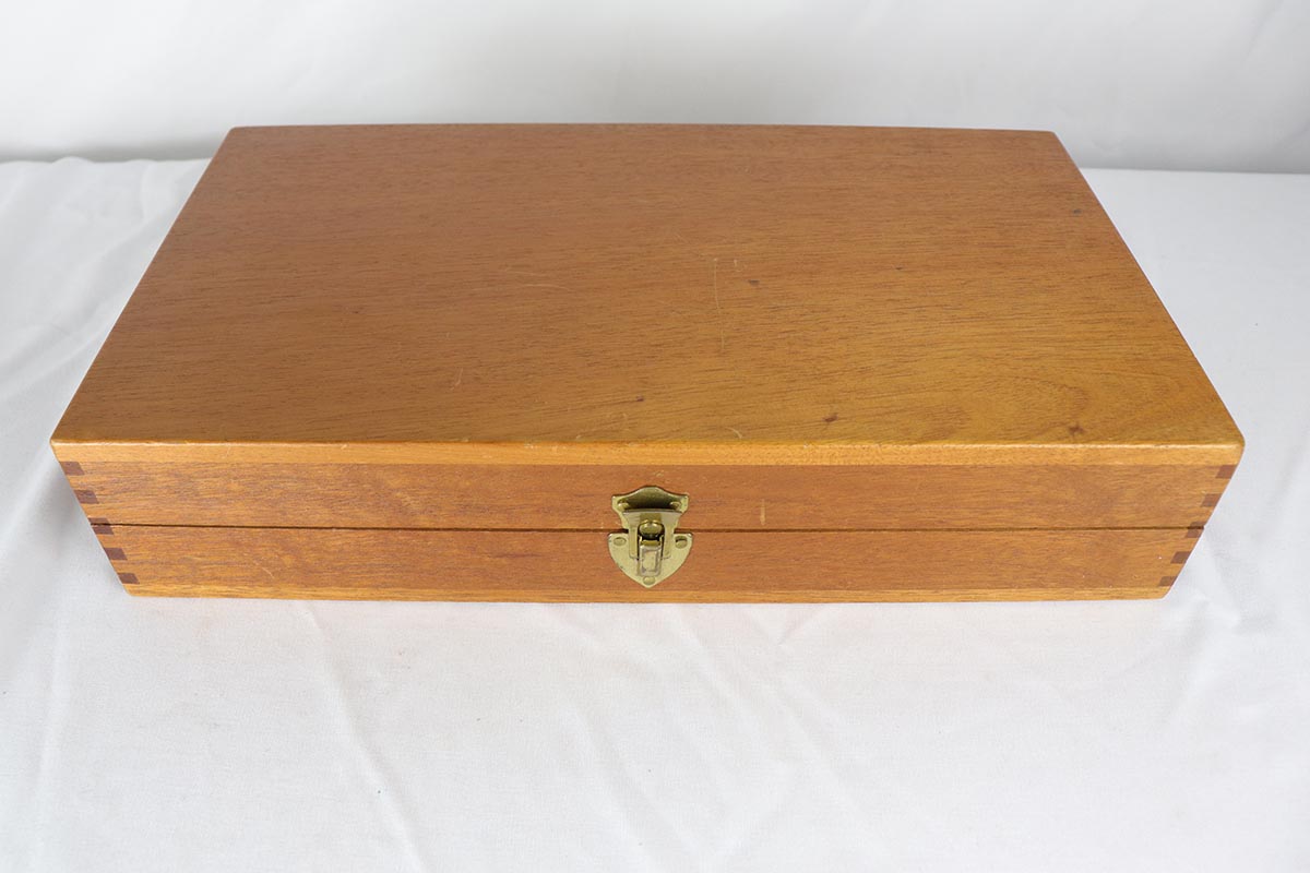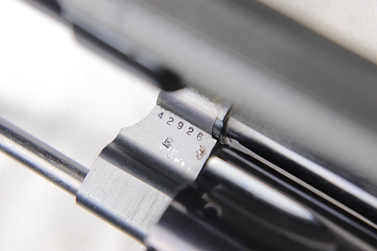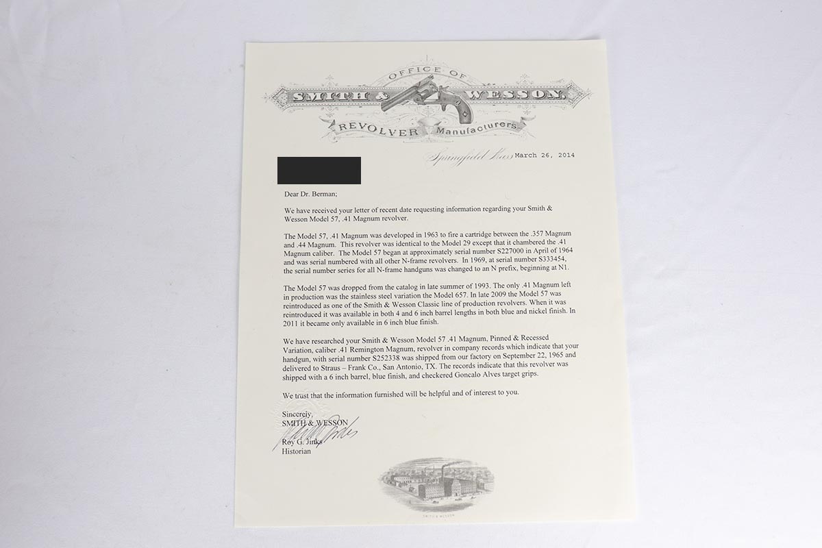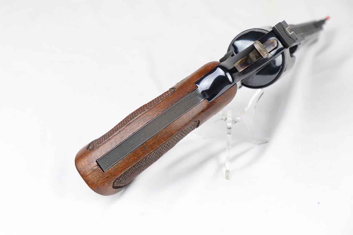 4/27/18 – This is a very early production S&W Model 57 revolver, chambered in .41 caliber, with desirable 6 inch barrel, in its original early clamshell box. The gun retains over 99% of its original blue with just a hint of a cylinder ring present. Excellent bore and mint “coke” grips. The S-prefix Model 57 guns were made in early-mid 1960s and are considered by collectors to be the best finished M57s. For a short period of time, clamshell presentation boxes, lined with velour were used, and this box is a great example. Scarce, impossible to upgrade set.