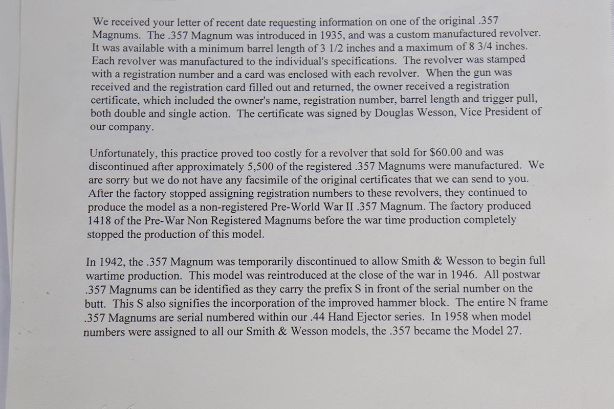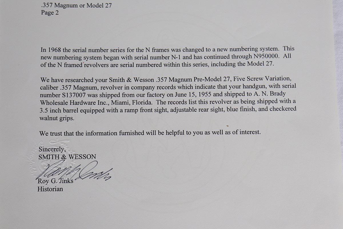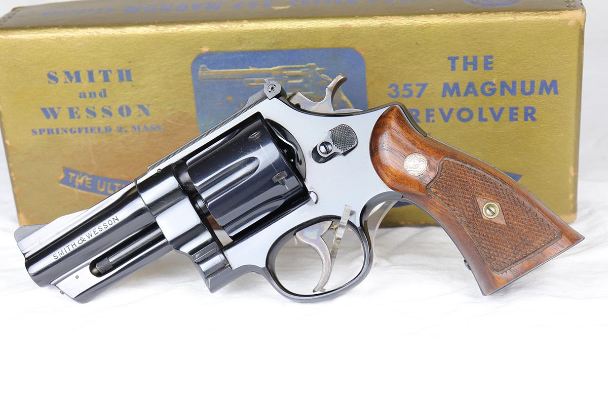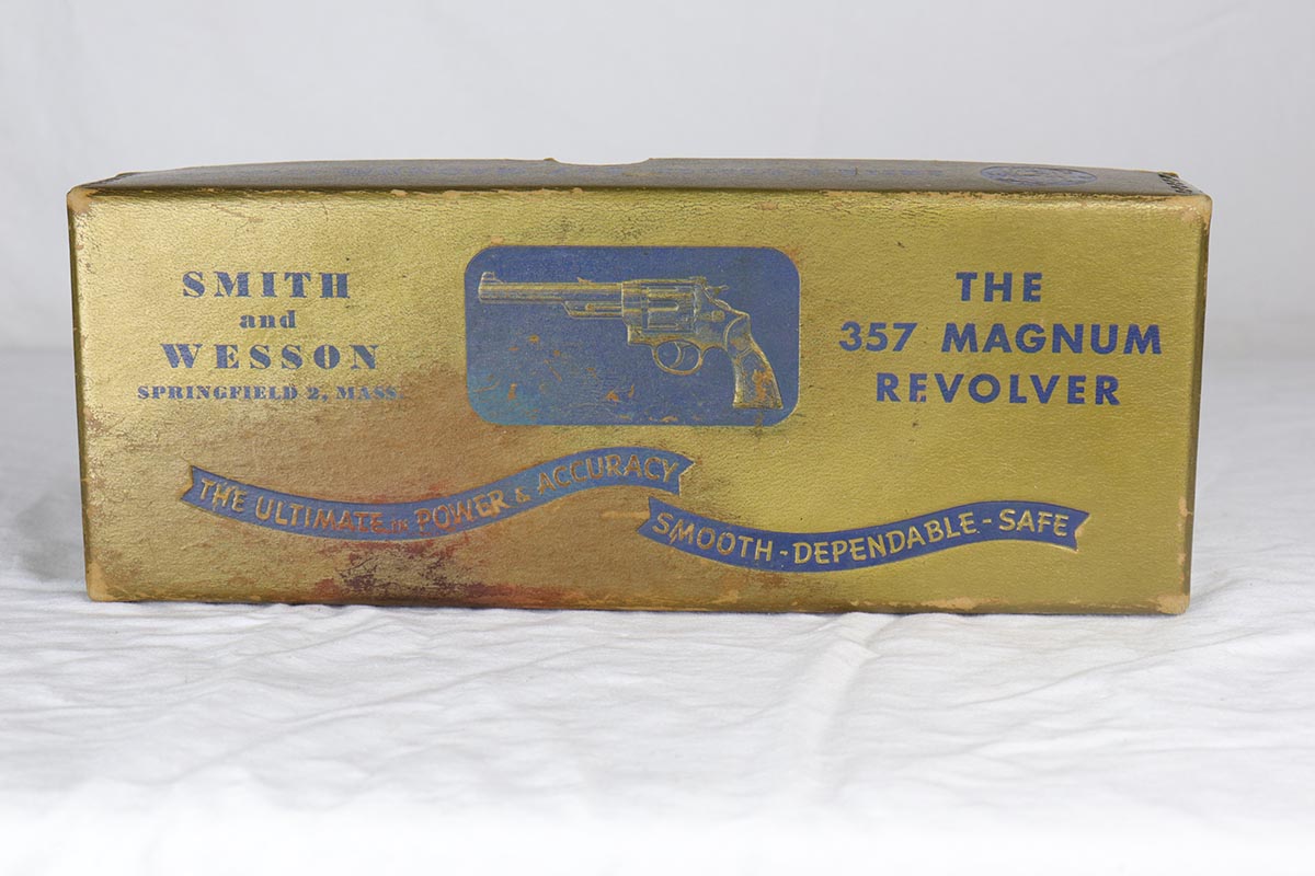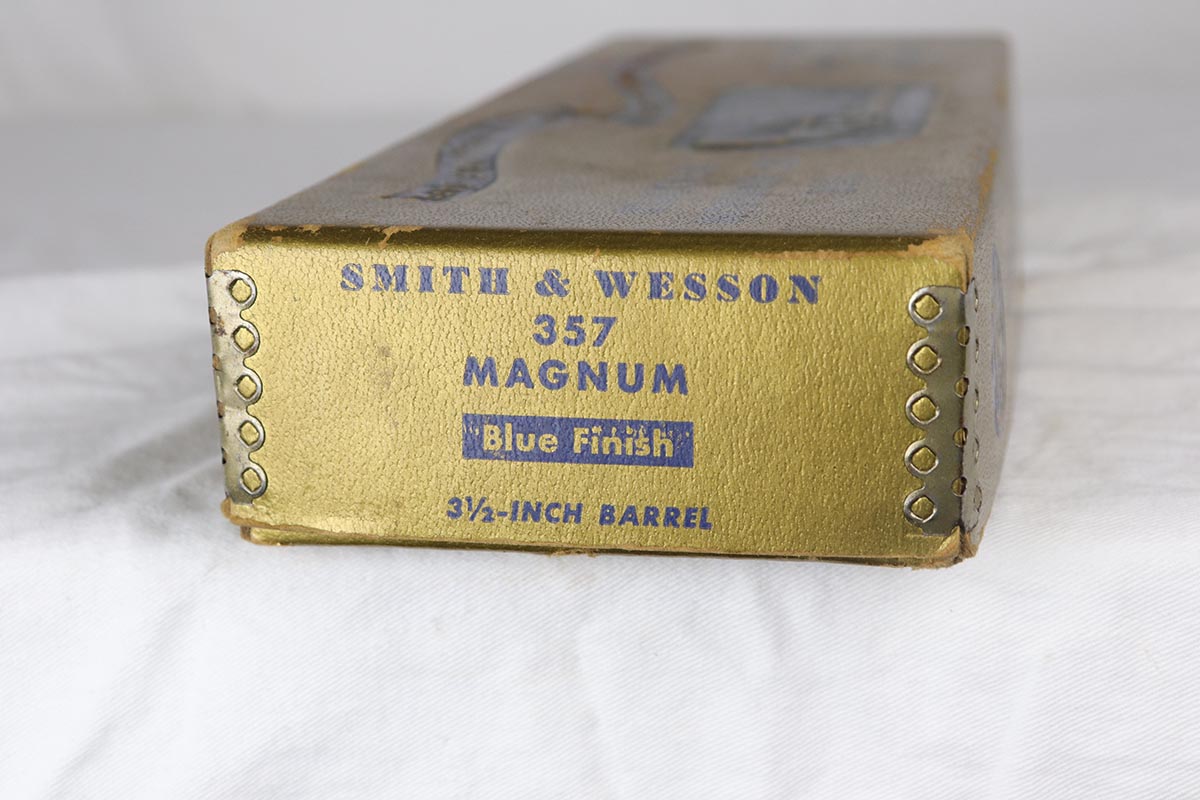 3/28/18 This is the most desirable model of Smith & Wesson post war .357 magnum revolvers – a Pre-27 Model with a 3.5 inch barrel in its original serial numbered gold box. The gun dates to around 1954 and is in near new original condition with just a light cylinder ring and no evidence of being fired more than just a few rounds after leaving the factory. It is finished in beautiful high gloss S&W blue from 1950s, that is now considered by many collectors to be the best finish S&W was able to produce to date. The metal polishing is incredible and now a long lost art. The gun has matching numbers on the barrel, cylinder, ejector star and the frame. Original box is in nice shape as well with a faint matching serial number written in grease pencil on the bottom. 3.5 inch barrel length Pre-27s were highly regarded by the law enforcement of the era and many were used by police departments, FBI and the likes. A small percentage of Pre-27s were made in this desirable barrel length. Beautiful diamond magna grips complement the gun very well and make the gun a pleasure to hold. Comes with a factory letter detailing the history of this model in general, as well as this particular revolver.