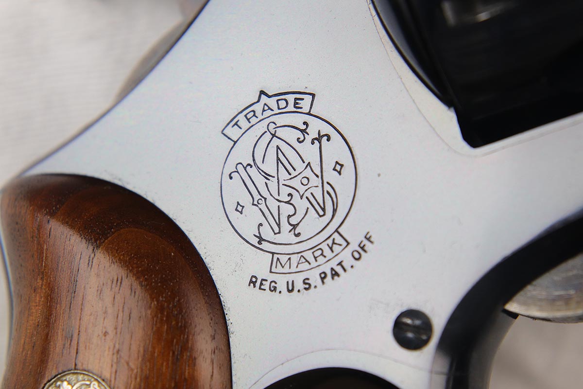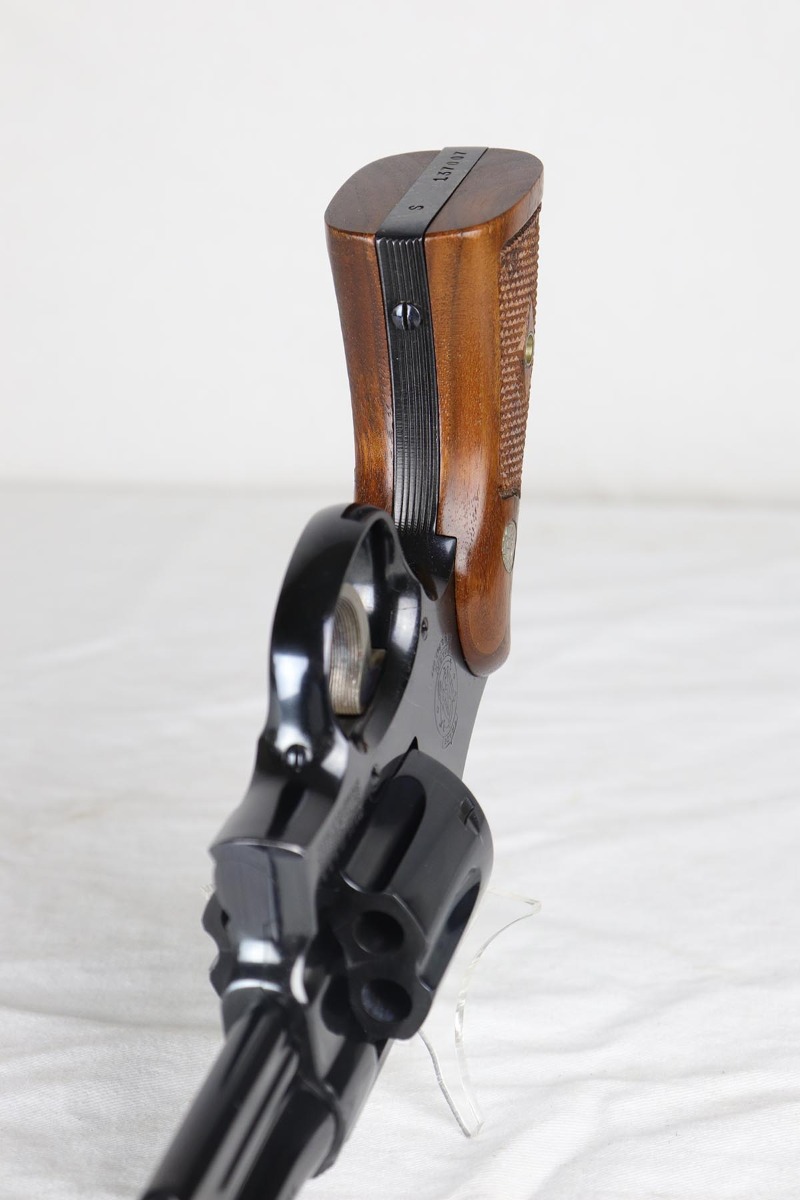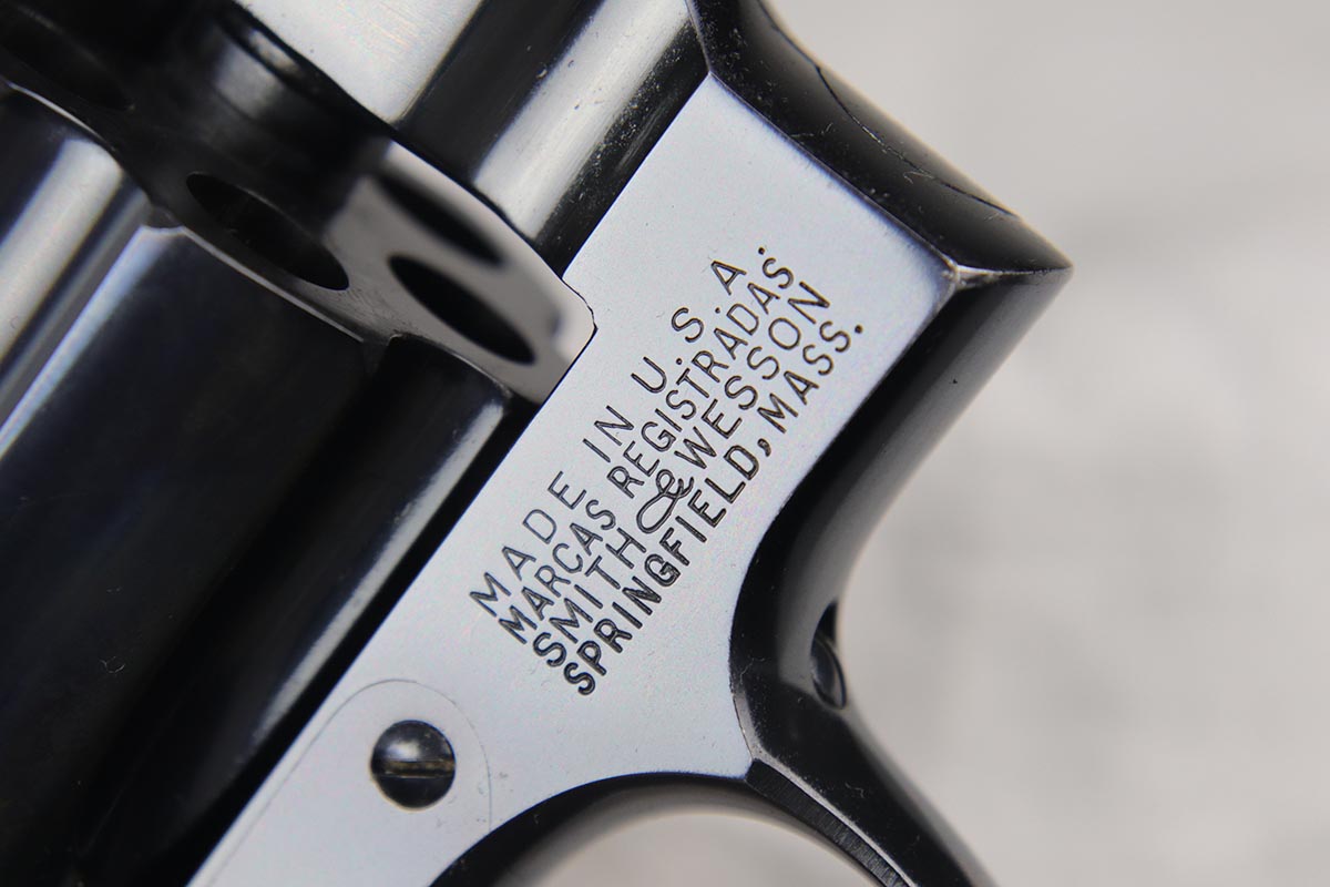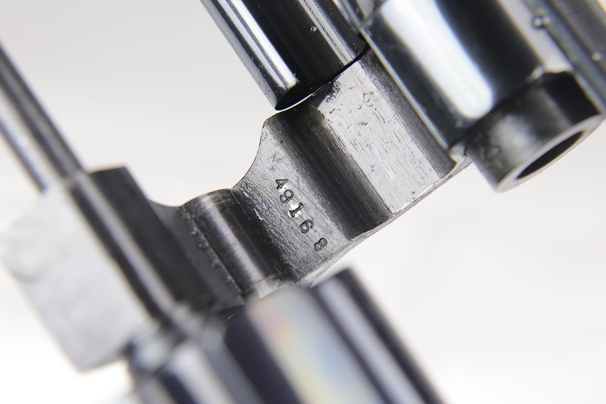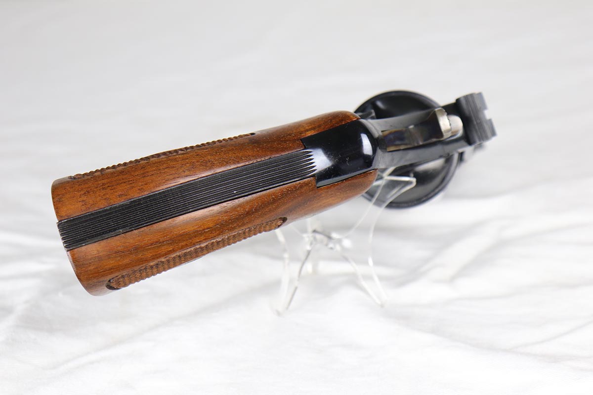 3/28/18 This is the most desirable model of Smith & Wesson post war .357 magnum revolvers – a Pre-27 Model with a 3.5 inch barrel in its original serial numbered gold box. The gun dates to around 1954 and is in near new original condition with just a light cylinder ring and no evidence of being fired more than just a few rounds after leaving the factory. It is finished in beautiful high gloss S&W blue from 1950s, that is now considered by many collectors to be the best finish S&W was able to produce to date. The metal polishing is incredible and now a long lost art. The gun has matching numbers on the barrel, cylinder, ejector star and the frame. Original box is in nice shape as well with a faint matching serial number written in grease pencil on the bottom. 3.5 inch barrel length Pre-27s were highly regarded by the law enforcement of the era and many were used by police departments, FBI and the likes. A small percentage of Pre-27s were made in this desirable barrel length. Beautiful diamond magna grips complement the gun very well and make the gun a pleasure to hold. Comes with a factory letter detailing the history of this model in general, as well as this particular revolver.