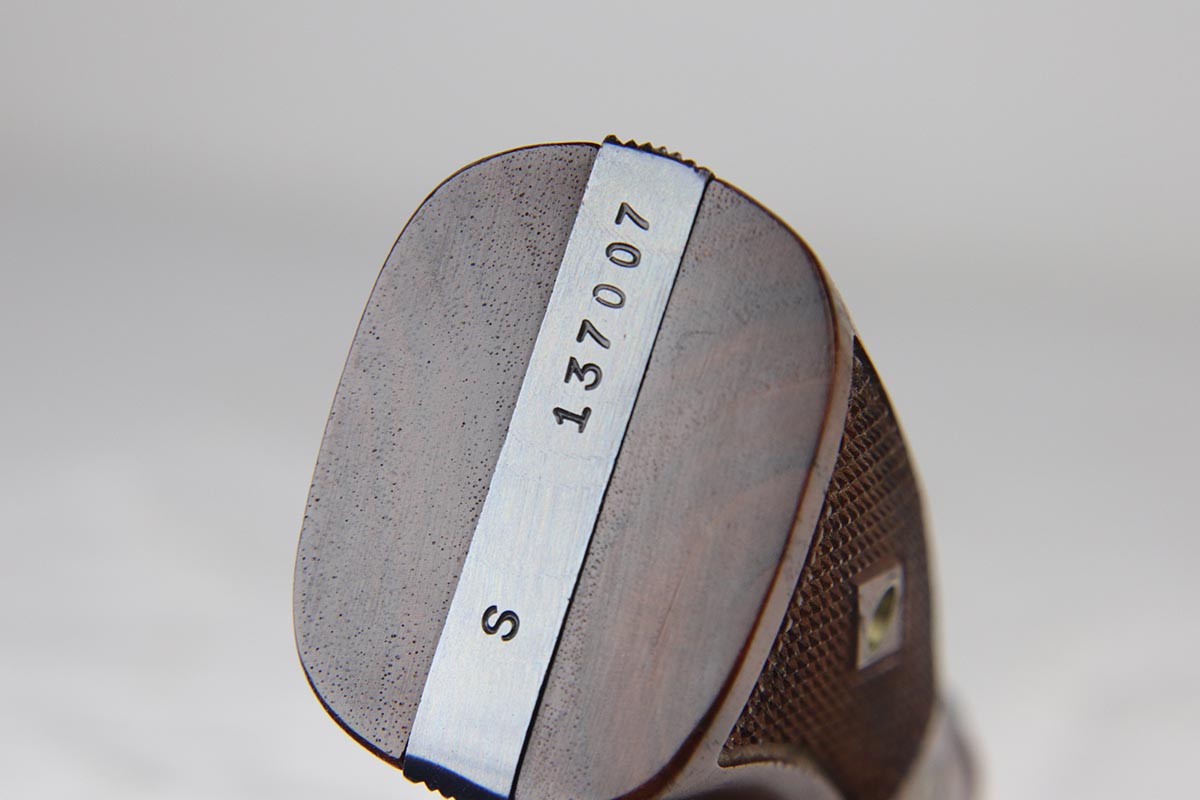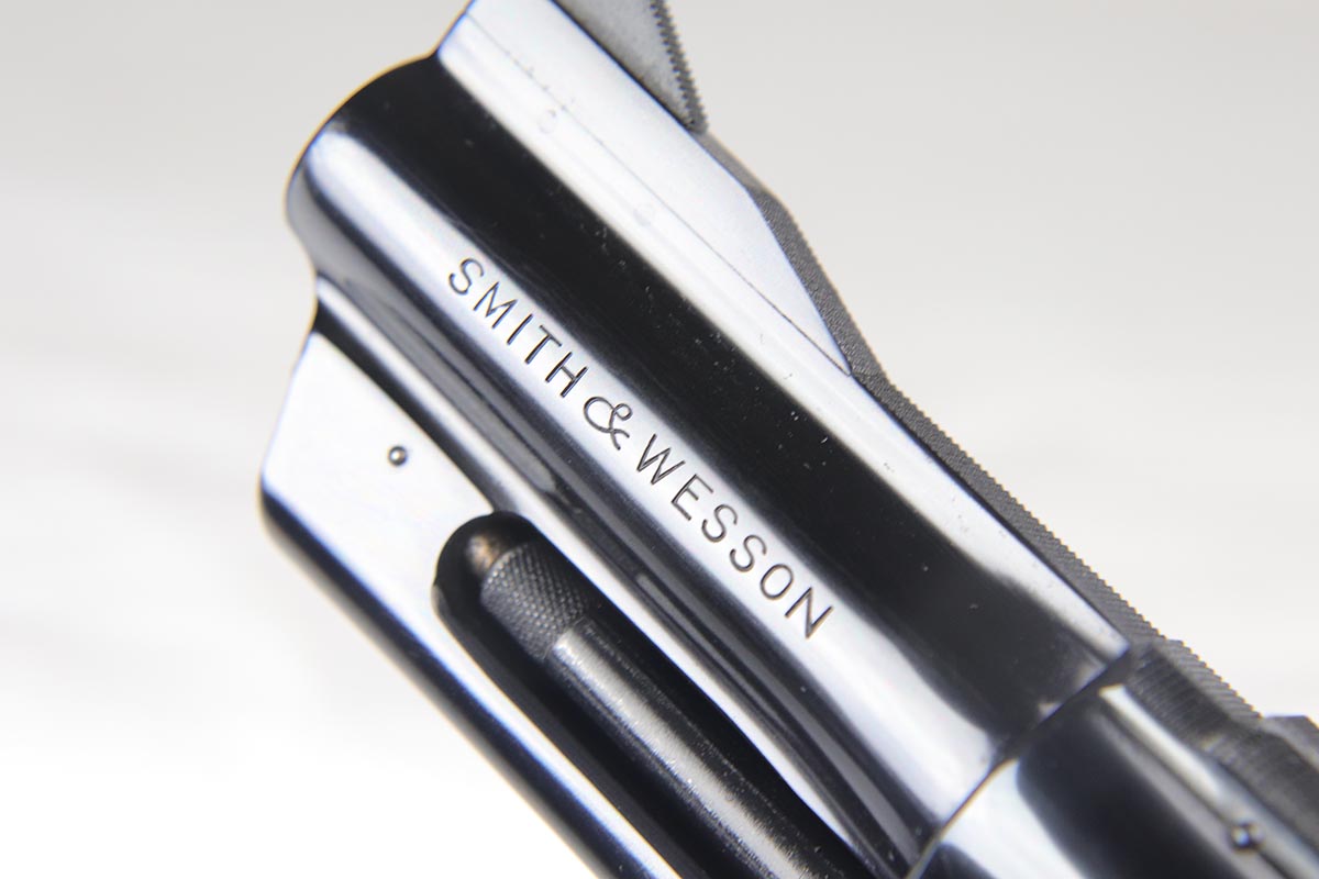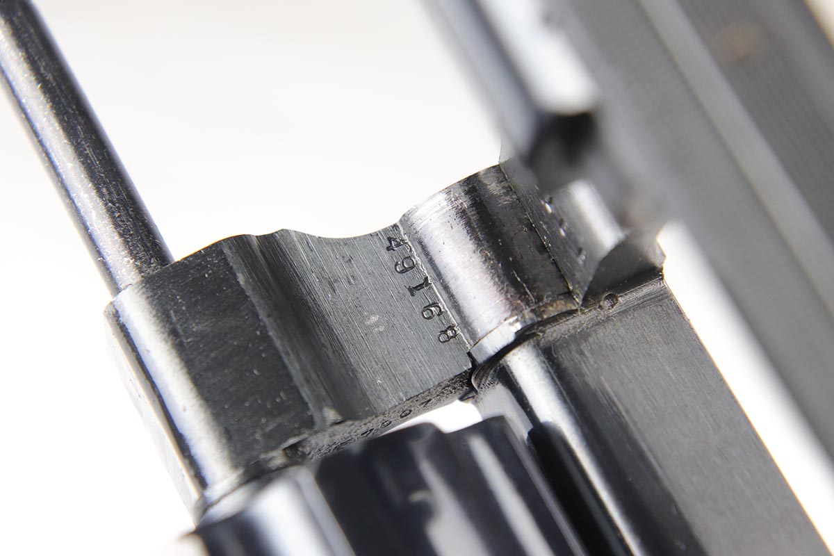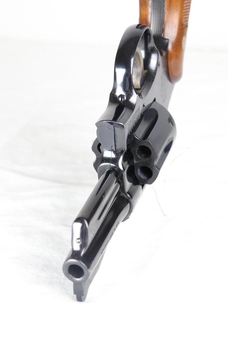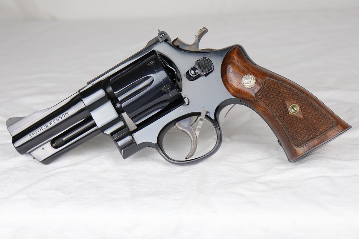 3/28/18 This is the most desirable model of Smith & Wesson post war .357 magnum revolvers – a Pre-27 Model with a 3.5 inch barrel in its original serial numbered gold box. The gun dates to around 1954 and is in near new original condition with just a light cylinder ring and no evidence of being fired more than just a few rounds after leaving the factory. It is finished in beautiful high gloss S&W blue from 1950s, that is now considered by many collectors to be the best finish S&W was able to produce to date. The metal polishing is incredible and now a long lost art. The gun has matching numbers on the barrel, cylinder, ejector star and the frame. Original box is in nice shape as well with a faint matching serial number written in grease pencil on the bottom. 3.5 inch barrel length Pre-27s were highly regarded by the law enforcement of the era and many were used by police departments, FBI and the likes. A small percentage of Pre-27s were made in this desirable barrel length. Beautiful diamond magna grips complement the gun very well and make the gun a pleasure to hold. Comes with a factory letter detailing the history of this model in general, as well as this particular revolver.