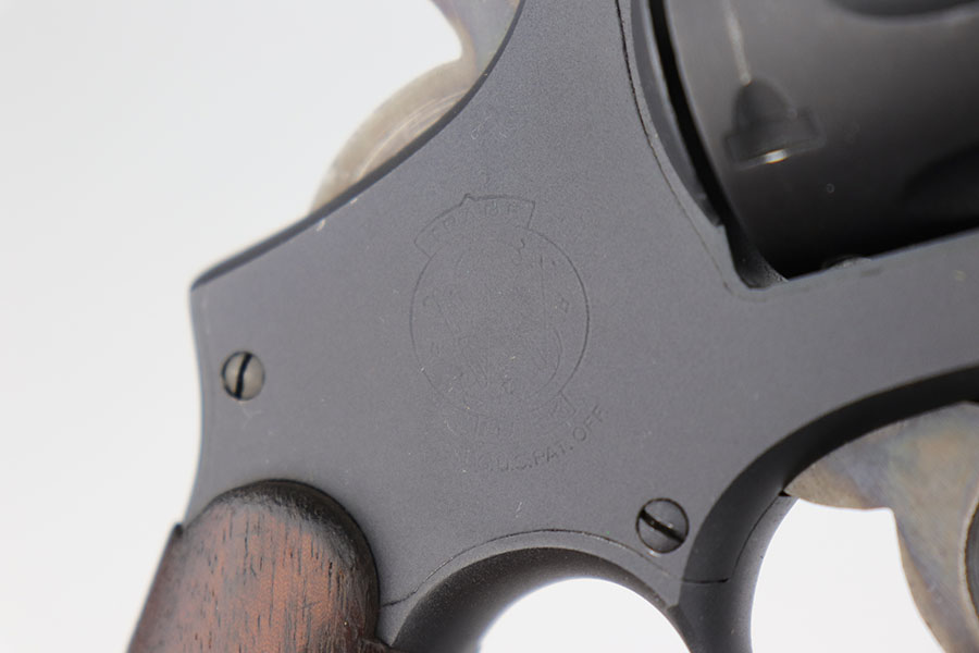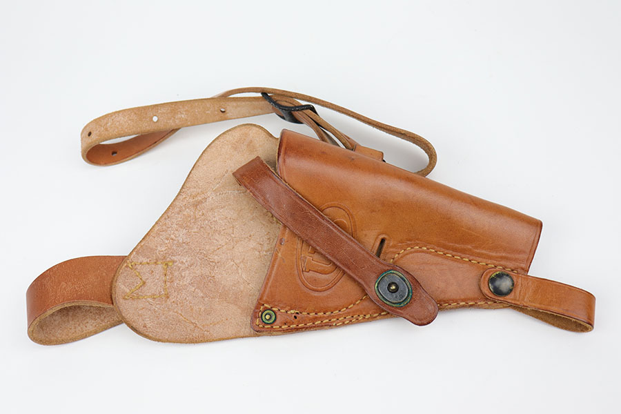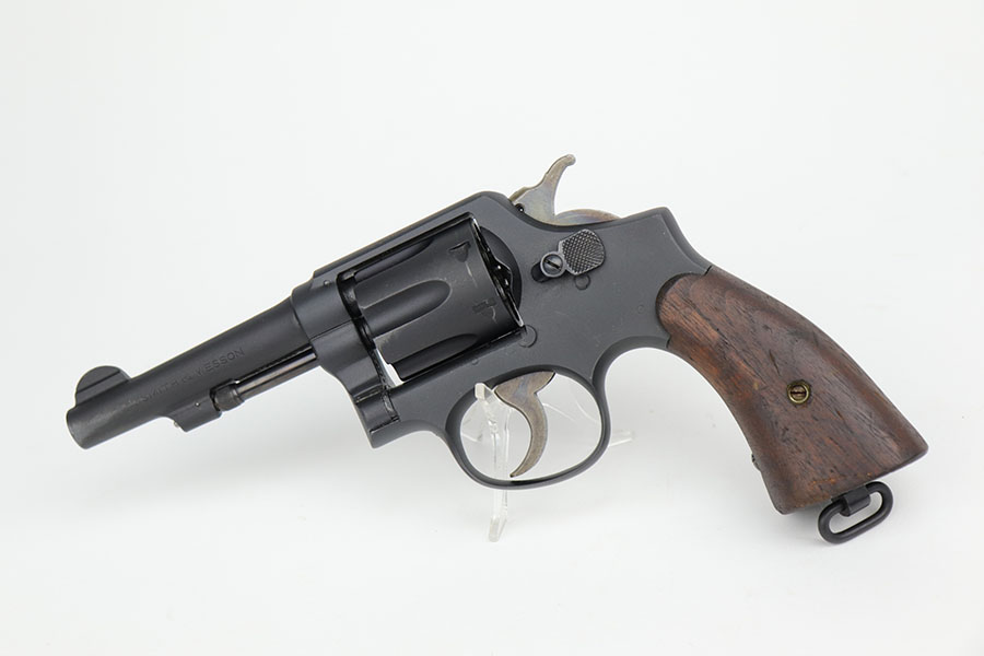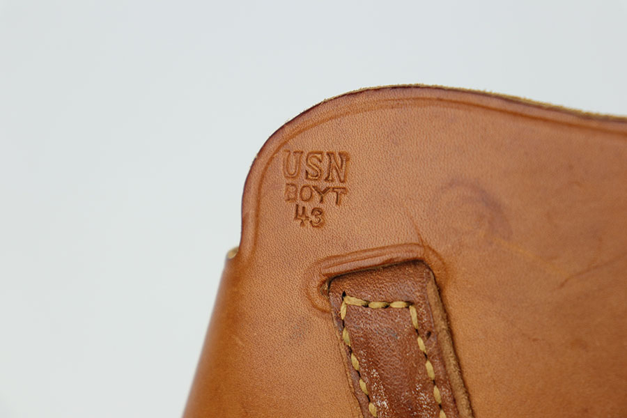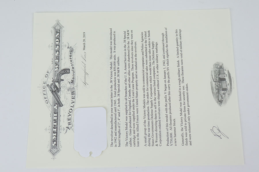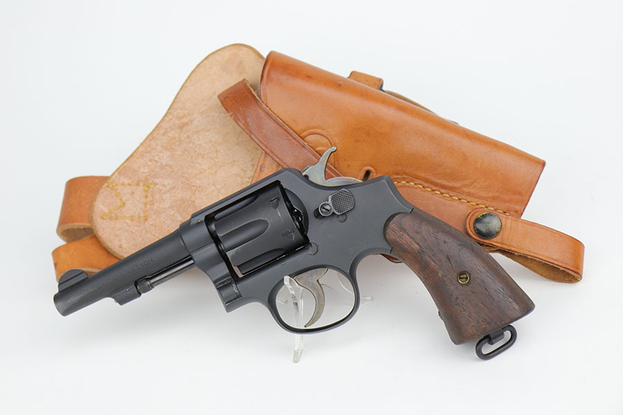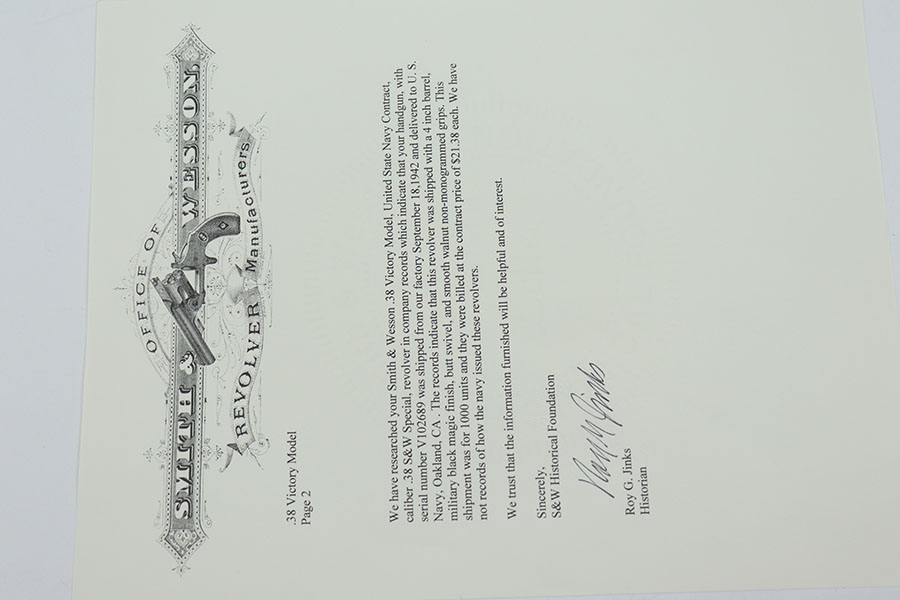9/16/20 – This is a Smith & Wesson Victory model revolver and holster in mint condition, with S&W factory letter. The gun appears virtually unused, just a hint of a roll mark and maybe a slight hint of muzzle wear. Mint bore and excellent grips. Nice case hardening on hammer and trigger. The factory letter confirms this was a Navy contract gun that was shipped in September of 1942. The shoulder holster is minty with sharp USN marking on the back and ’43 date.