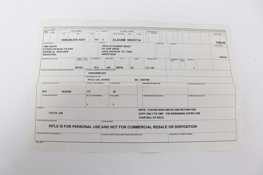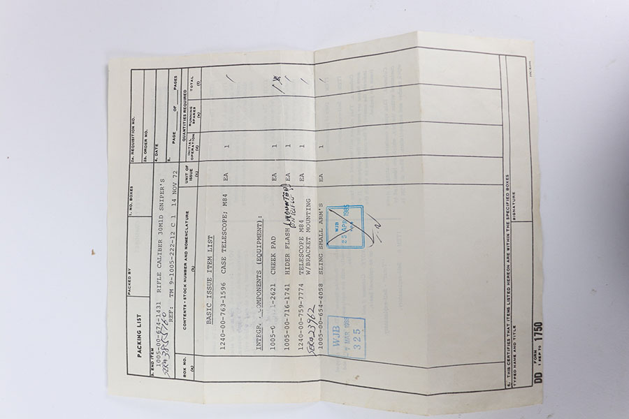 1/15/21 – This is a mint Springfield Armory M1D Sniper rifle in the original CMP shipping box, with all the extras and CMP paperwork. The receiver serial dates to 1945, with 1952 barrel date. The finish is minty with only a couple minor scuffs on the barrel. Mint bore, looks unfired. Original M84 scope is present, and mounts are on rifle receiver. Stock has circle P on wrist. Muzzle has a five prong flash hider on it. The box also includes the cheek pad, flash hider, strap, pouch, and cleaning kit. All in the original shipping pouches from the CMP.
